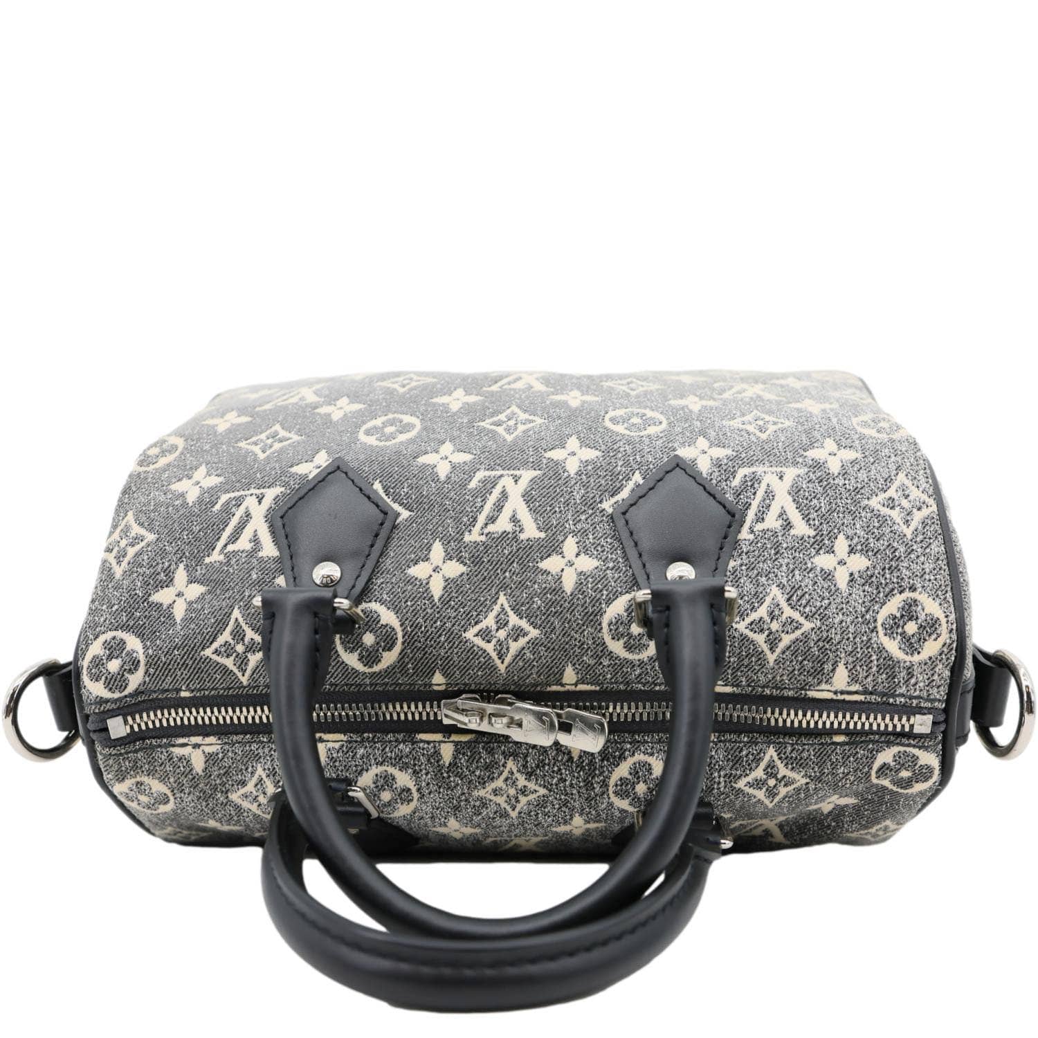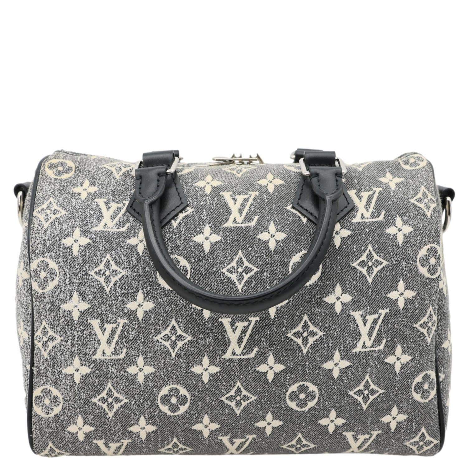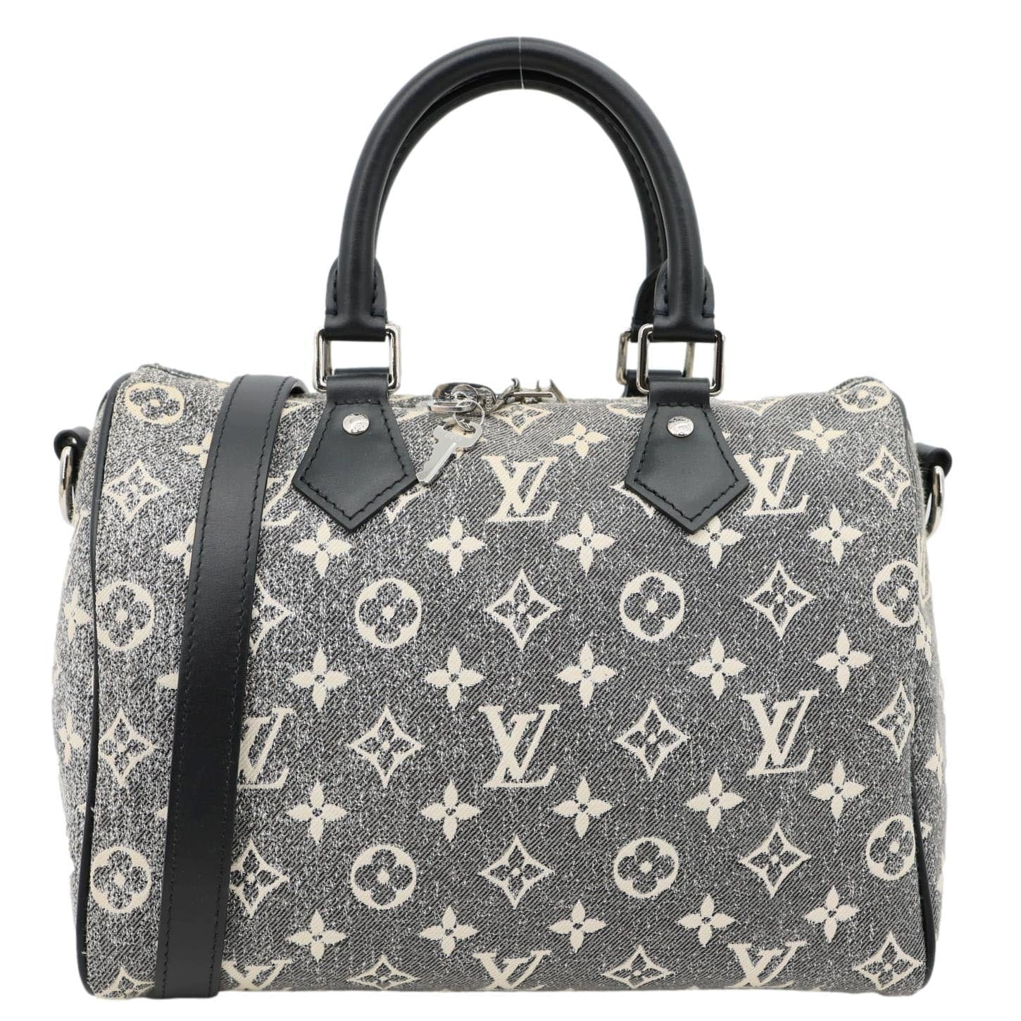 LOUIS VUITTON Speedy 25 Bandoulière crafted in Monogram jacquard denim with a stylish grey finish. Iconic silhouette with top handles and a detachable strap, offering versatile everyday wear with a modern edge.
