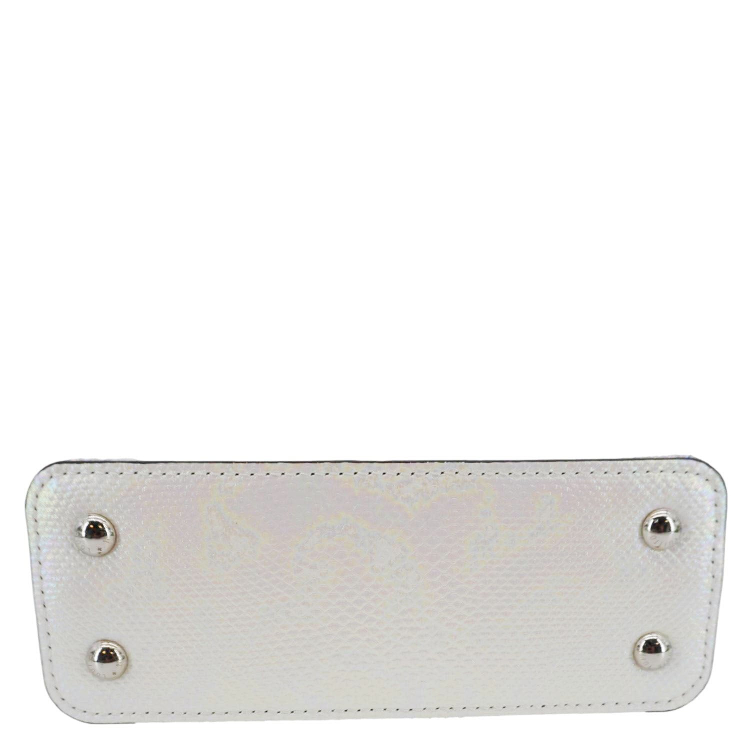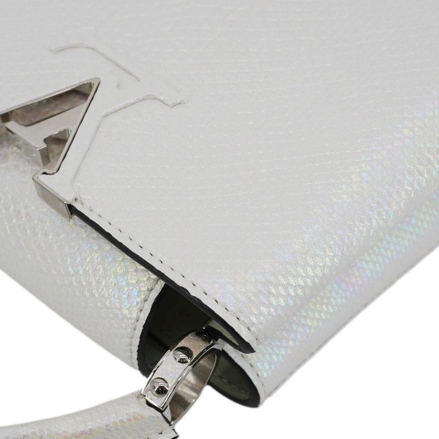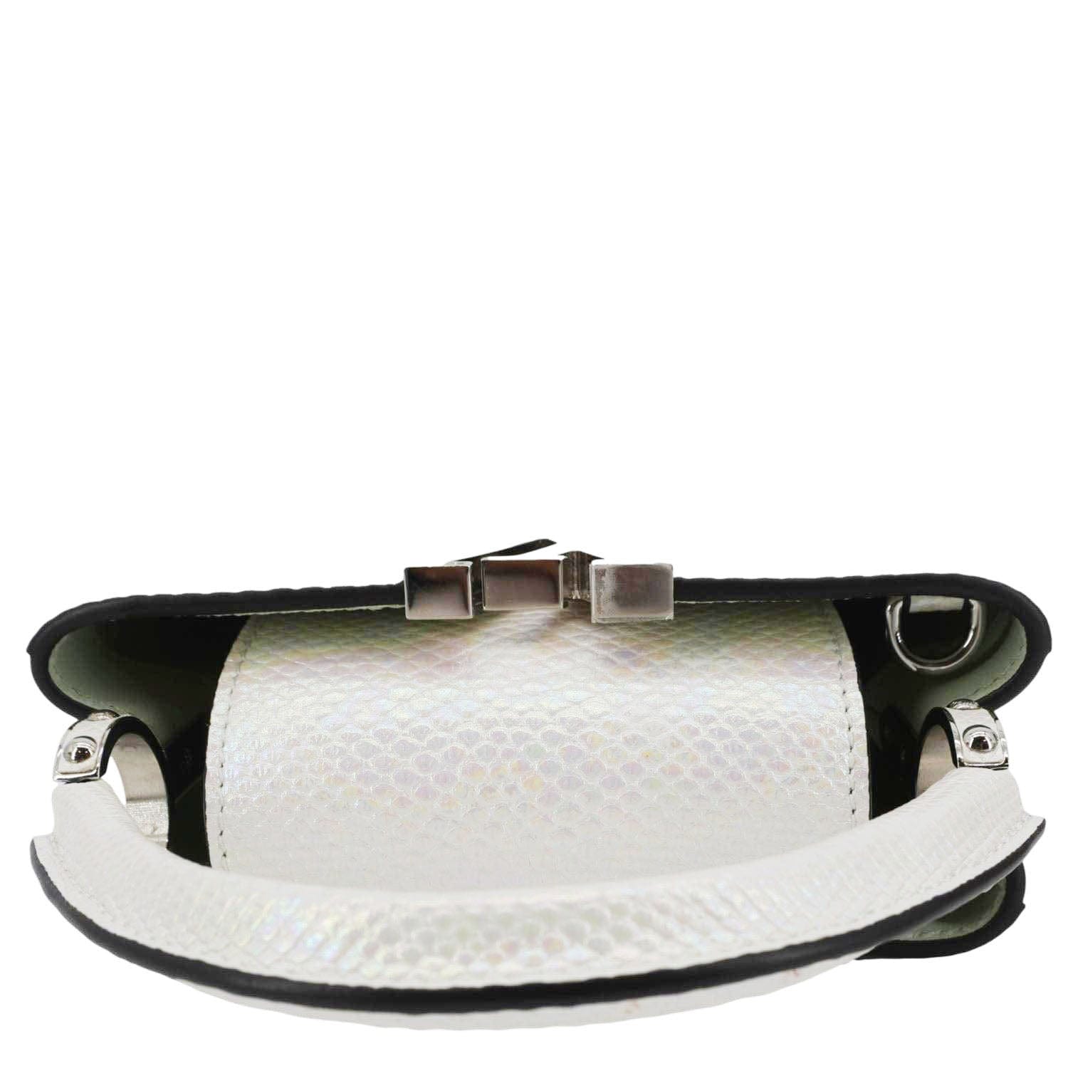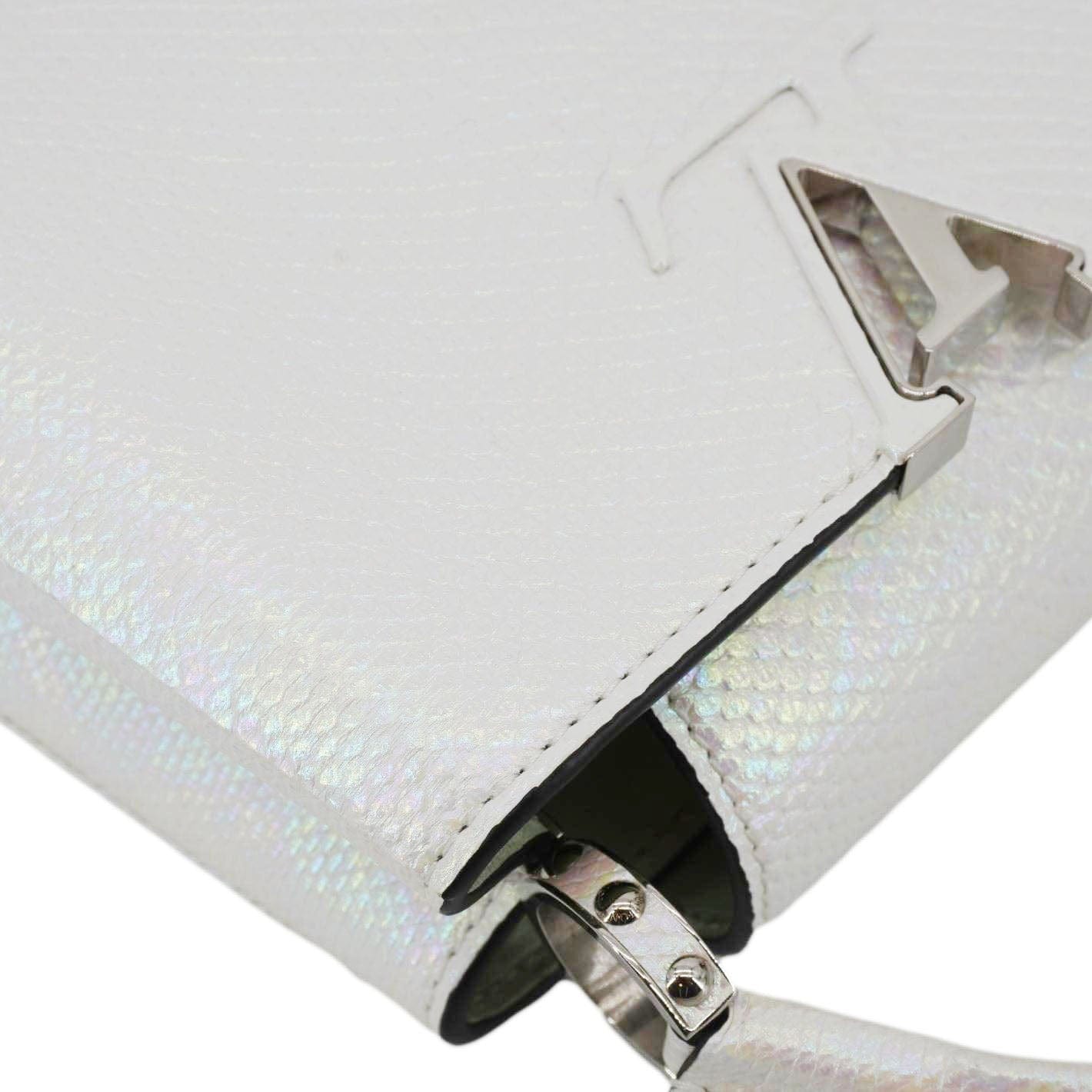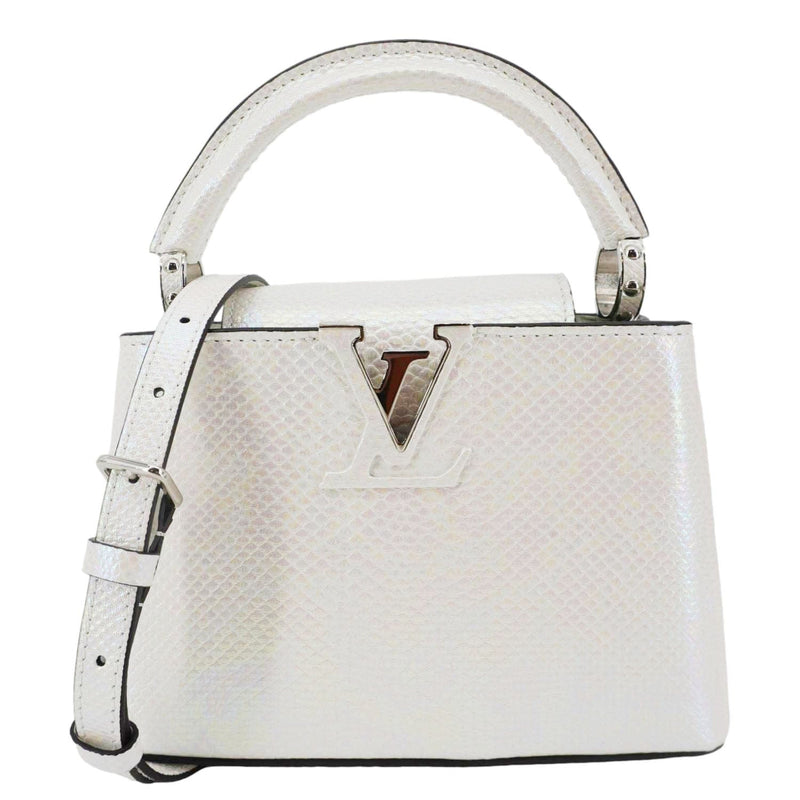 The LOUIS VUITTON Capucines Mini Karung Leather Shoulder Bag in white showcases exquisite craftsmanship with its luxurious karung leather and signature LV monogram closure. Compact and elegant, it's perfect for a sophisticated, on-the-go style.