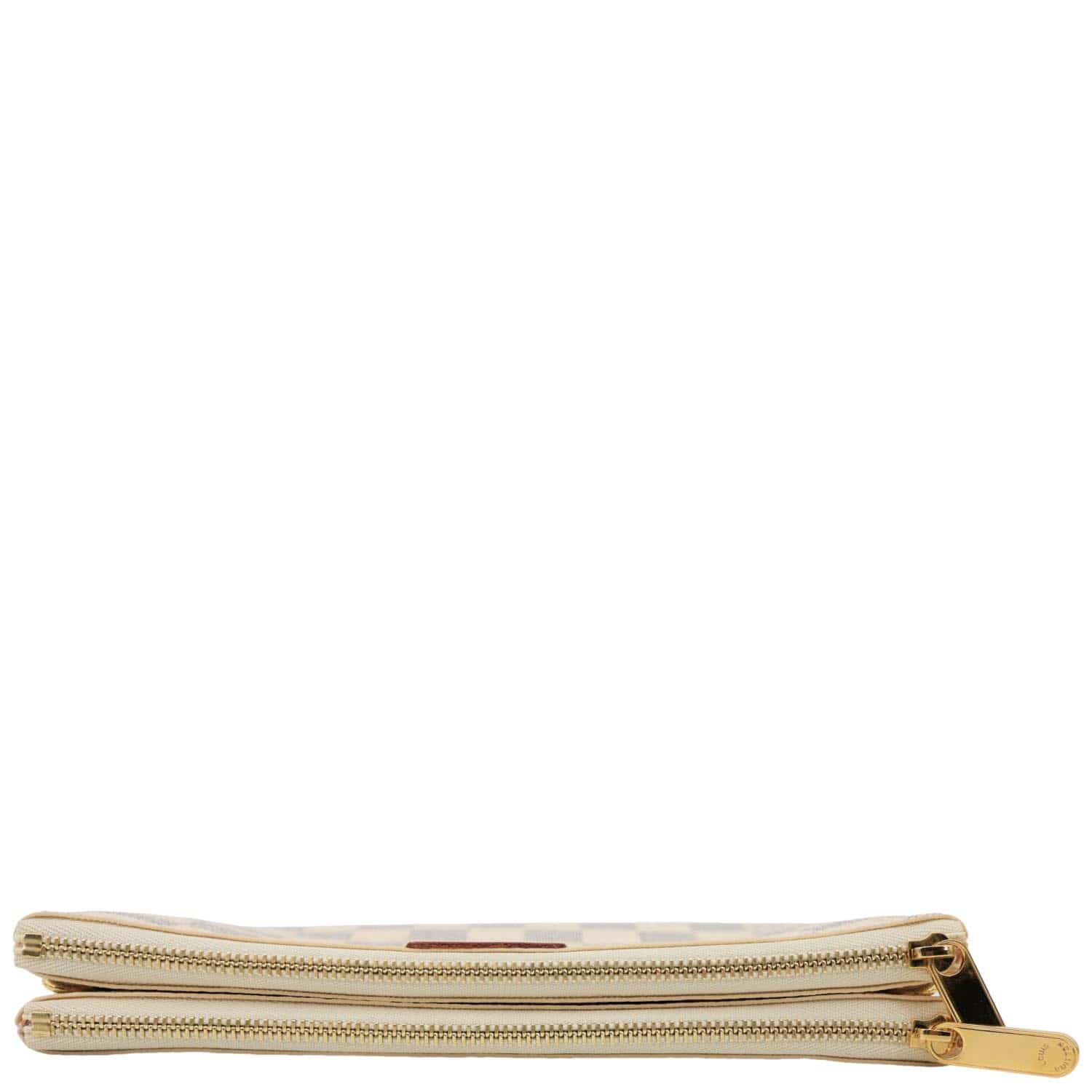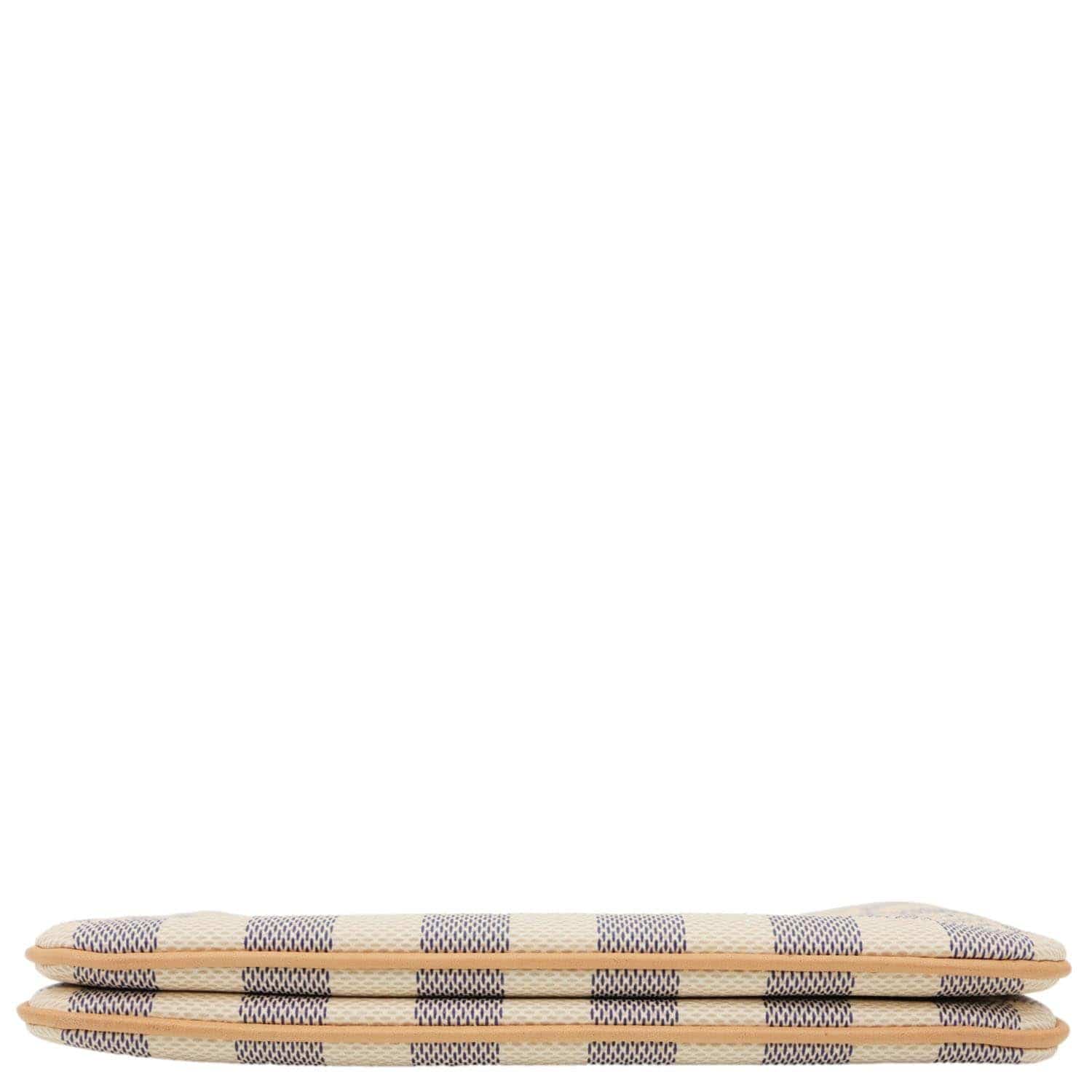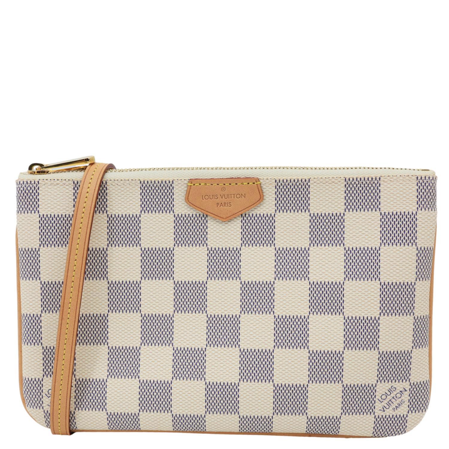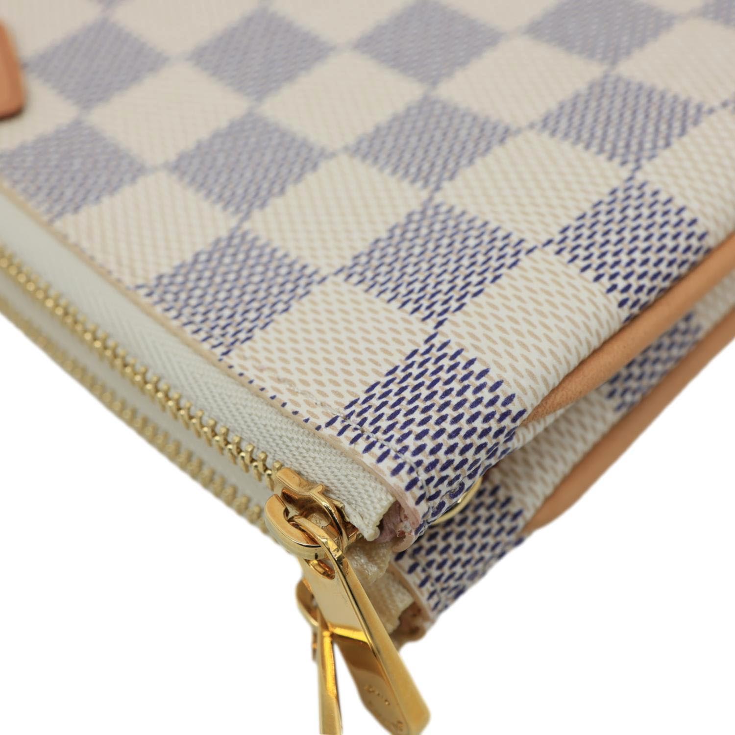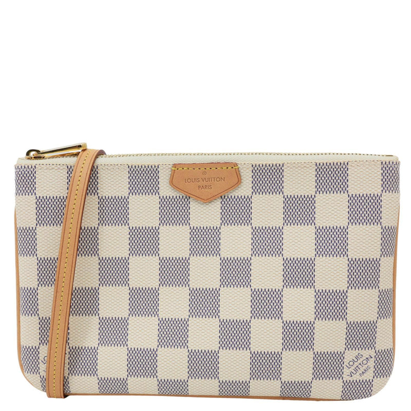 Elegant Louis Vuitton Double Zip Pochette crafted in Damier Azur canvas with Rose Ballerine accents. A sleek crossbody bag featuring dual compartments, perfect for organized everyday carry.