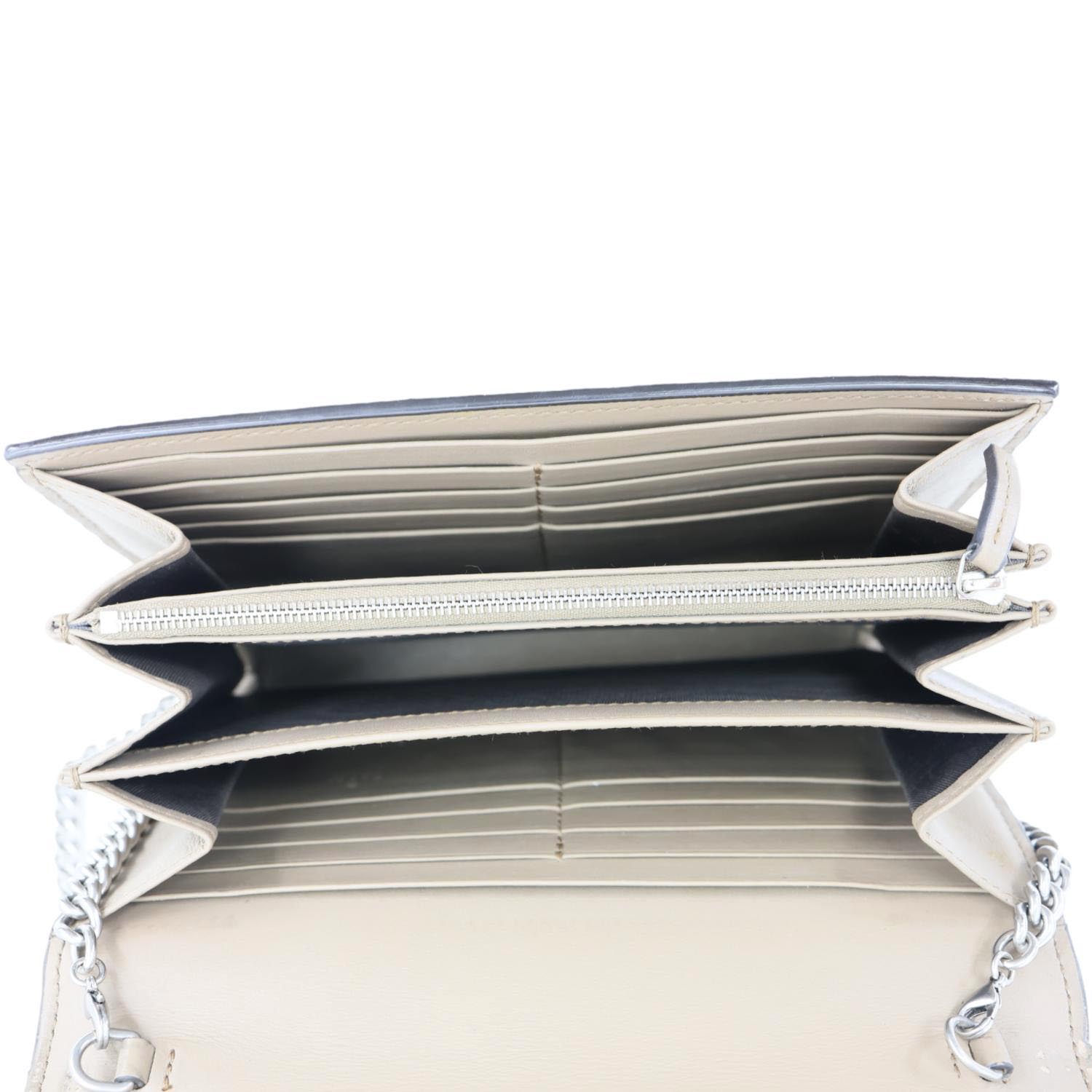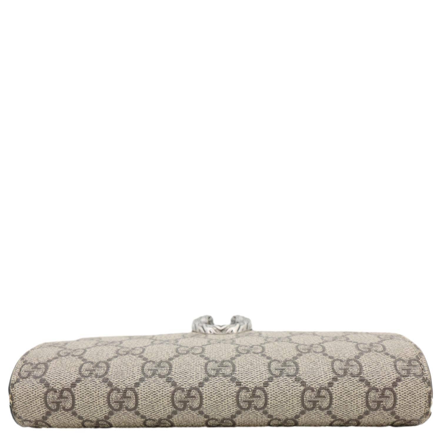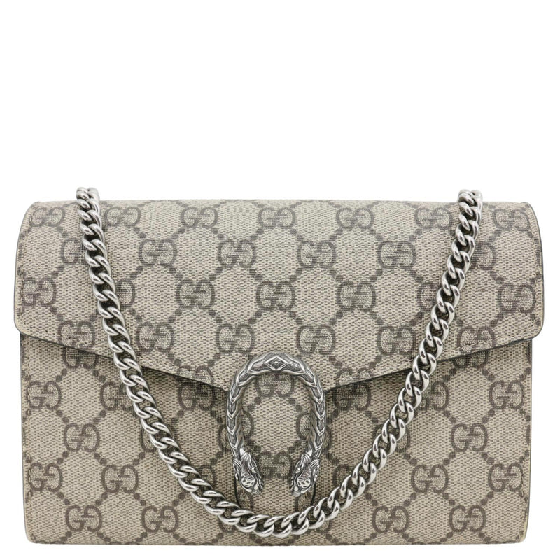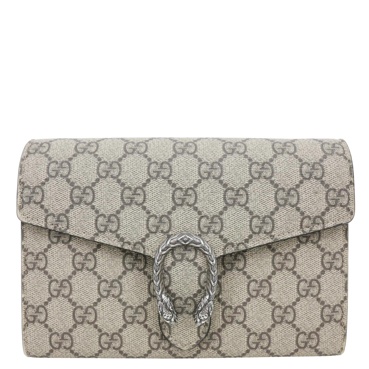 GUCCI Dionysus Chain Wallet in Beige features GG Supreme canvas with the signature crystal-engraved tiger head closure. Compact and versatile, it works as a wallet or crossbody for chic everyday style.