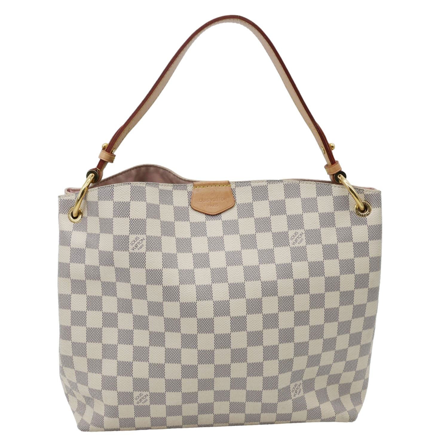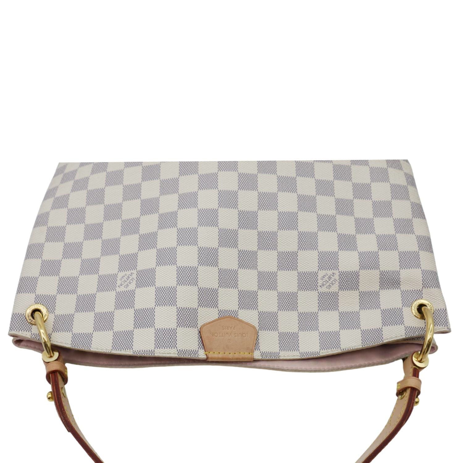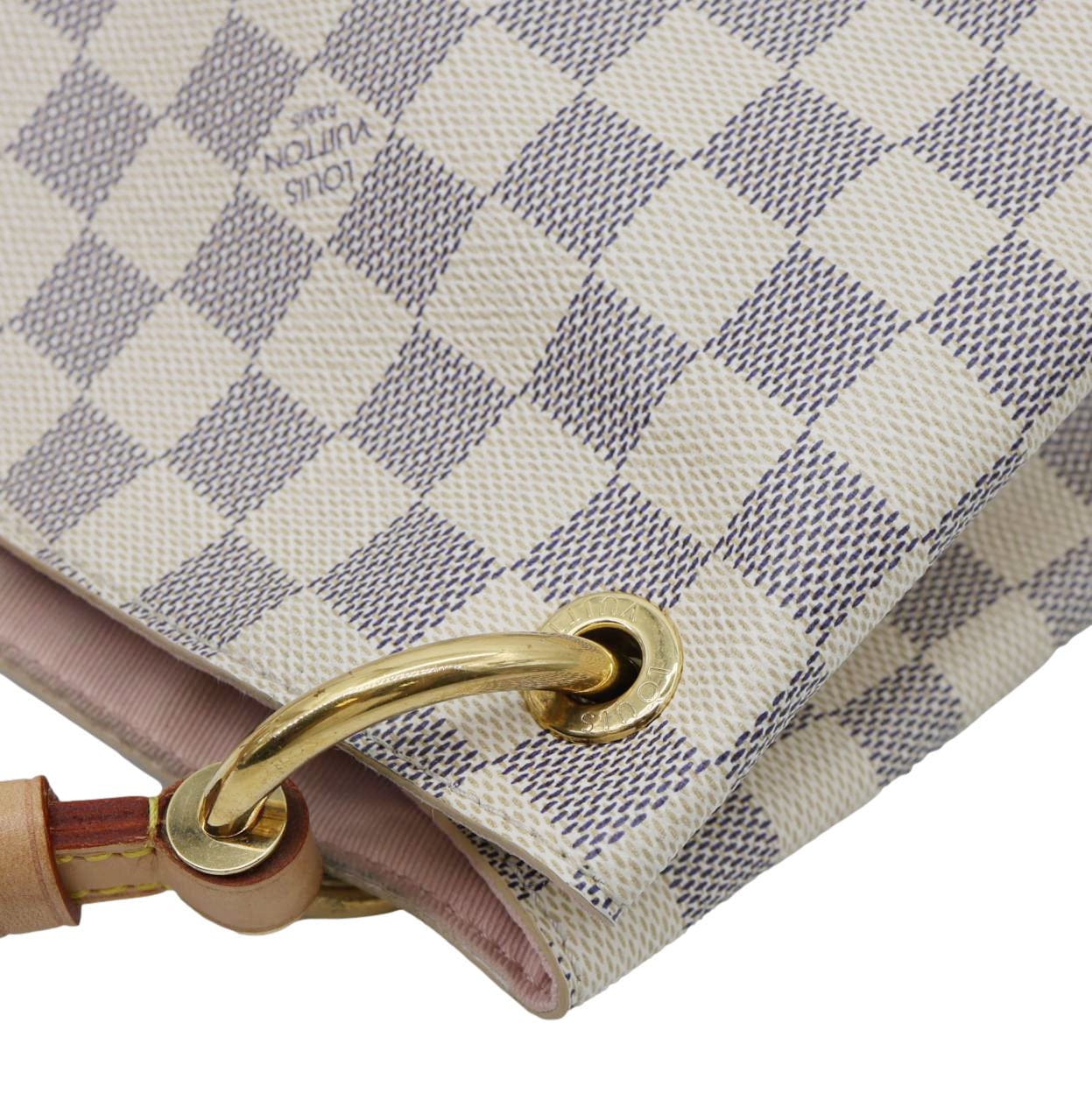 LOUIS VUITTON Graceful PM Damier Azur Tote Bag in Rose Ballerine, crafted from signature coated canvas with natural cowhide trim. Lightweight and elegant, perfect for everyday sophistication.
