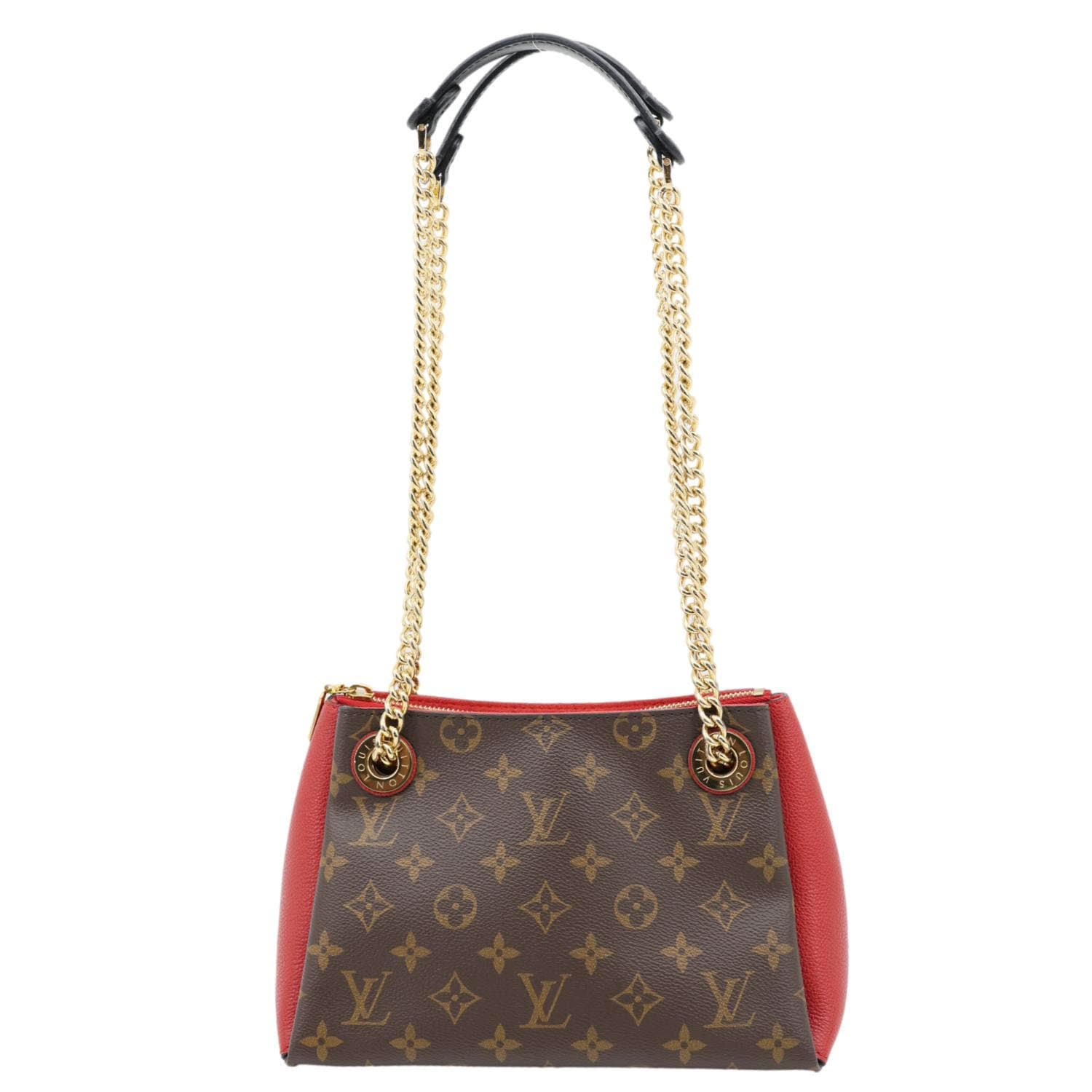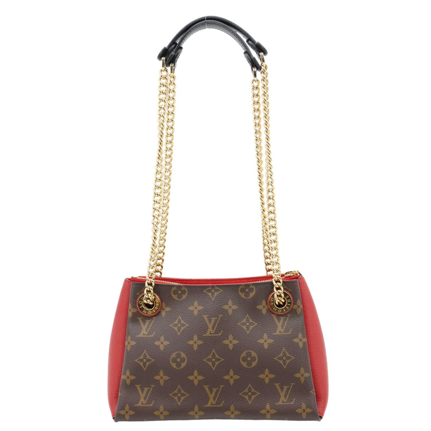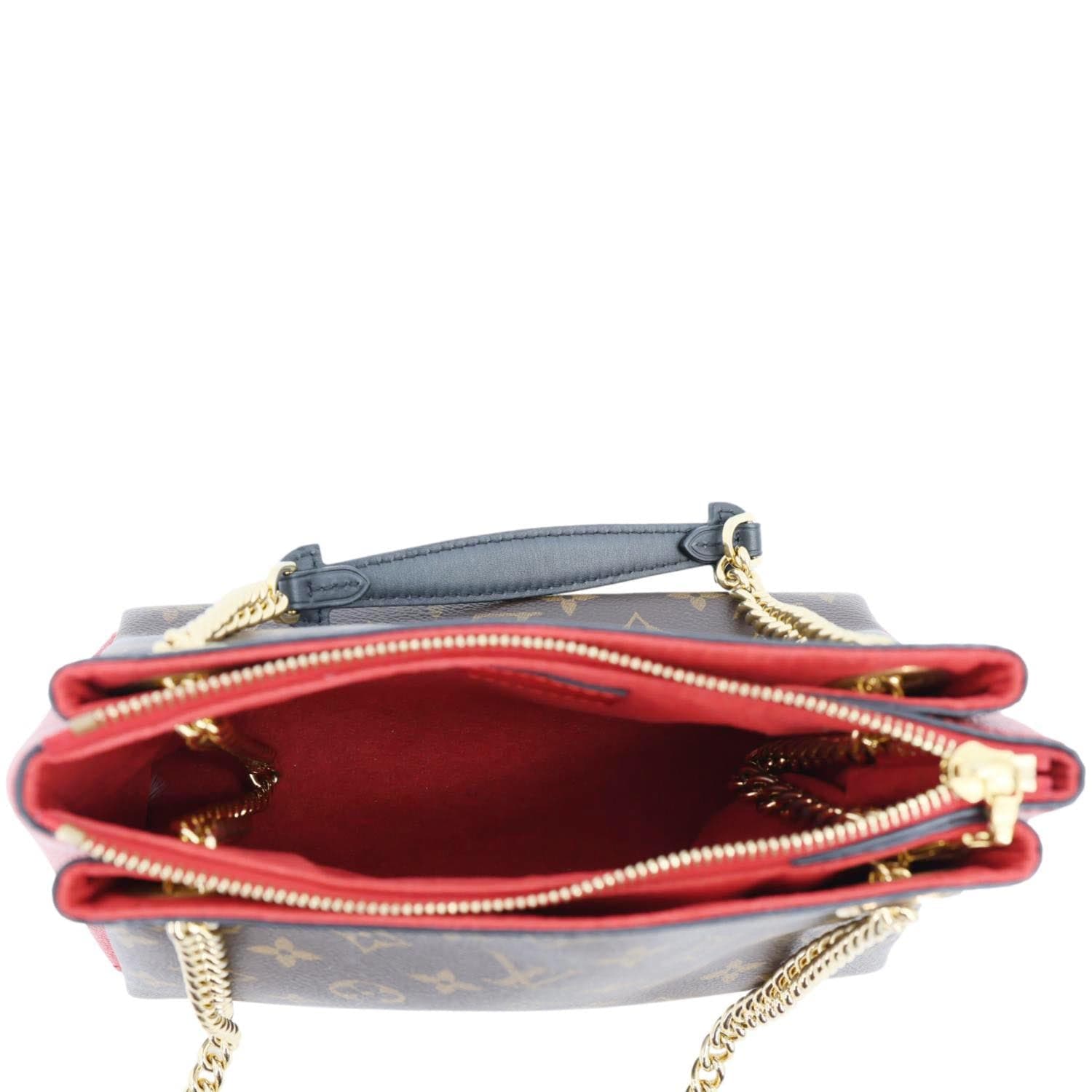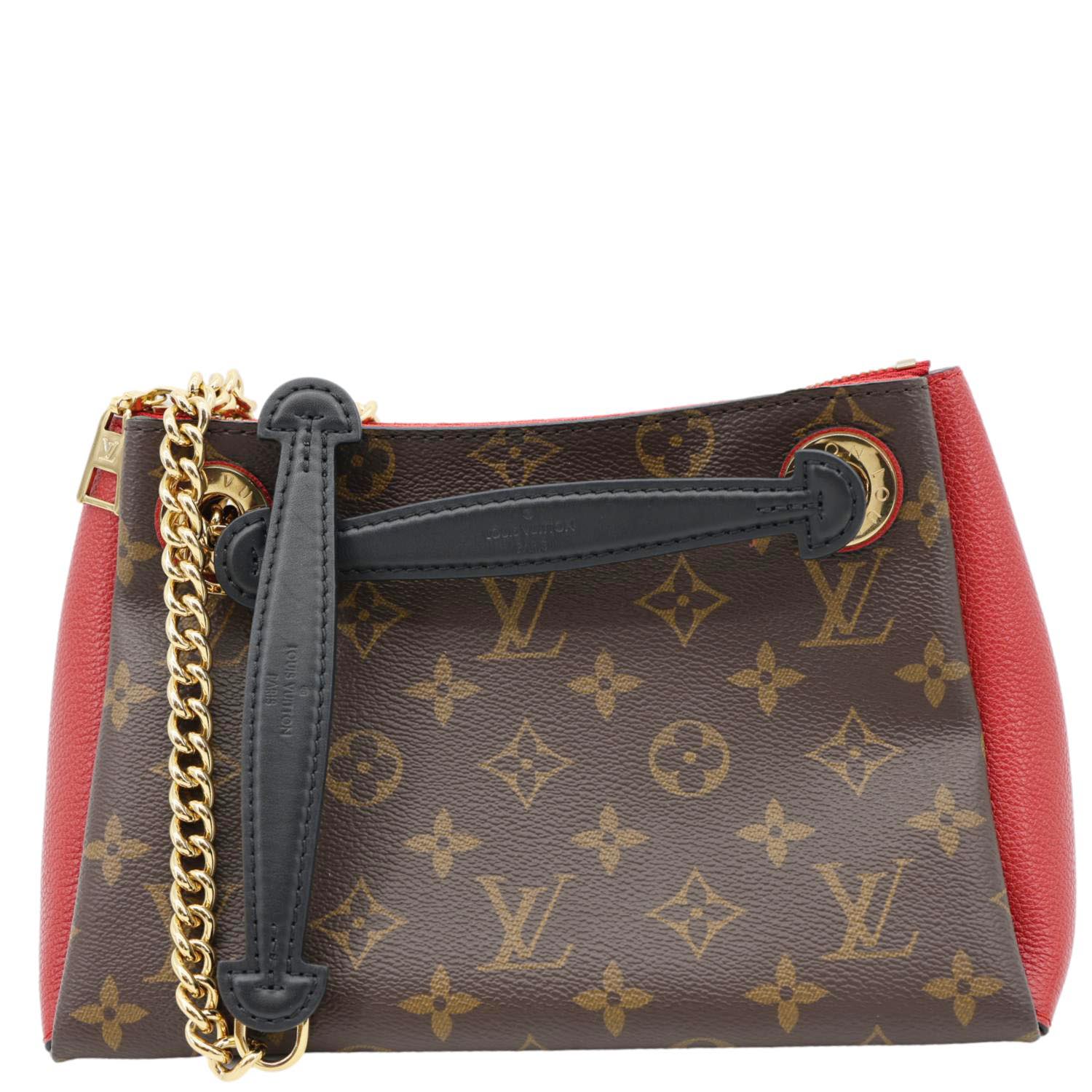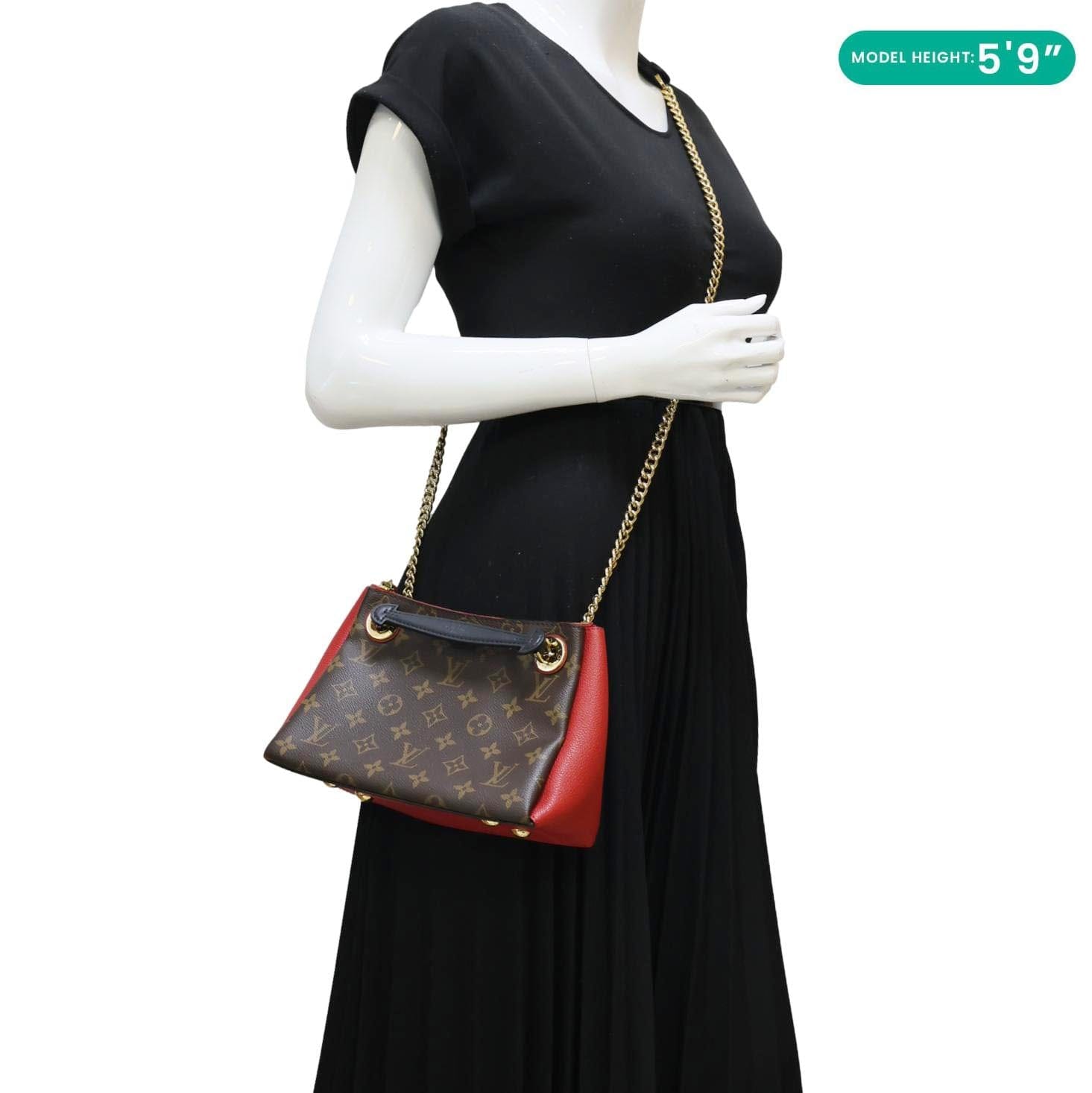 LOUIS VUITTON Surene BB Monogram Canvas Shoulder Bag in Red features classic monogram canvas paired with bold red leather trim. Gold-tone chain strap adds a chic, elegant touch for day-to-night wear.