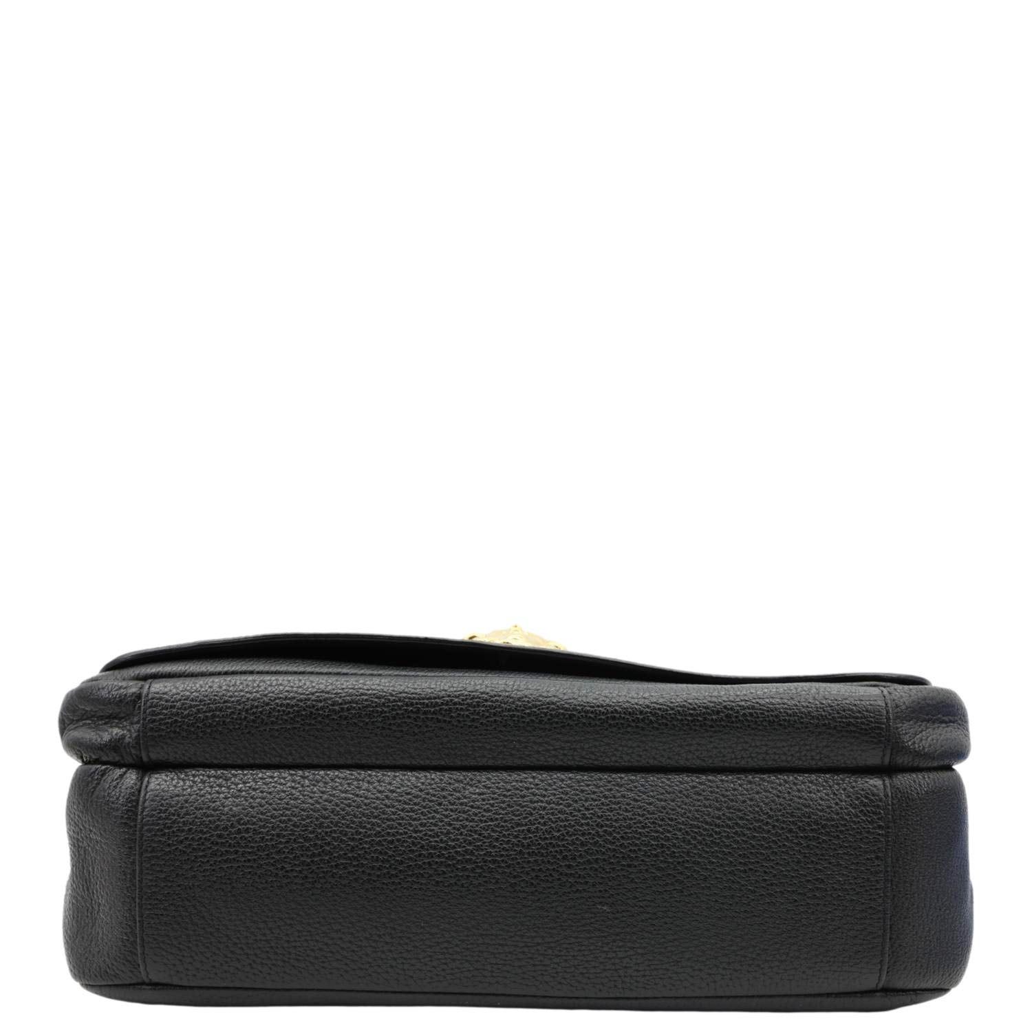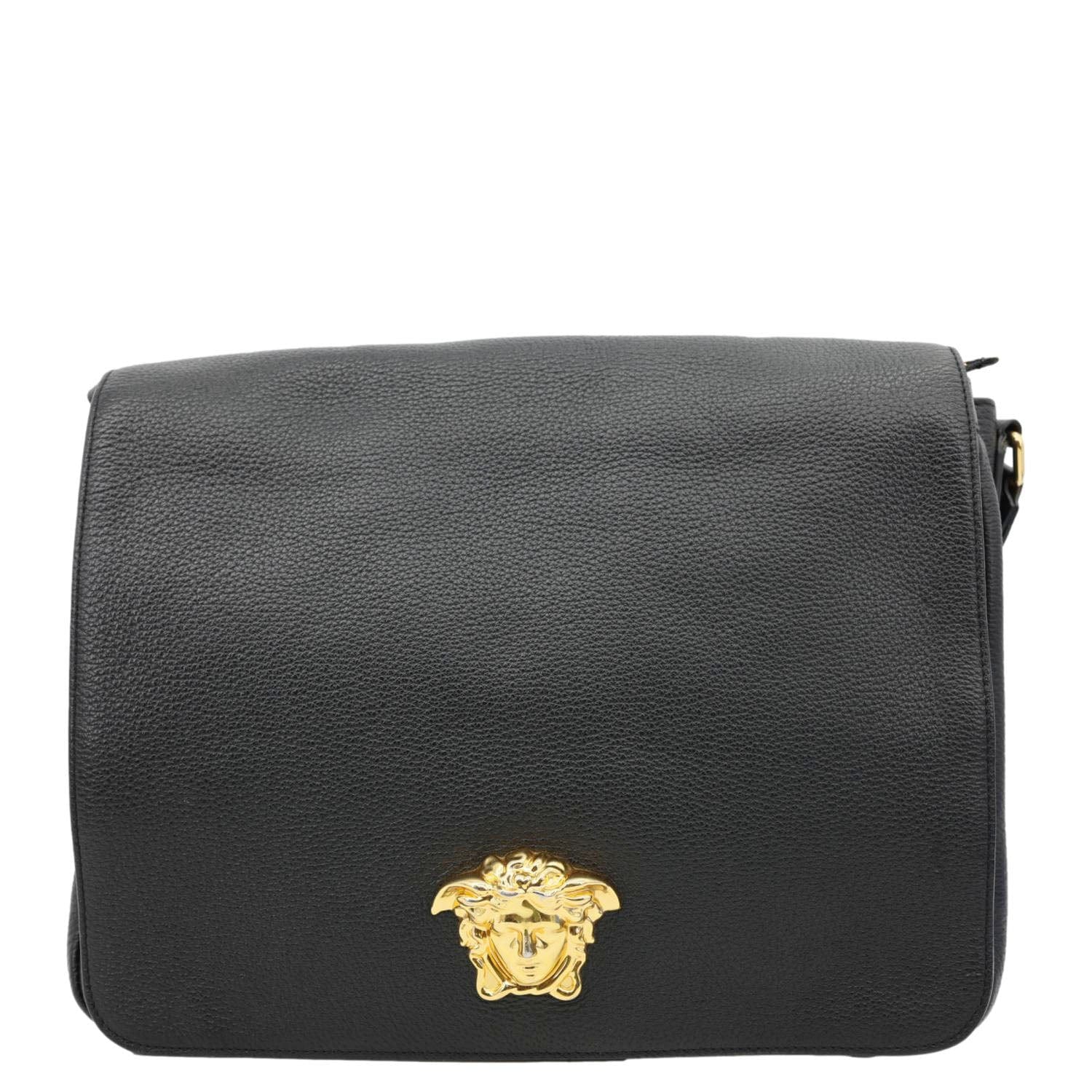 The VERSACE Medusa Head Messenger Bag in black leather radiates bold luxury. Accented with the iconic Medusa emblem, it’s perfect for statement elegance.