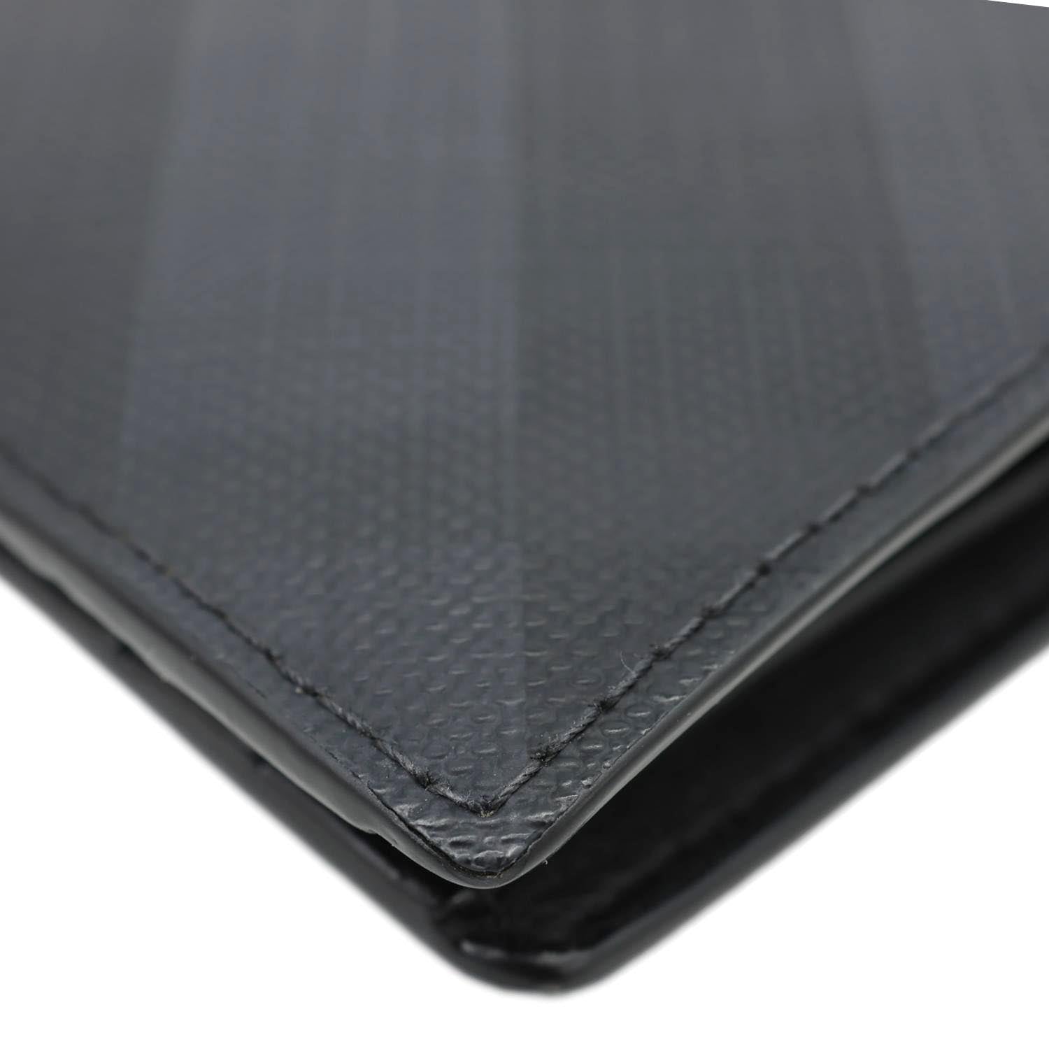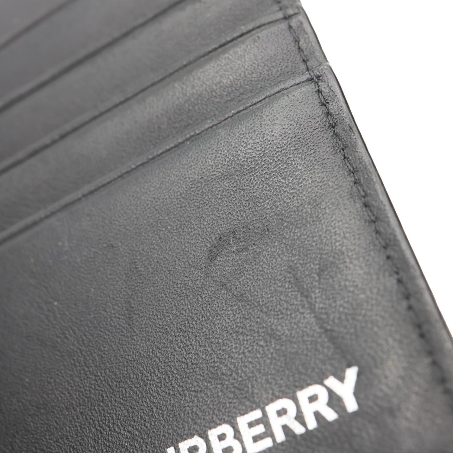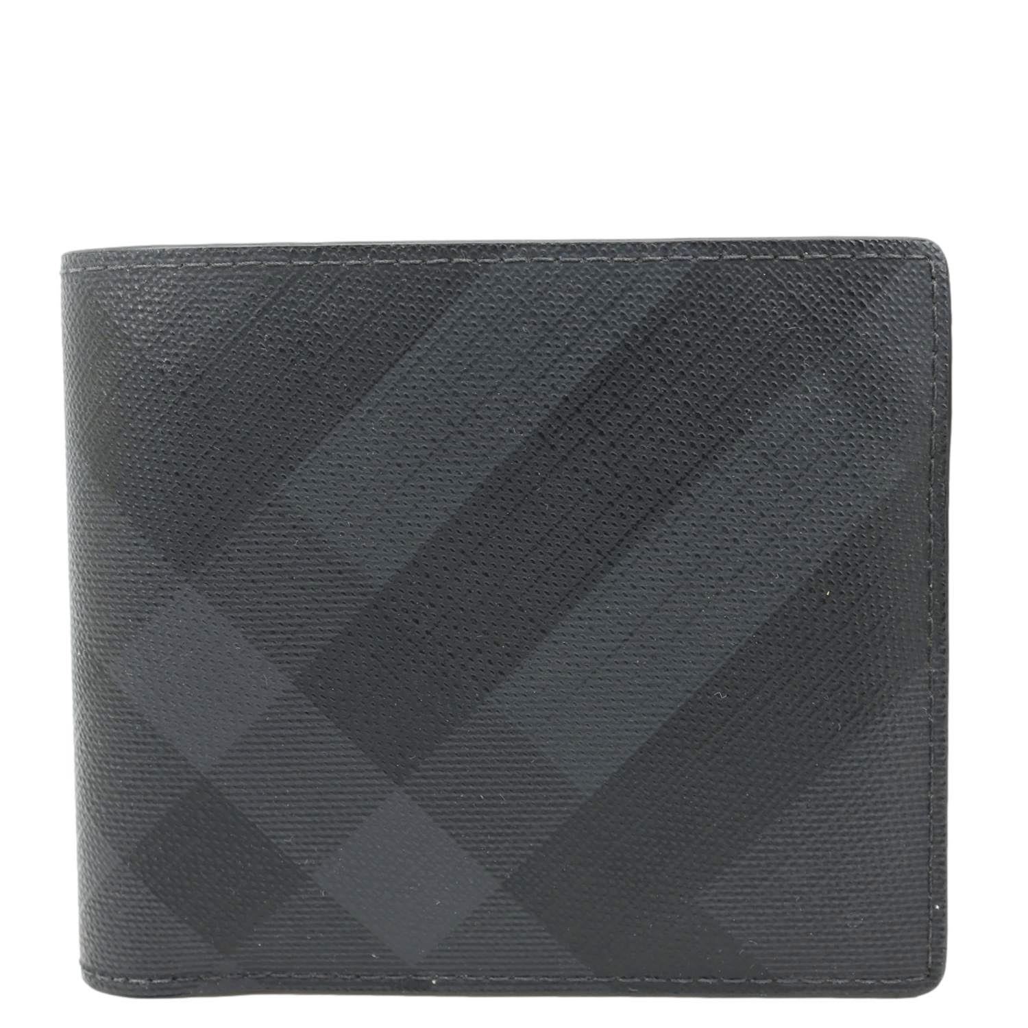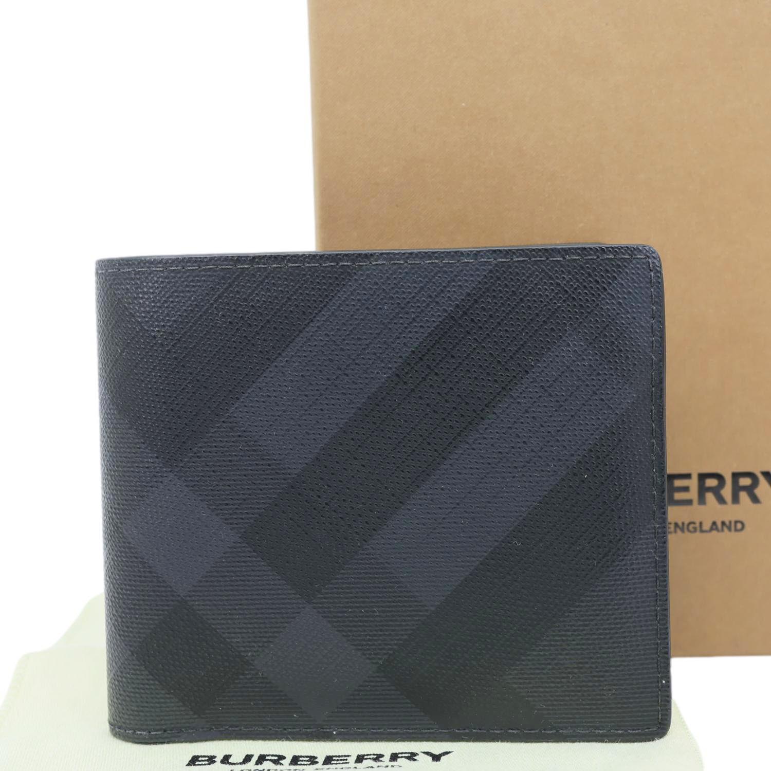 Burberry London Check-Print Canvas Bi-Fold Wallet in black features signature check-print canvas with leather trim. Compact and stylish, it offers organized card slots and a sleek silhouette for everyday use.