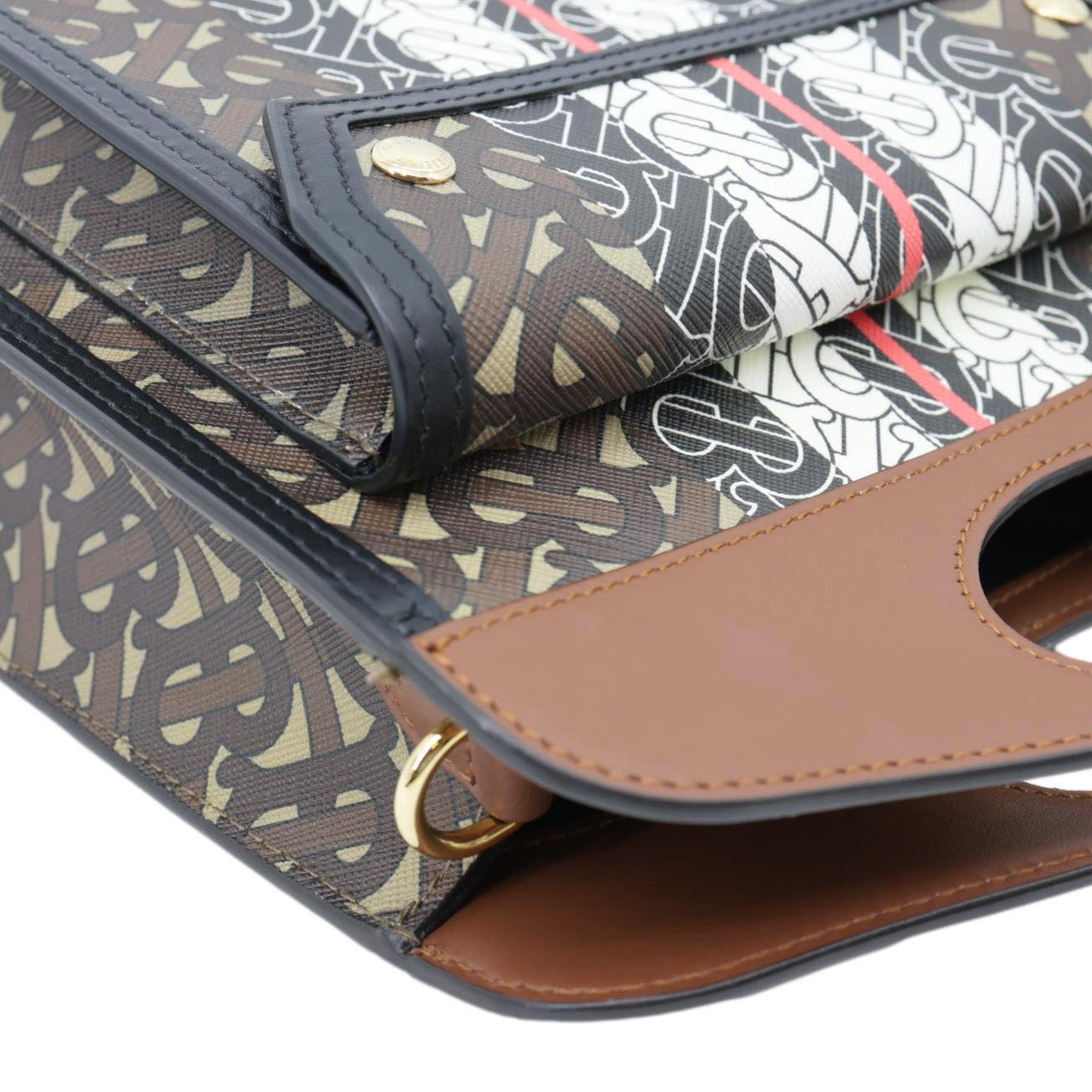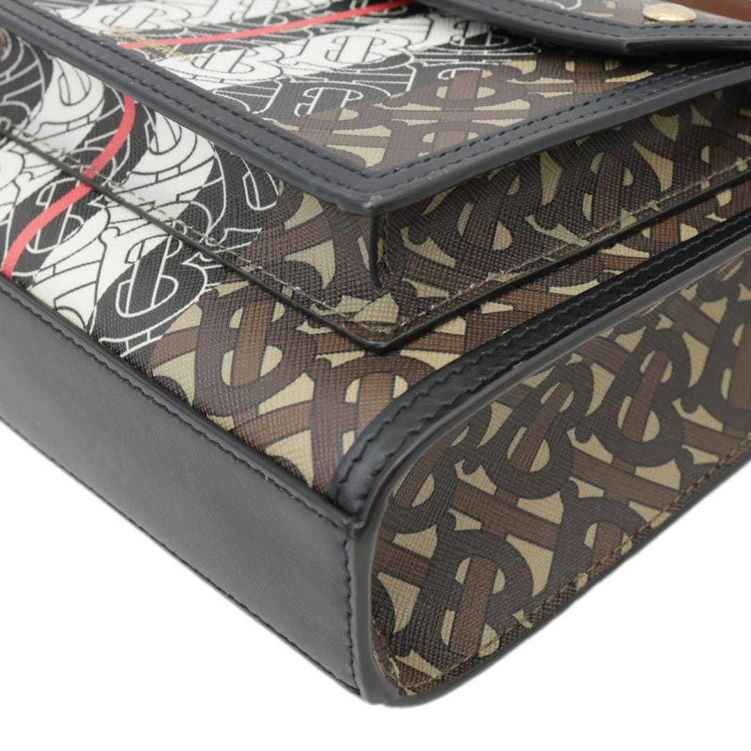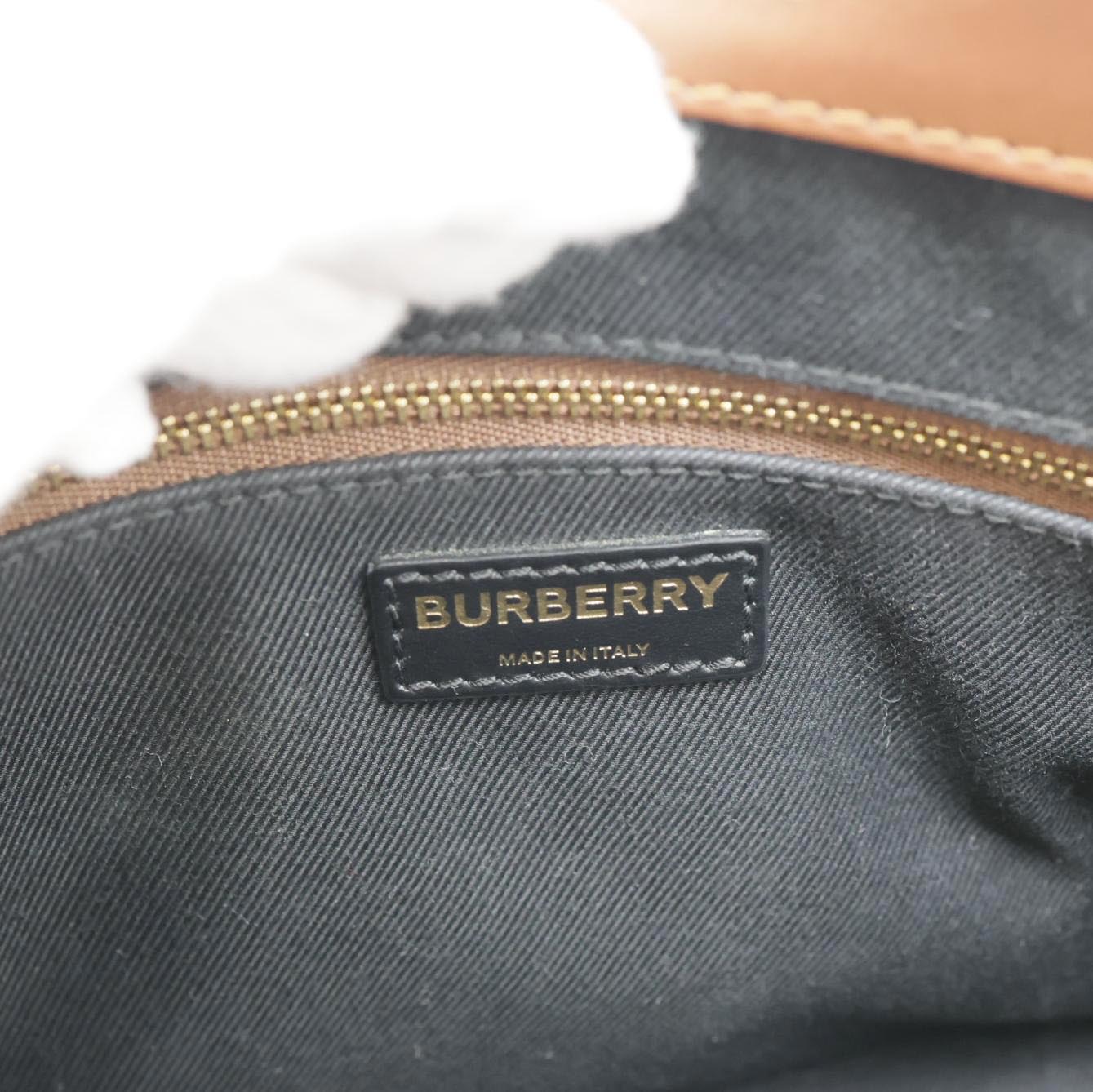 This luxurious Burberry bag features an E-Canvas stripe and monogram pattern, adding a touch of iconic style. The brown shoulder bag boasts a structured design with a pocket detail, perfect for everyday elegance.