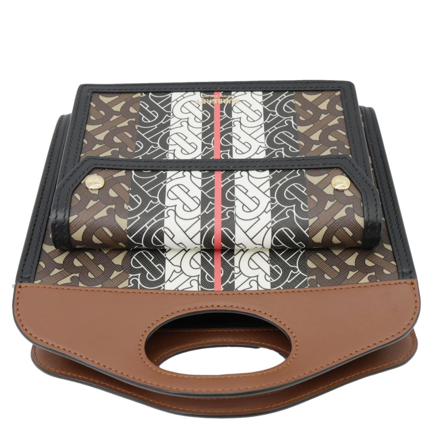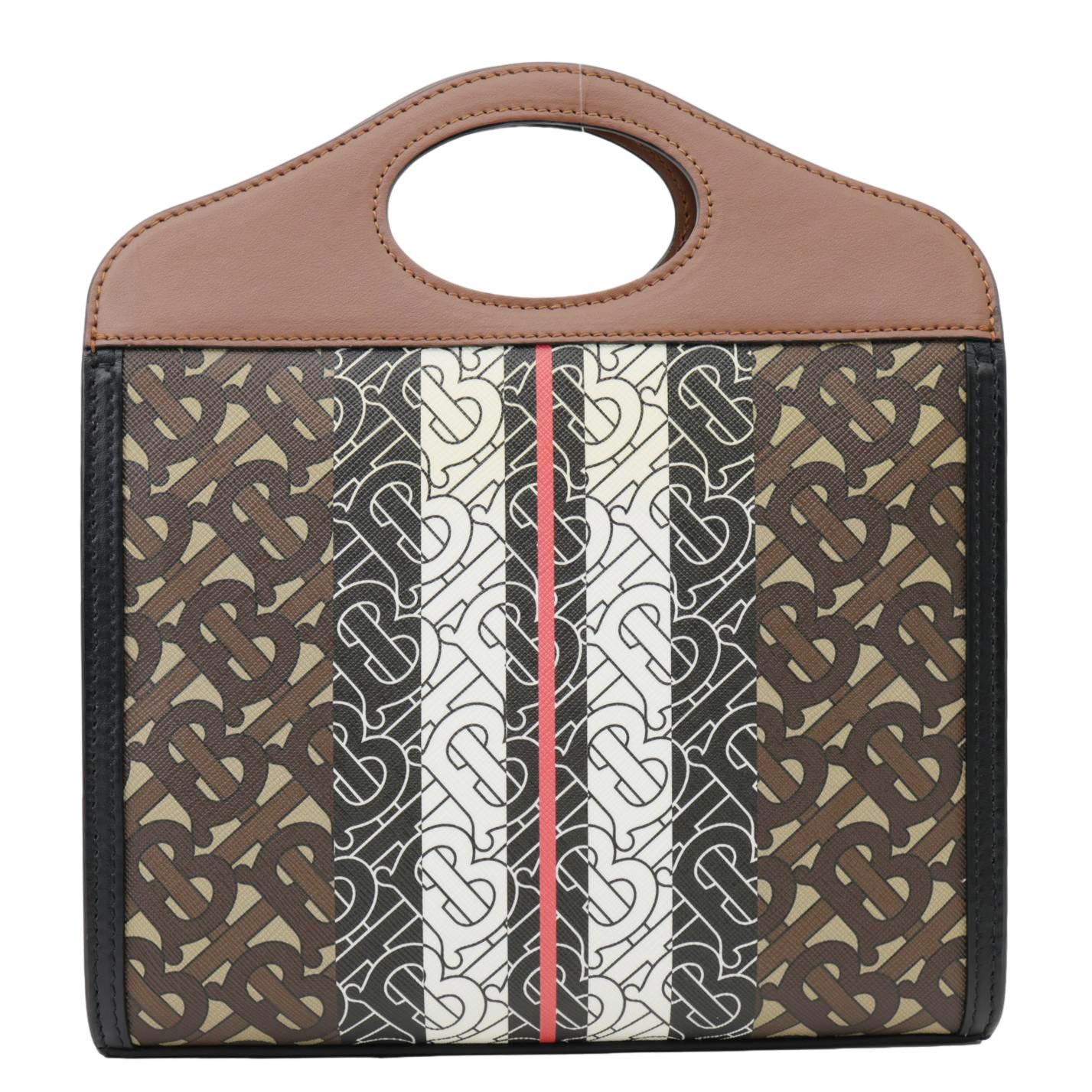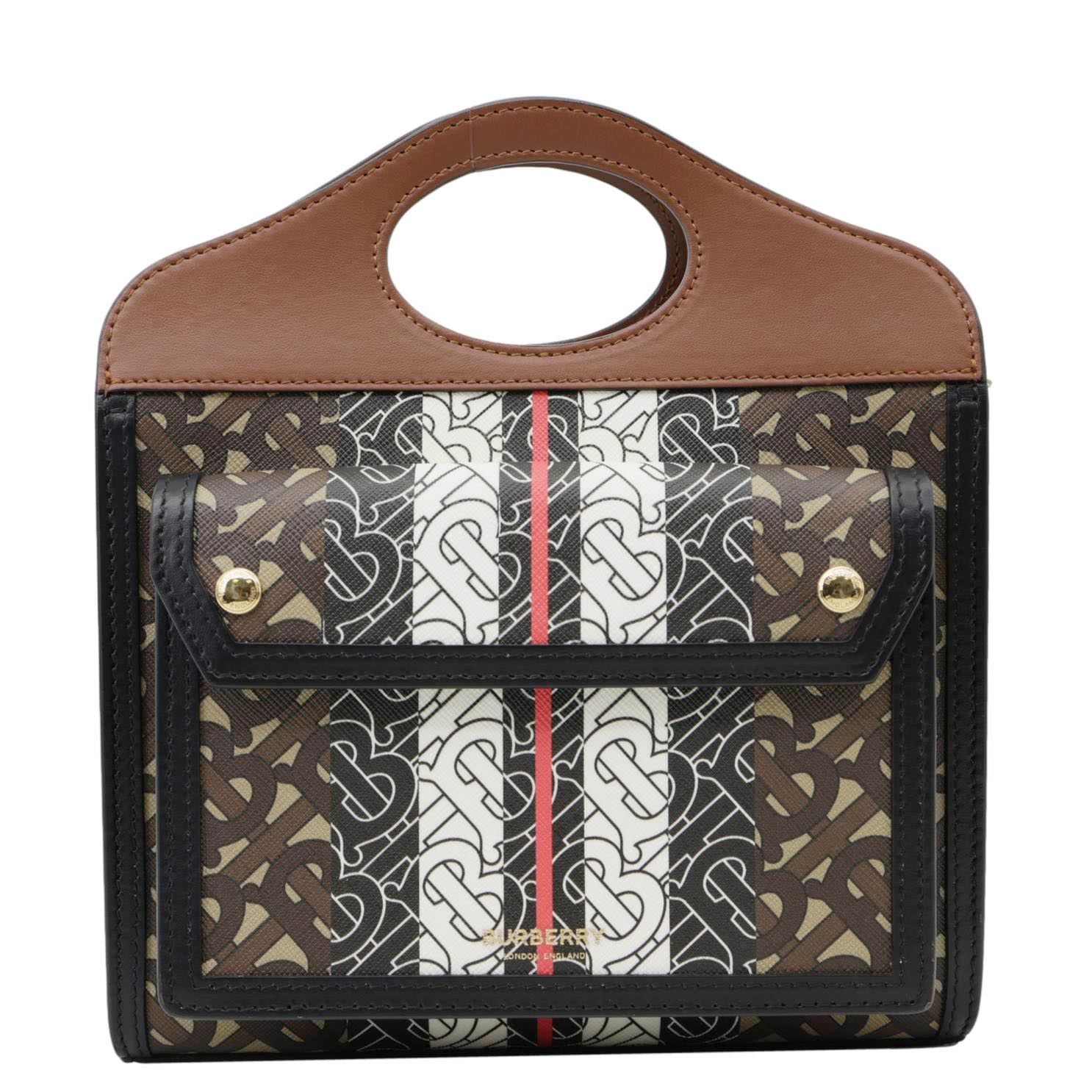 This luxurious Burberry bag features an E-Canvas stripe and monogram pattern, adding a touch of iconic style. The brown shoulder bag boasts a structured design with a pocket detail, perfect for everyday elegance.