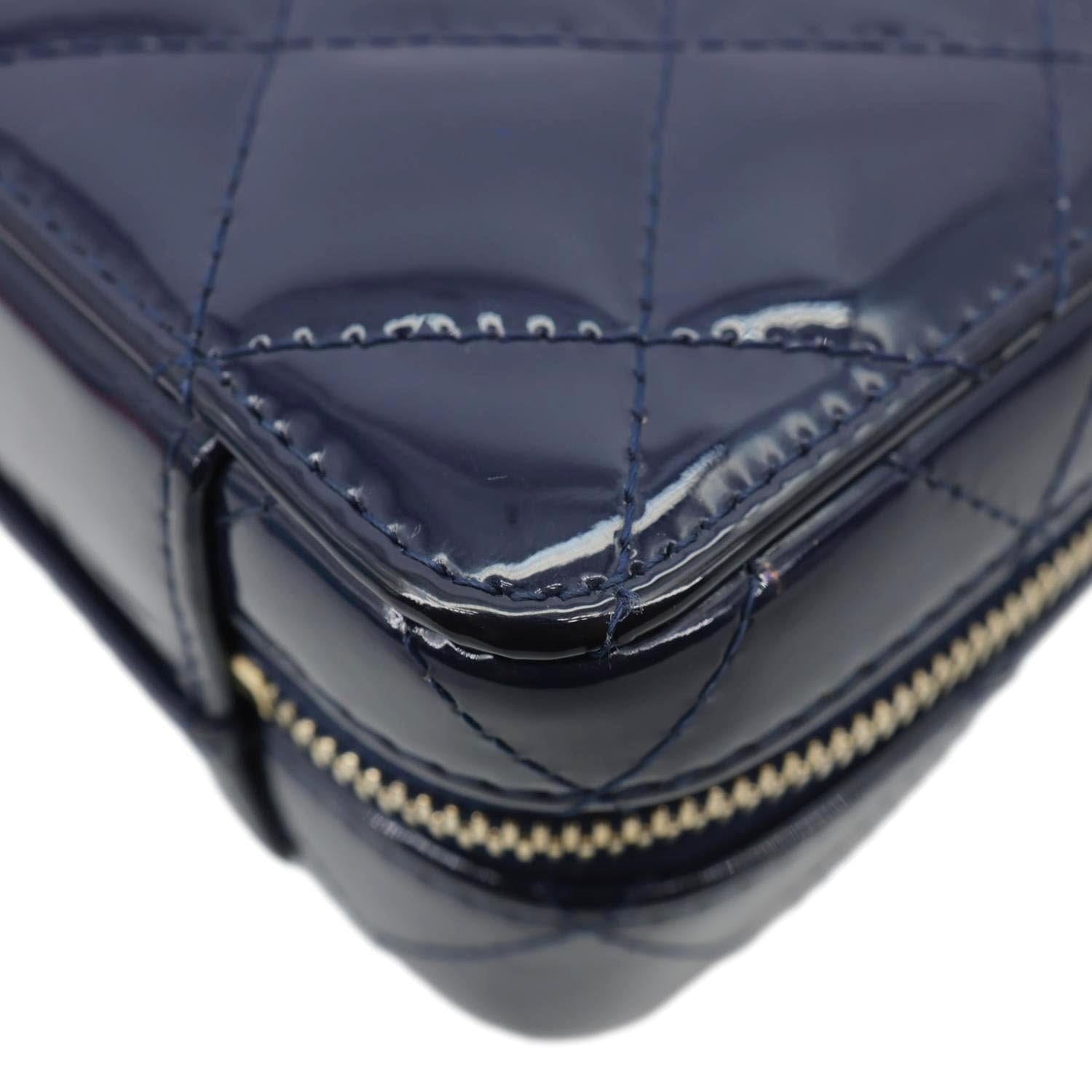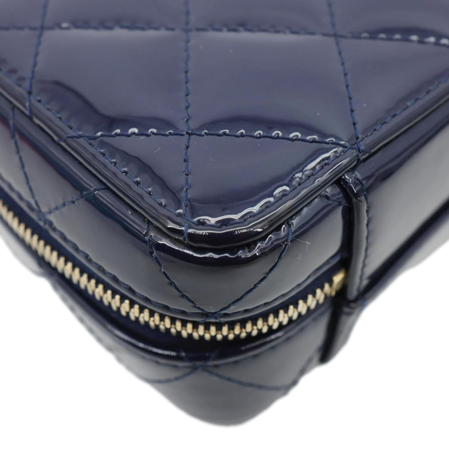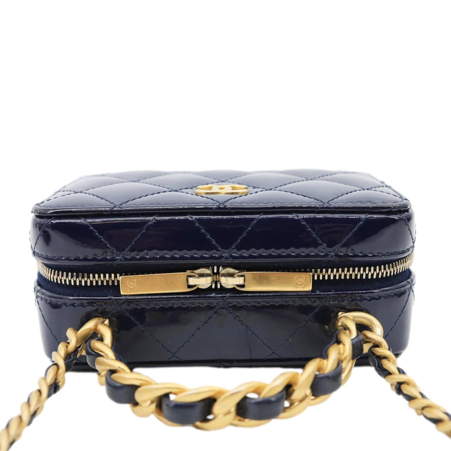 Chanel Woven Chain Vanity Case Mini in blue patent leather features an interlaced chain-trim design with a chic top handle. Compact yet stylish, it transitions from shoulder to hand carry, perfect for elegant everyday or evening wear.