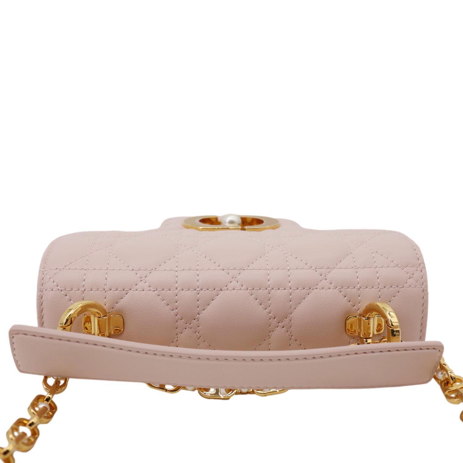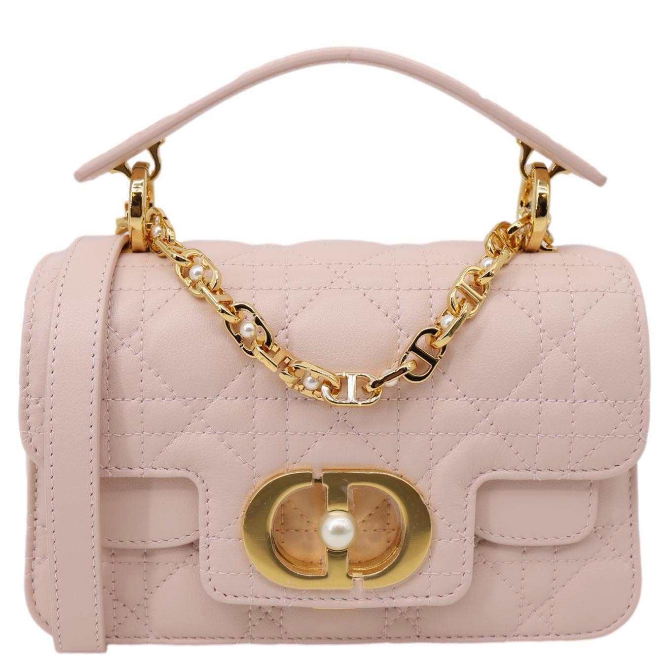 Christian Dior Jolie Cannage Calfskin Leather Bag in powder pink with signature quilted Cannage stitching. Features a structured top handle and detachable strap for shoulder or crossbody wear. A refined piece blending elegance, versatility, and timeless Dior craftsmanship.