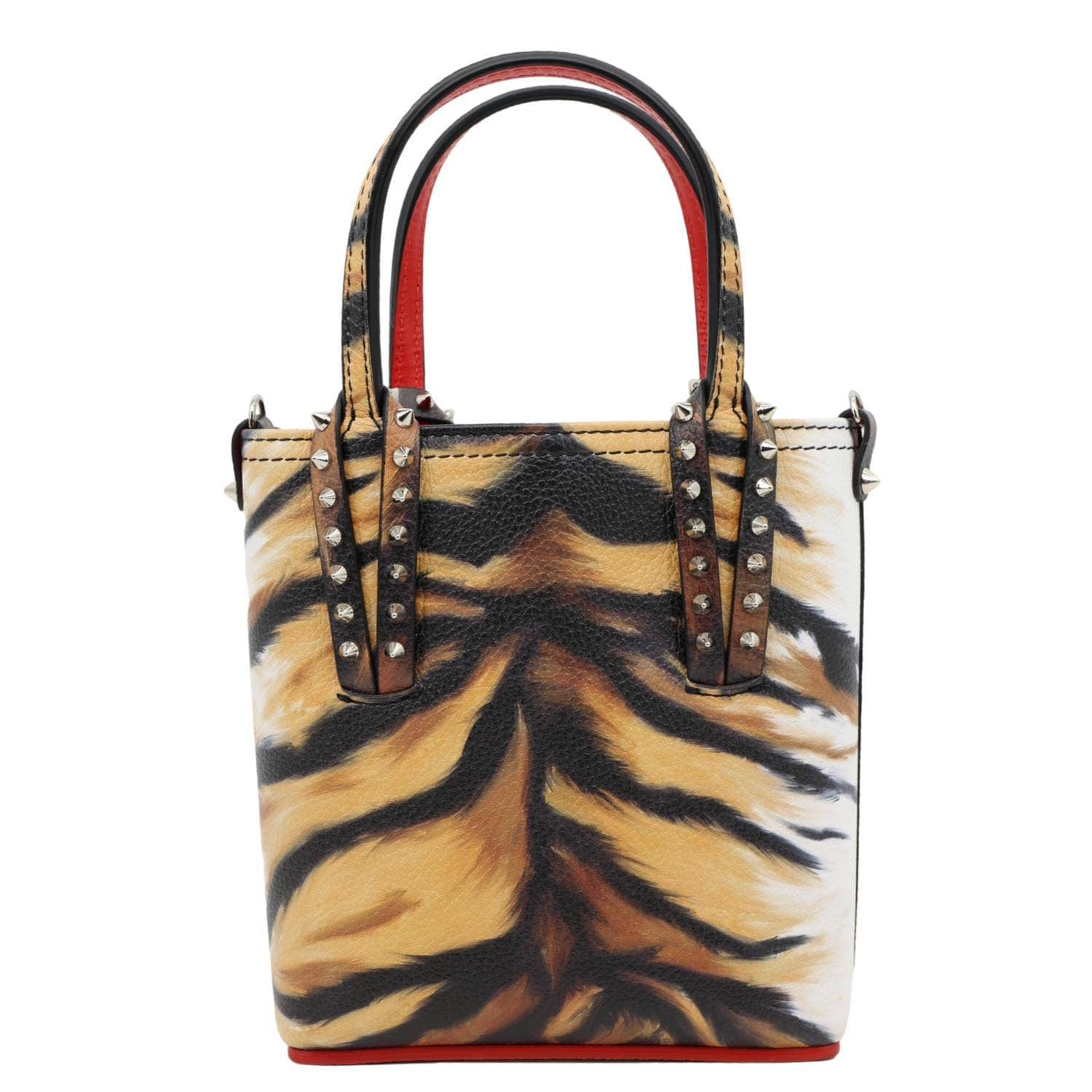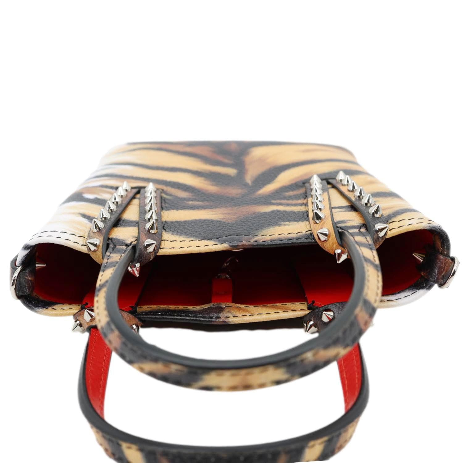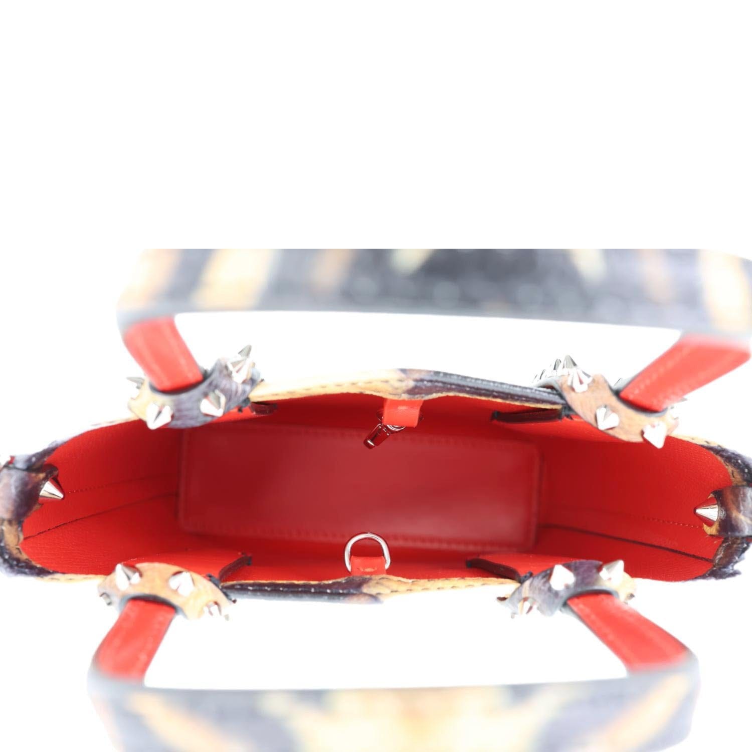 A striking tote crafted in smooth calfskin with bold Bengal print in vibrant multicolor. Designed in the vertical North-South silhouette with sleek top handles and signature red base. Compact yet chic, it embodies Louboutin’s signature edge and modern luxury.