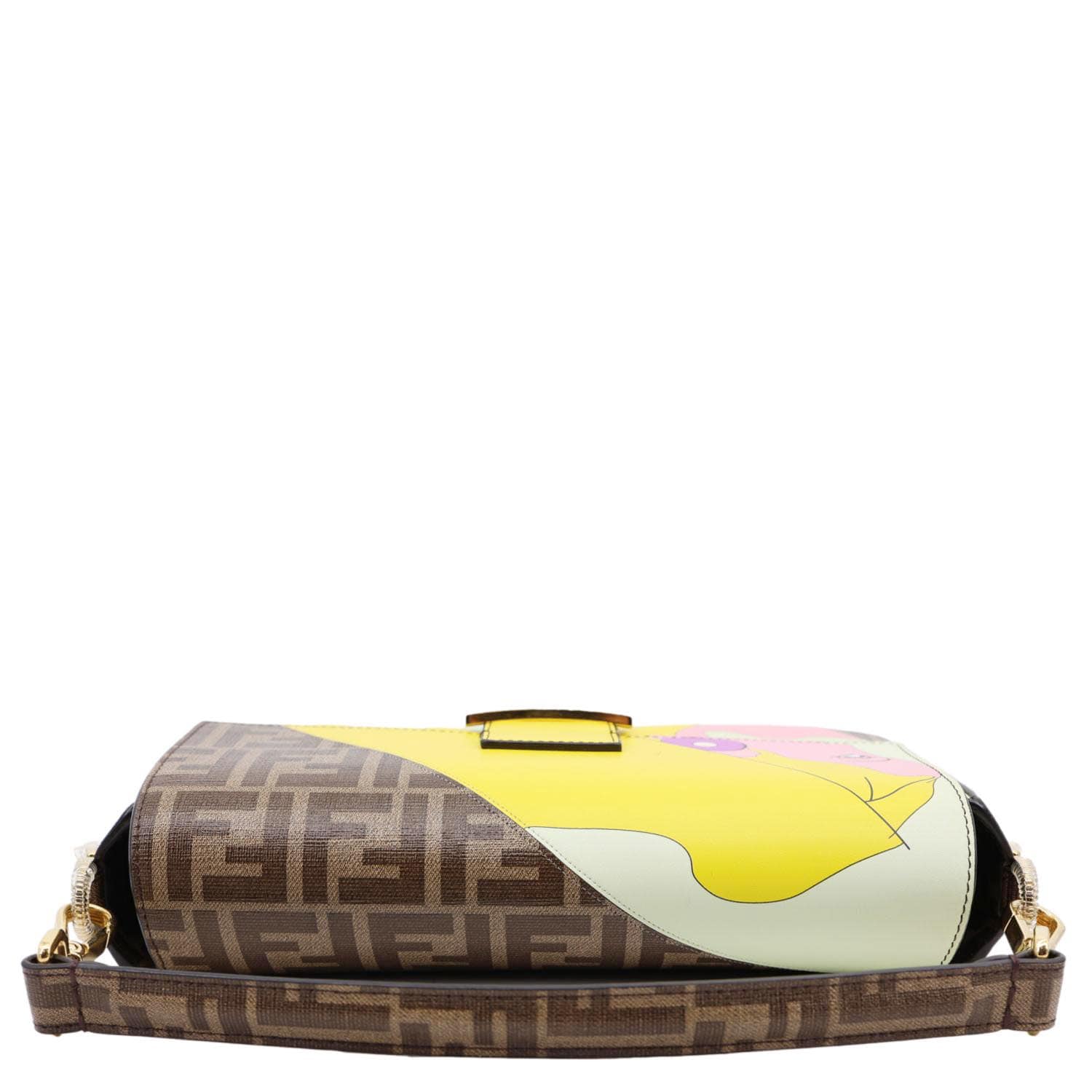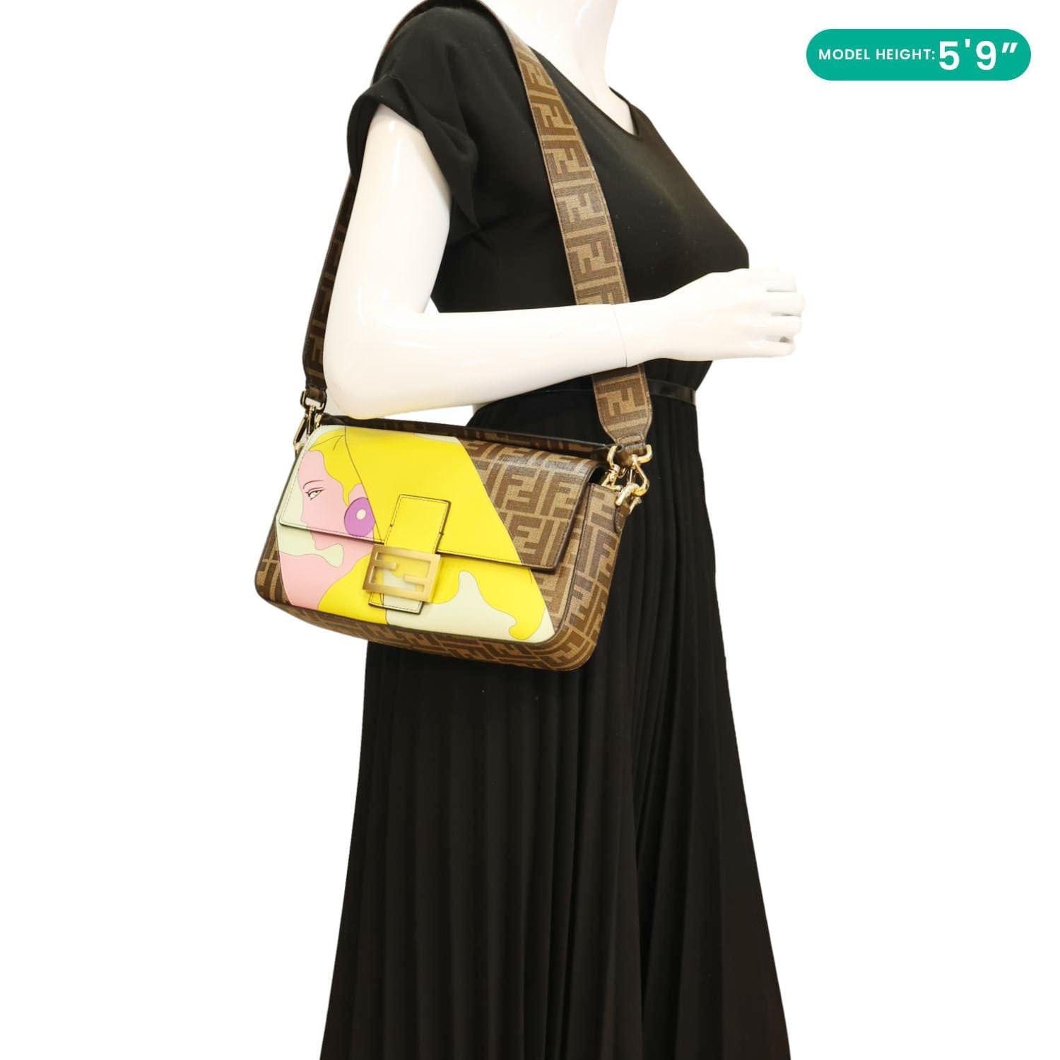 FENDI FF 1974 Hairdo Girls Inlay Glazed Fabric Baguette Bag in yellow, featuring the iconic FF motif with artistic girl illustrations. Crafted in glazed fabric with a structured silhouette, blending playful design with timeless elegance.