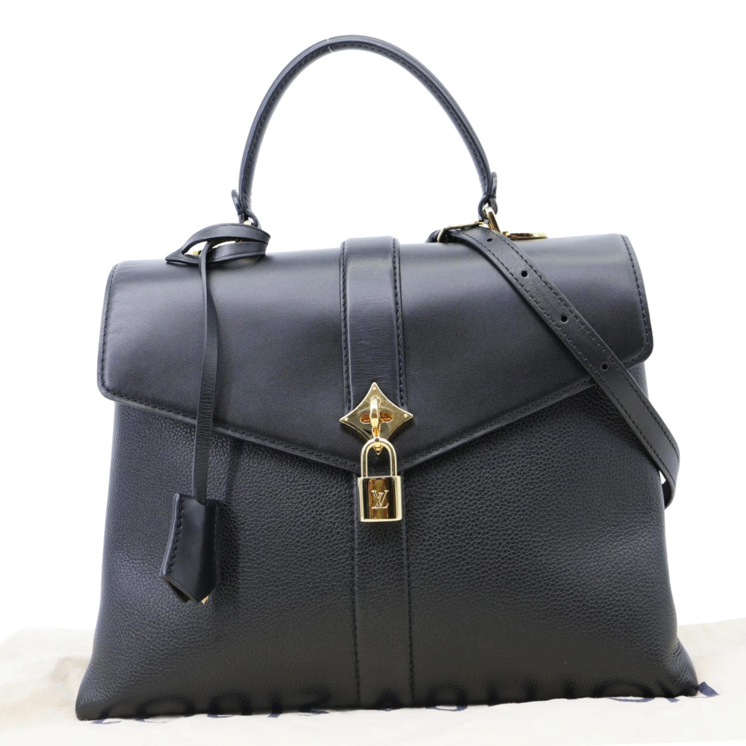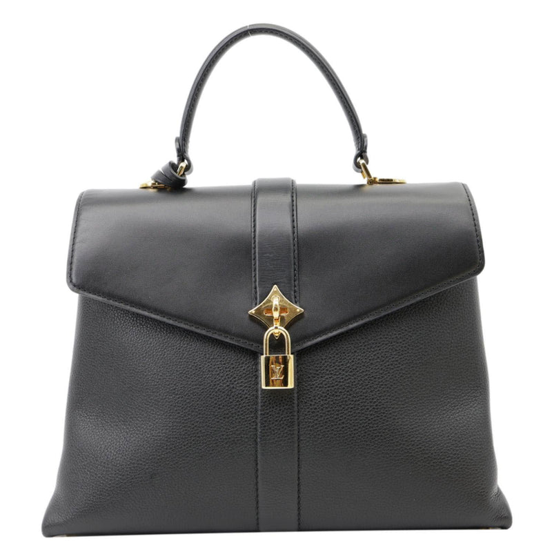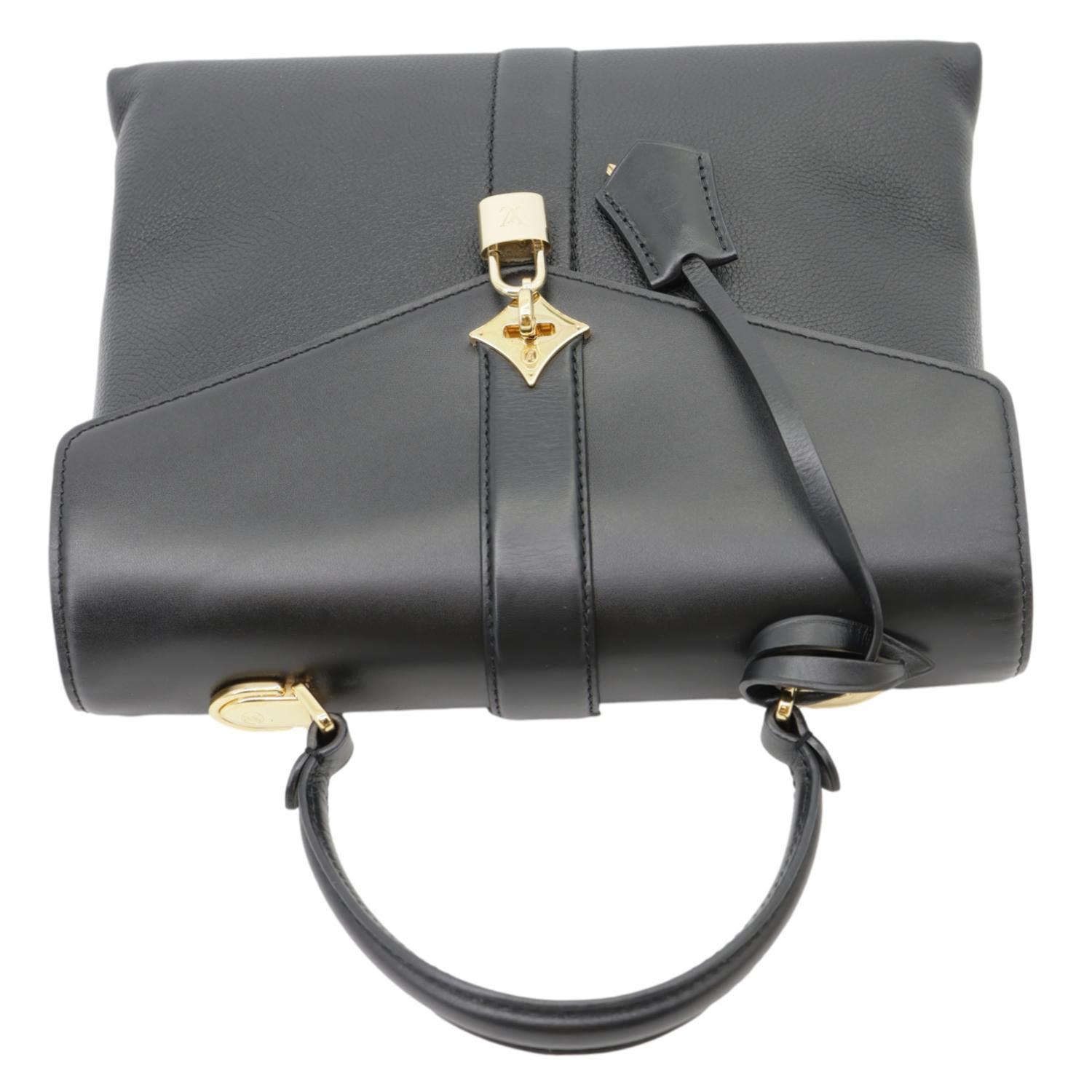 This LOUIS VUITTON Rose Des Vents MM bag features supple calfskin leather in a sleek black hue, complemented by gold-tone hardware. The bag's structured design with a front flap and rolled handle exudes understated luxury and sophistication.