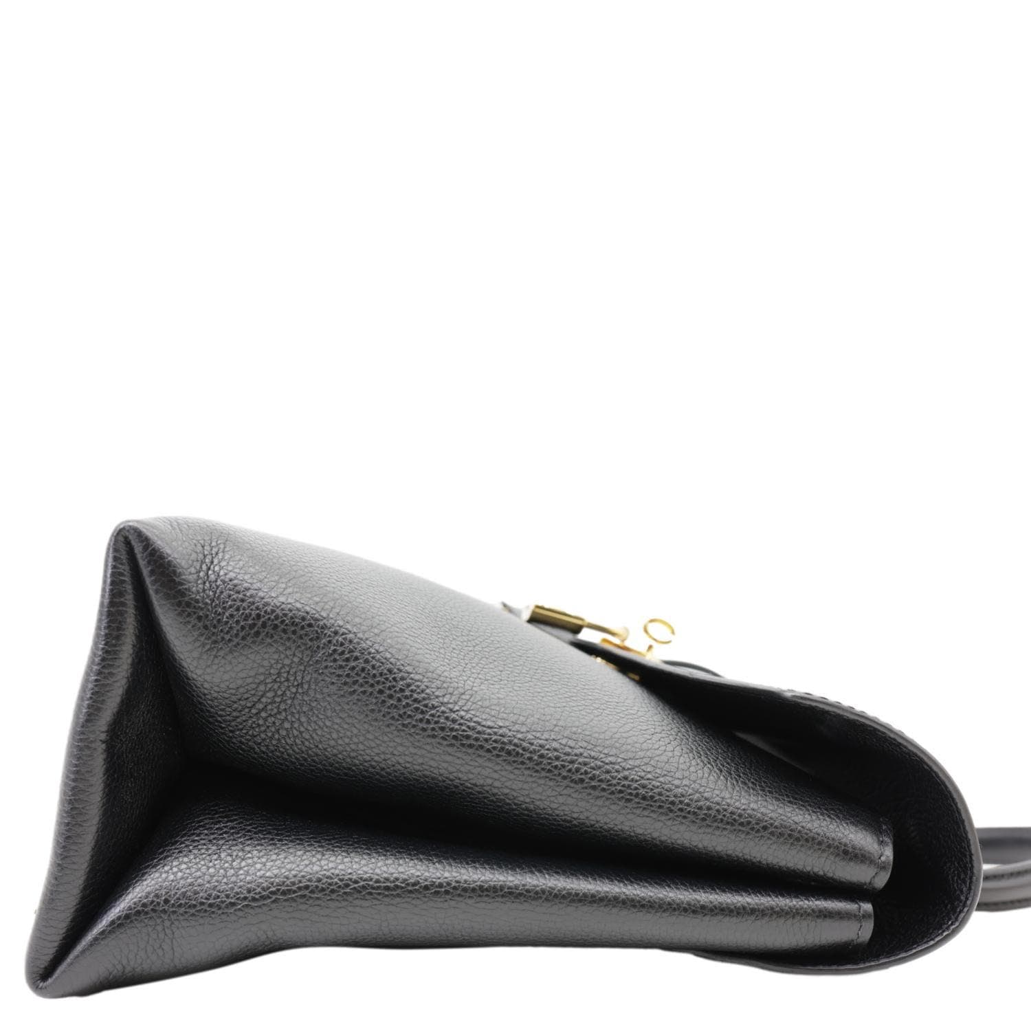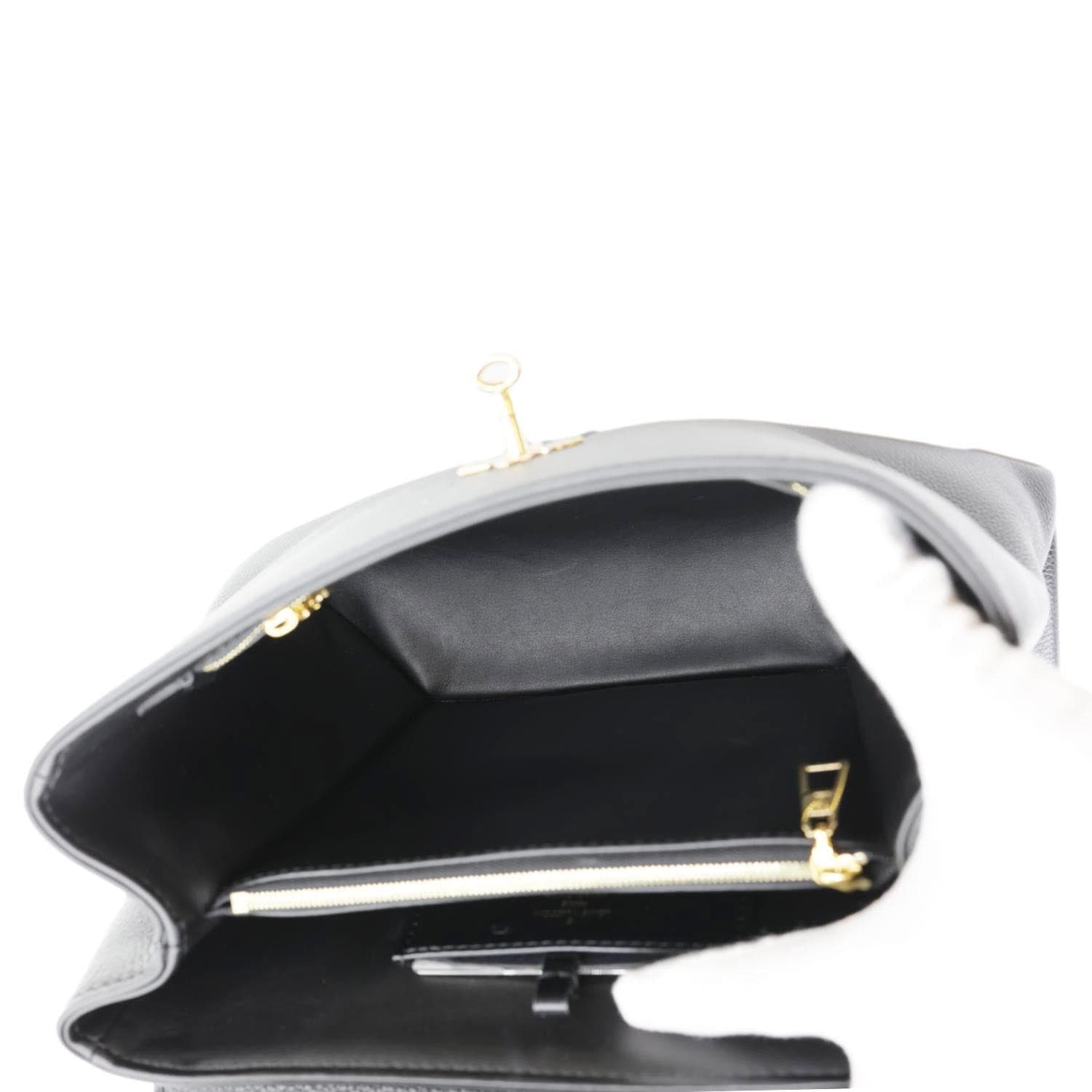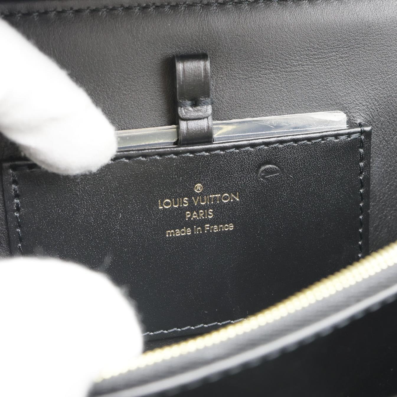 This LOUIS VUITTON Rose Des Vents MM bag features supple calfskin leather in a sleek black hue, complemented by gold-tone hardware. The bag's structured design with a front flap and rolled handle exudes understated luxury and sophistication.