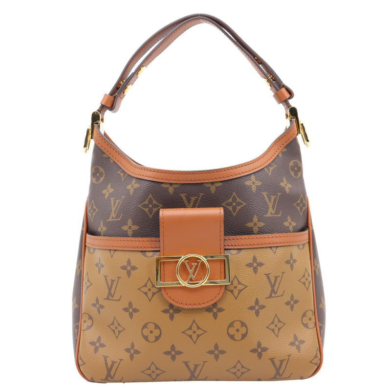 The Louis Vuitton Dauphine Monogram Reverse Canvas Hobo Shoulder Bag in brown features an iconic monogram with a modern reverse design. Its spacious hobo silhouette and signature LV clasp make it both stylish and practical.
