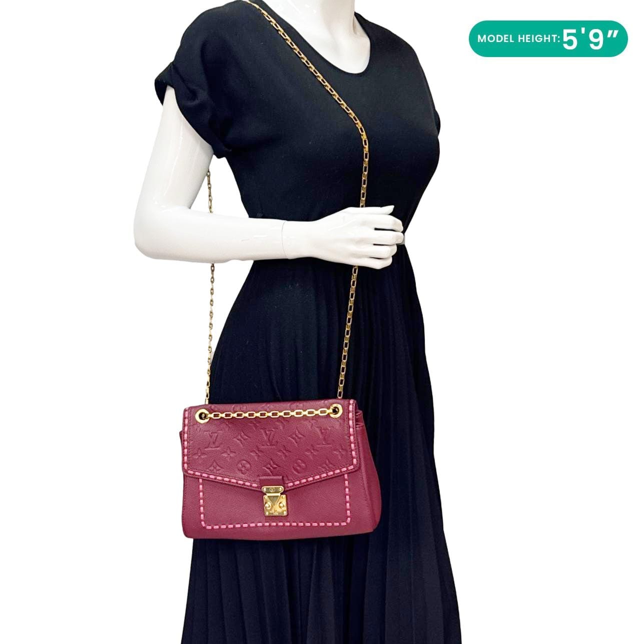 The Louis Vuitton Saint Germain PM features Monogram Empreinte leather in rich burgundy with refined goldtone hardware. This elegant shoulder bag boasts a sleek design, chain strap, and sophisticated details for luxurious everyday style.