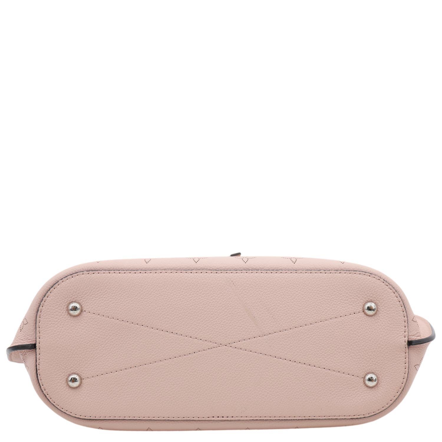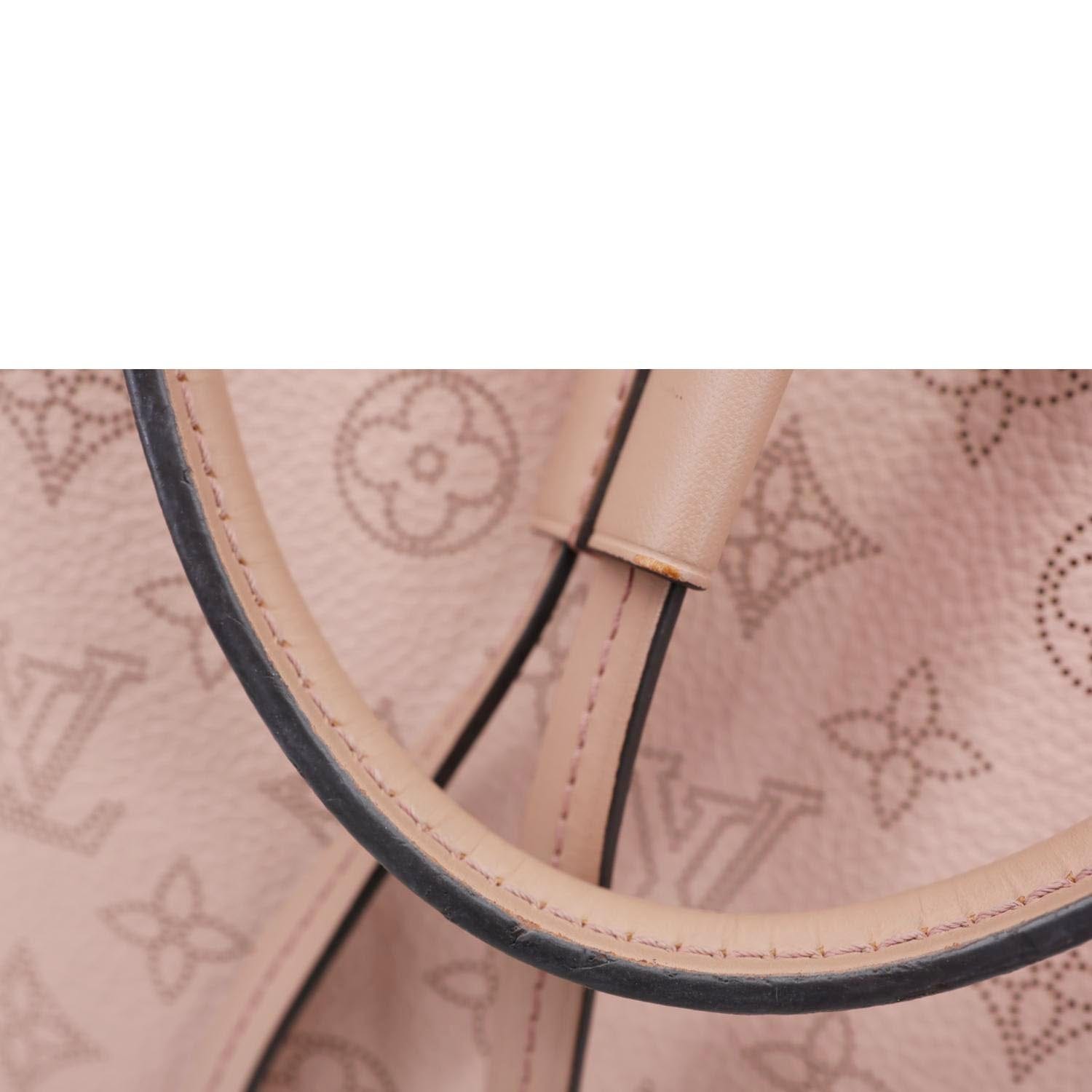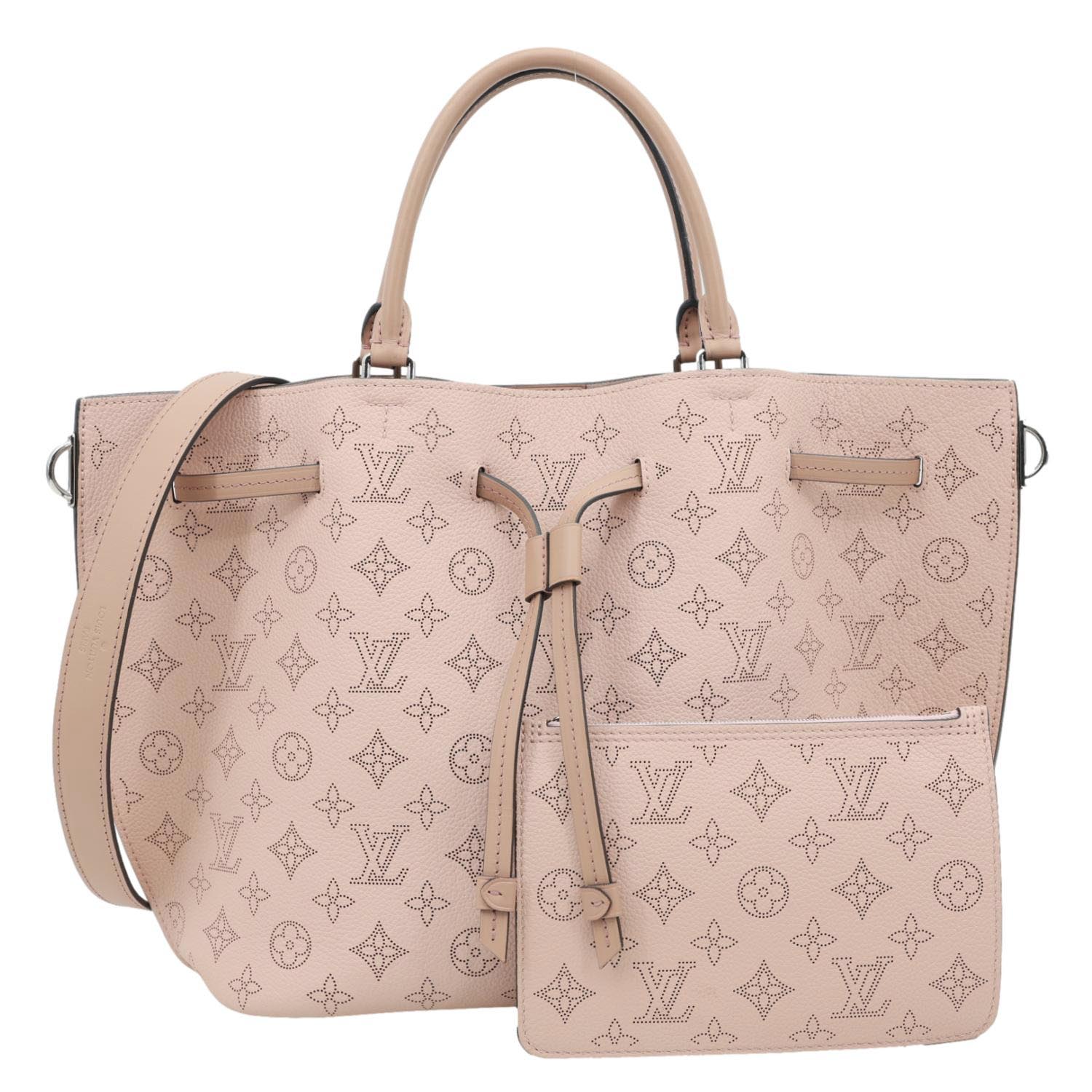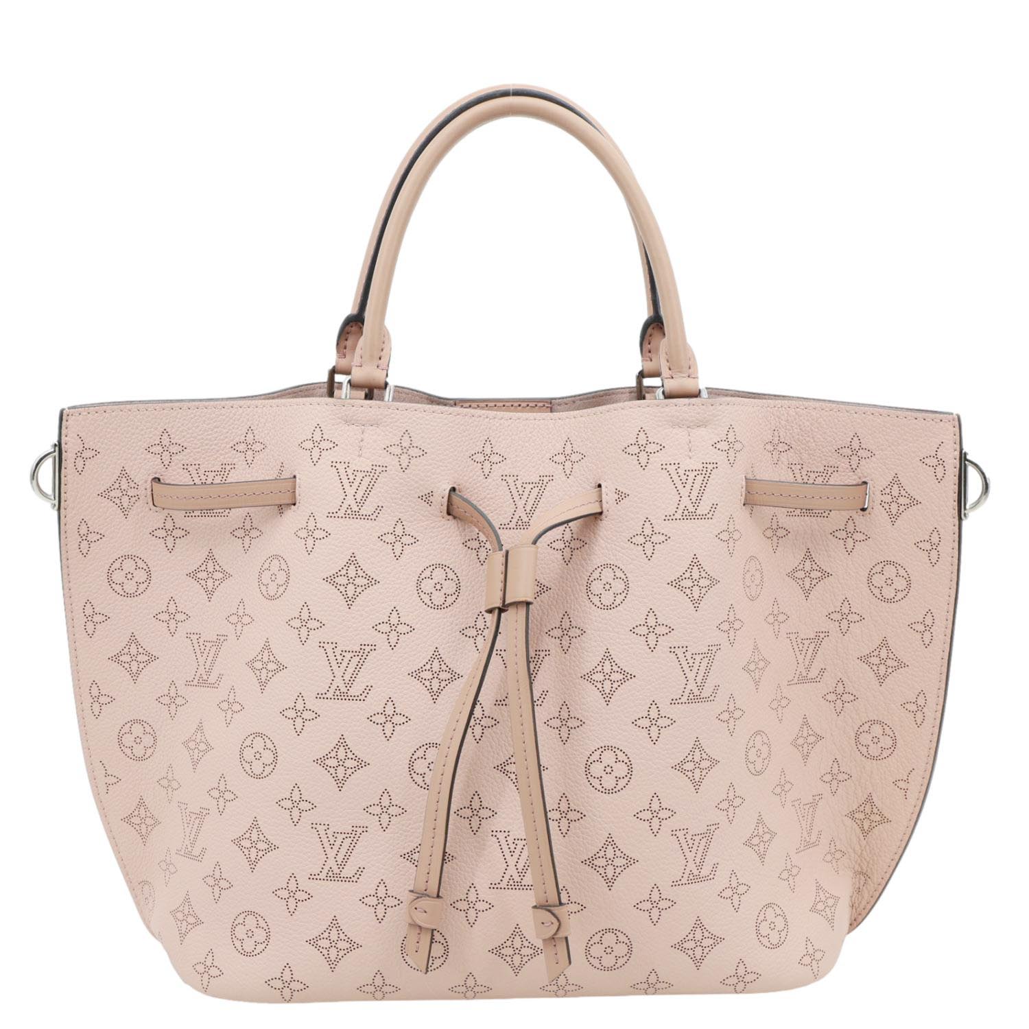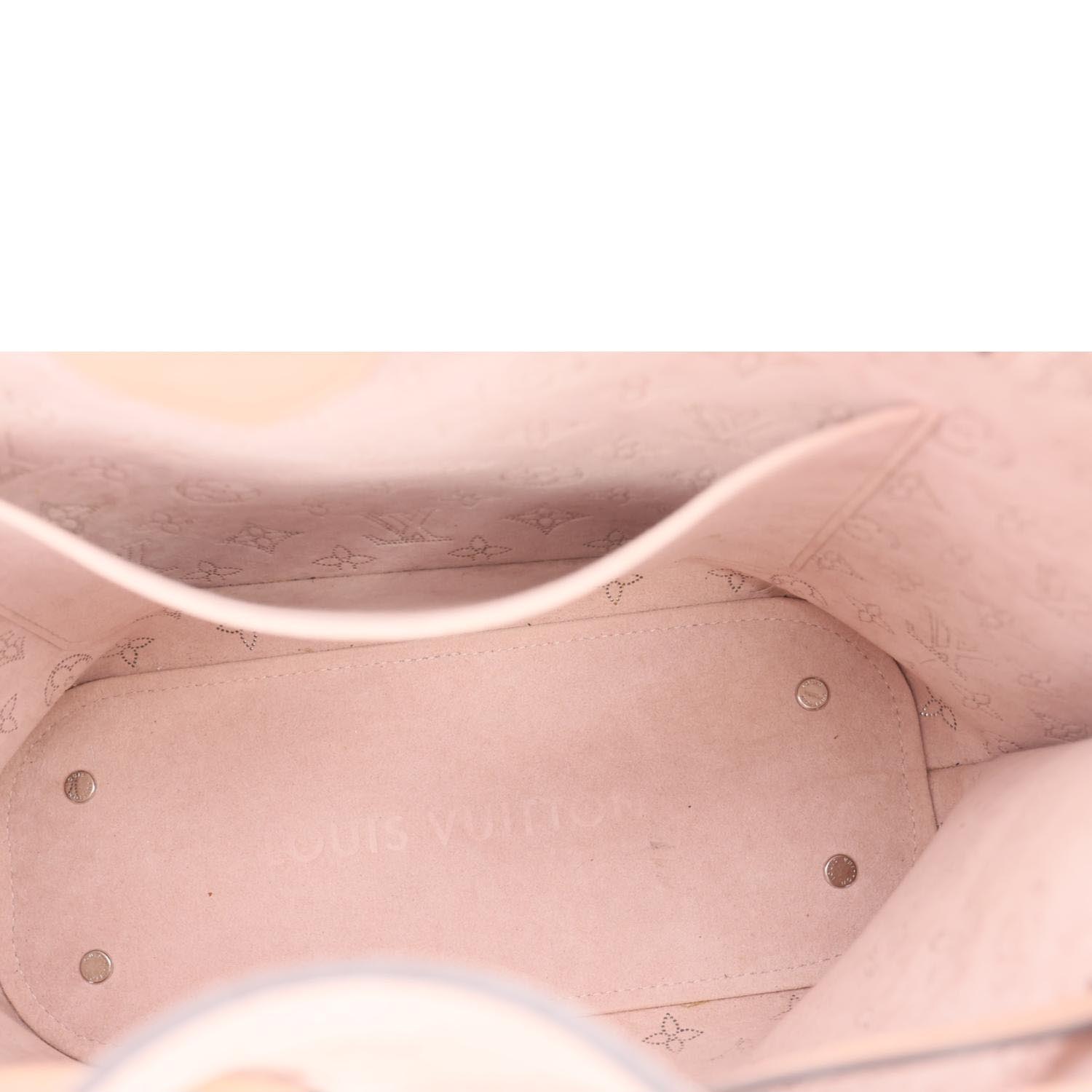 LOUIS VUITTON Girolata in Monogram Mahina Leather features delicate perforated detailing in a soft pink tone. Lightweight and feminine, it offers a flexible bucket-style design with adjustable straps.