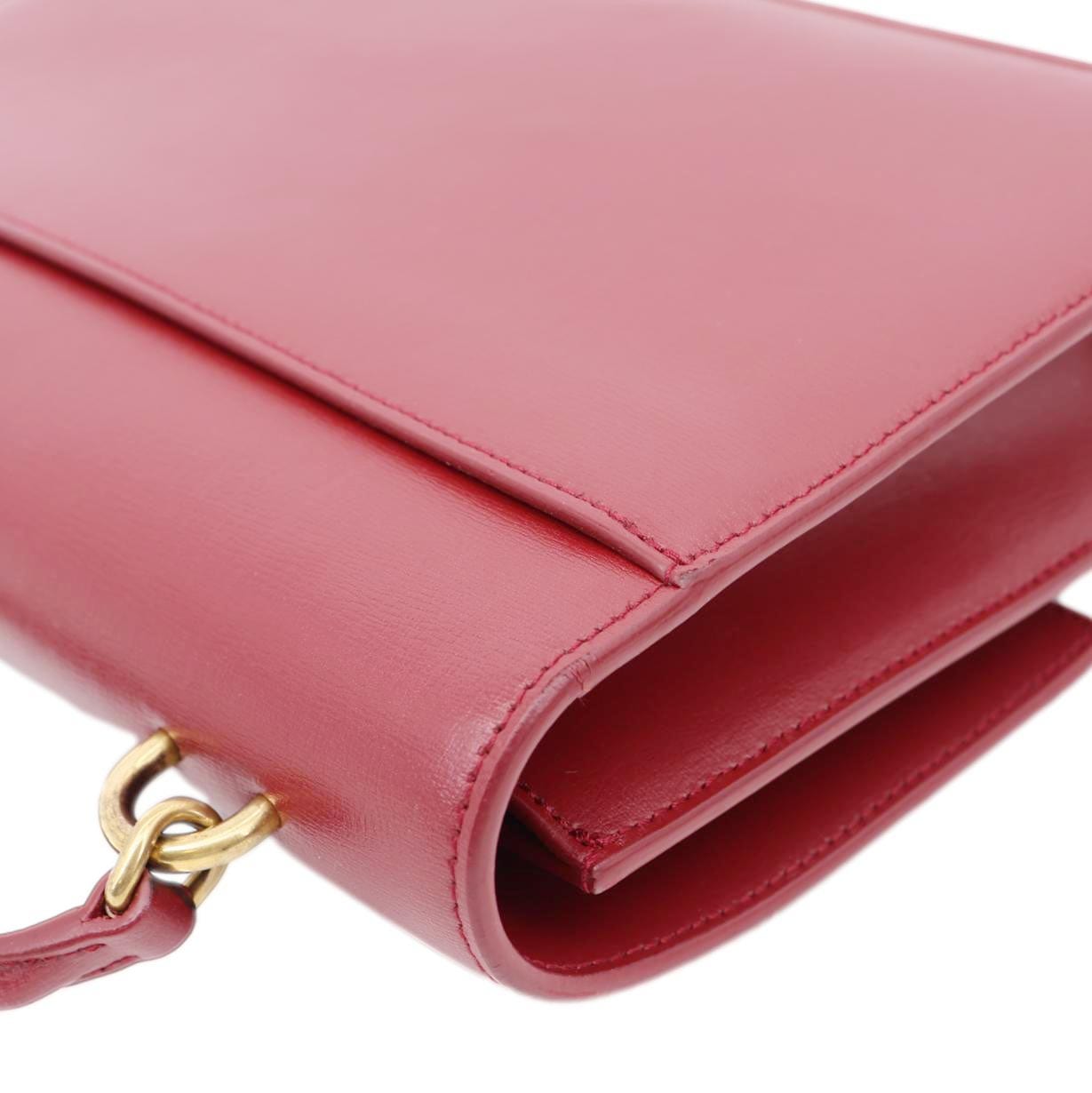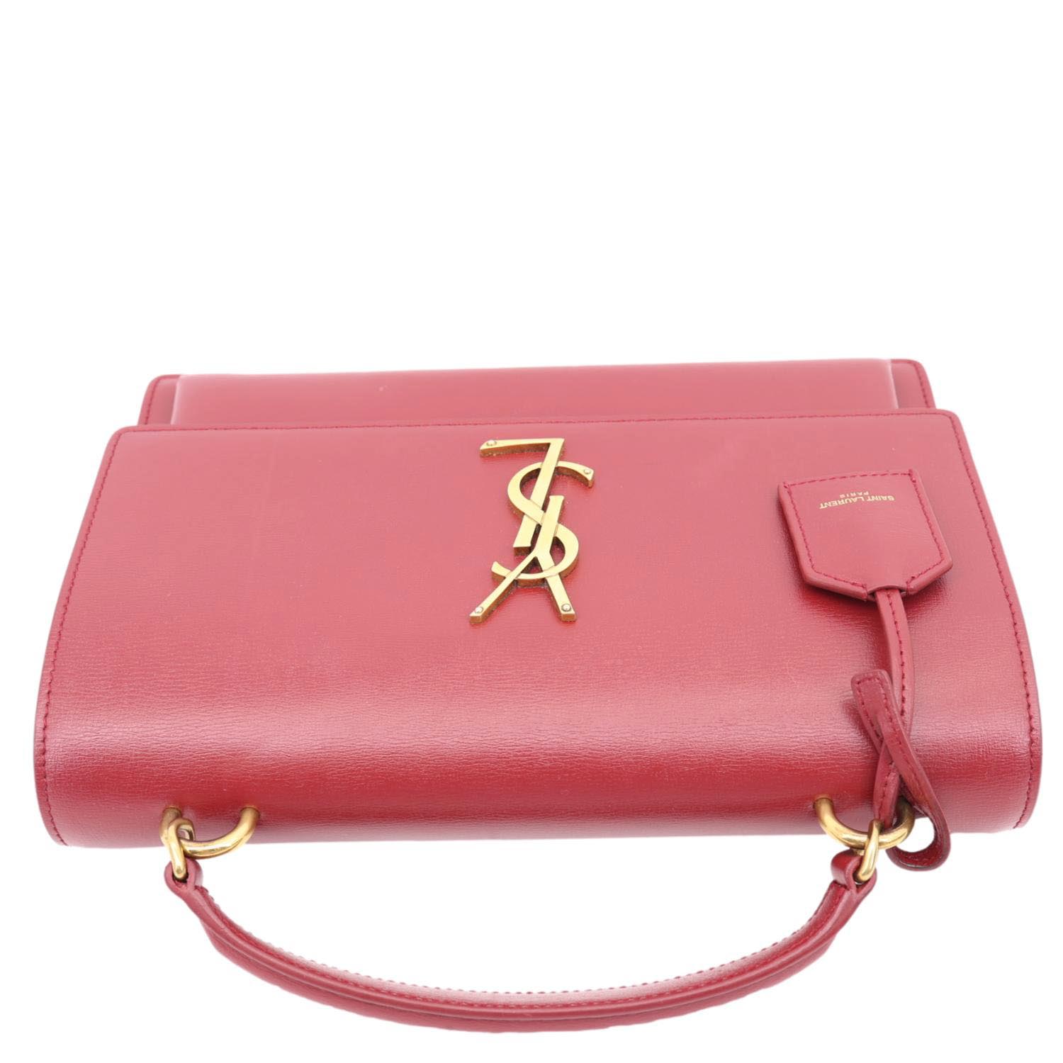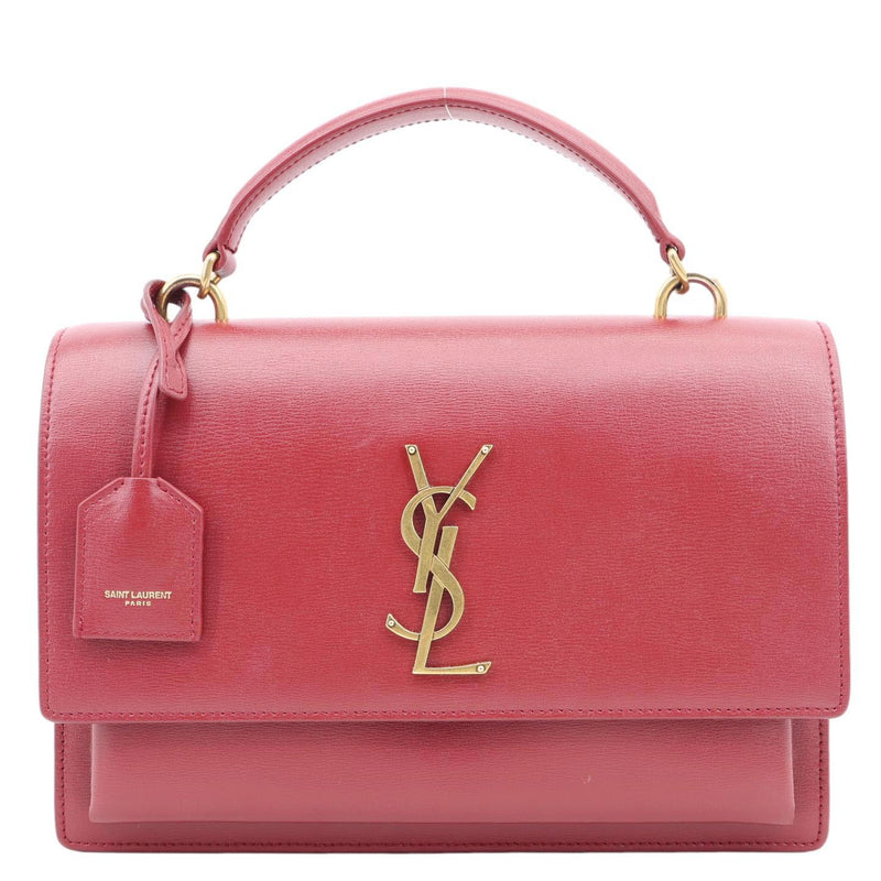 The Yves Saint Laurent Monogram Sunset Leather Satchel Crossbody Bag shines in rich red leather with the iconic YSL logo. Its structured design includes a flap closure and sleek chain strap for versatile styling. Perfectly sized, it blends timeless elegance with everyday practicality.