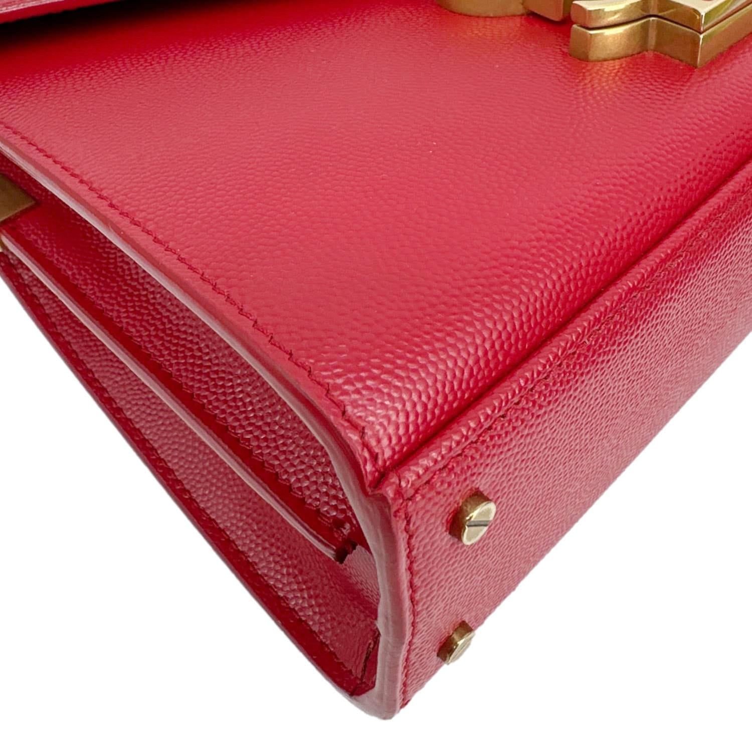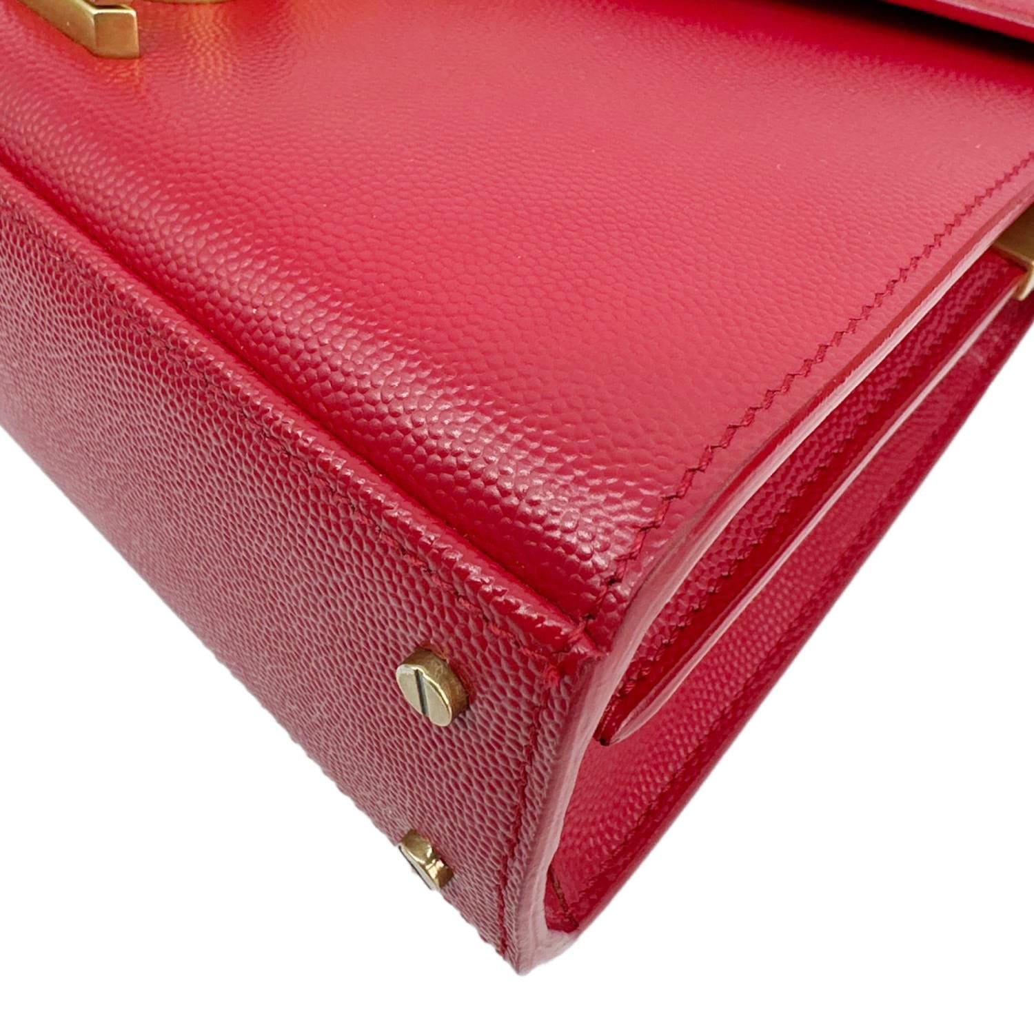 Yves Saint Laurent Cassandra Mini crafted in grain de poudre leather with a structured top-handle silhouette in bold red. Signature YSL logo closure with shoulder strap, perfect for elegant day-to-night styling with a refined luxury touch.