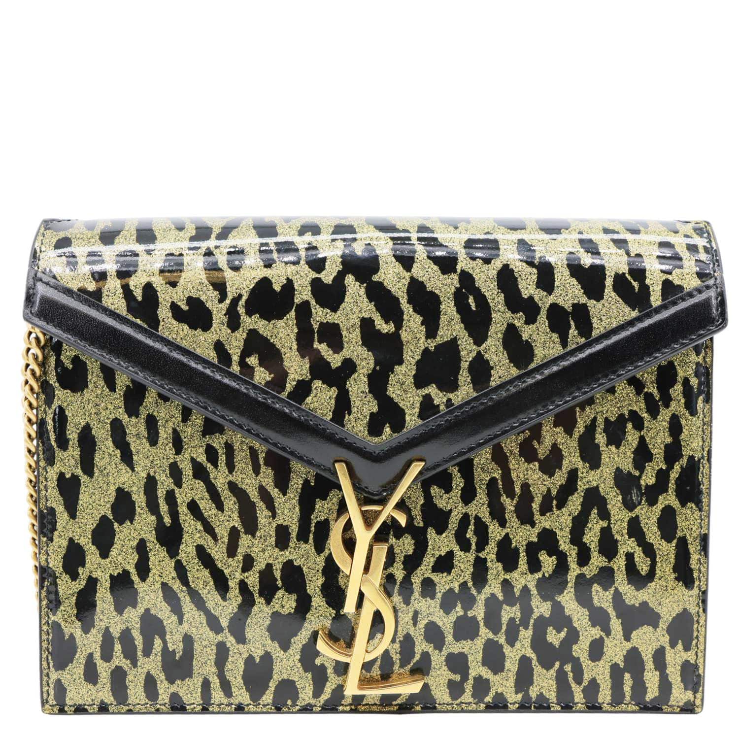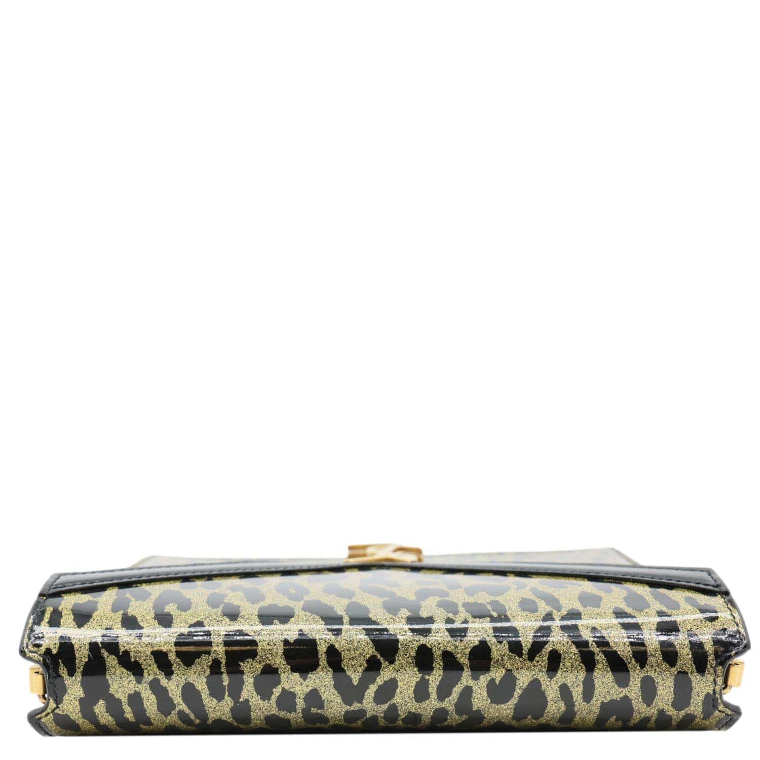 YVES SAINT LAURENT Cassandre Envelope Chain Wallet in gold features a striking leopard print with smooth leather accents. Elegant and compact, it’s perfect for elevating day-to-night looks with bold luxury.
