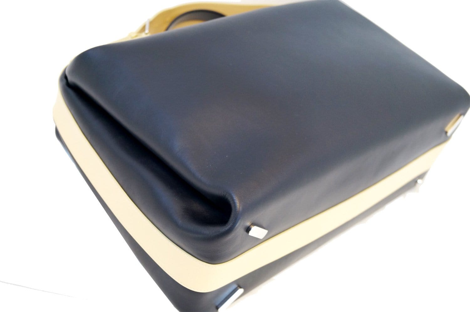 Visible Scratches, rubbed corners, leather tanning darkening. inside stains