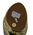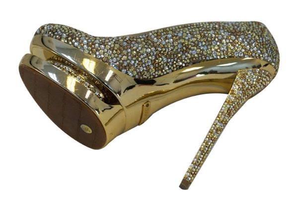 The famous, Swarovski crystal-embellished double platform pump used by many celebrities such as Beyoncé, Nikki Minaj and Adrienne Maloof. Only 7 pairs were made by the company and this is one of them. Gold Gianmarco Lorenzi satin pumps with gold-tone double platforms and multicolor Swarovski crystal embellishment. A must have pumps.