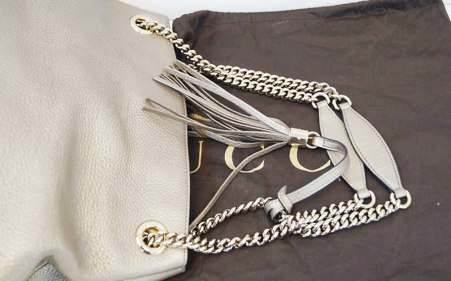 We can always count on Gucci for styles that we love now and later. This gorgeous Gucci Gold Pebbled Calfskin Leather Soho Chain Tote Bag features the iconic bold GG logo embroidered on the front. The bag is made of supple pebbled leather with gunmetal brushed hardware and leather tassel. This beauty has a spacious interior and will hold all of your daily essentials in style.