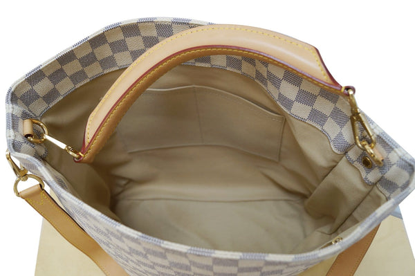 The Soffi is versatile and chic in Damier Azur. It features a rolled leather shoulder strap and a long flat leather strap, both of which can be removed for a unique convertible appeal. The edges of the bag feature a three-part red edge to give this bag a sturdy shape.