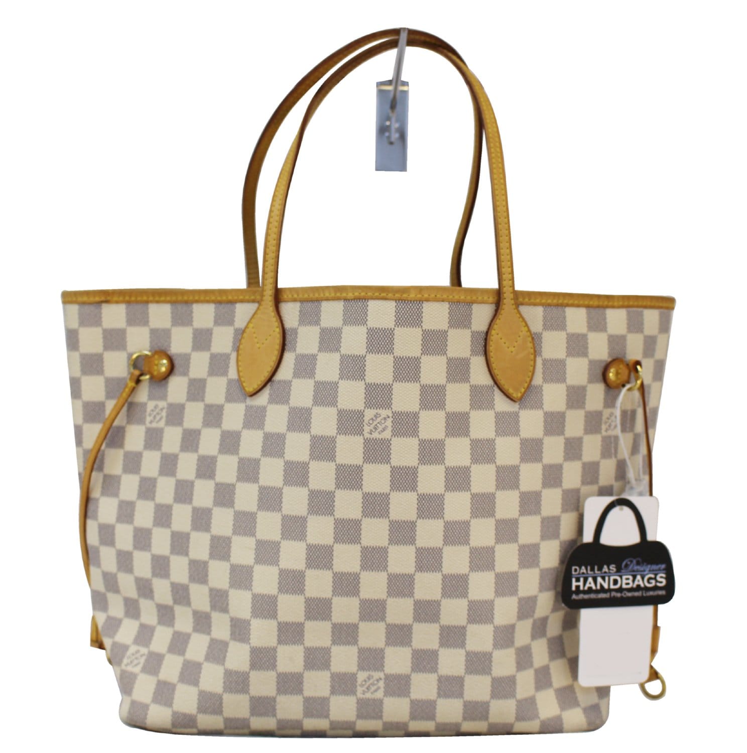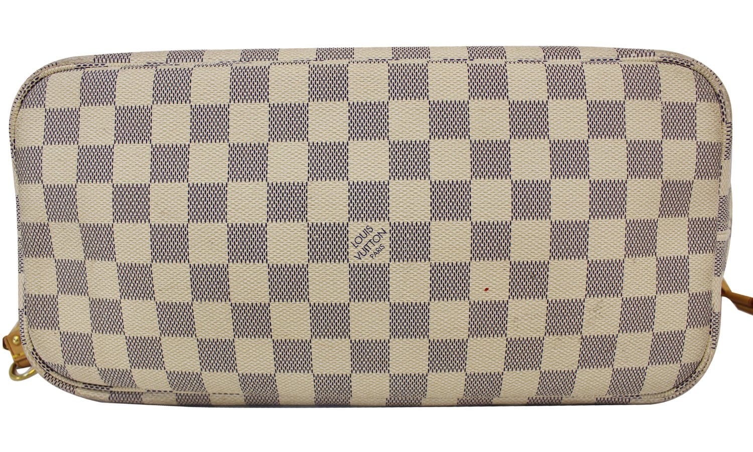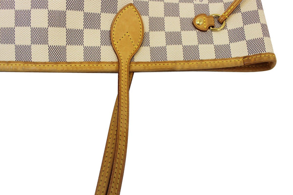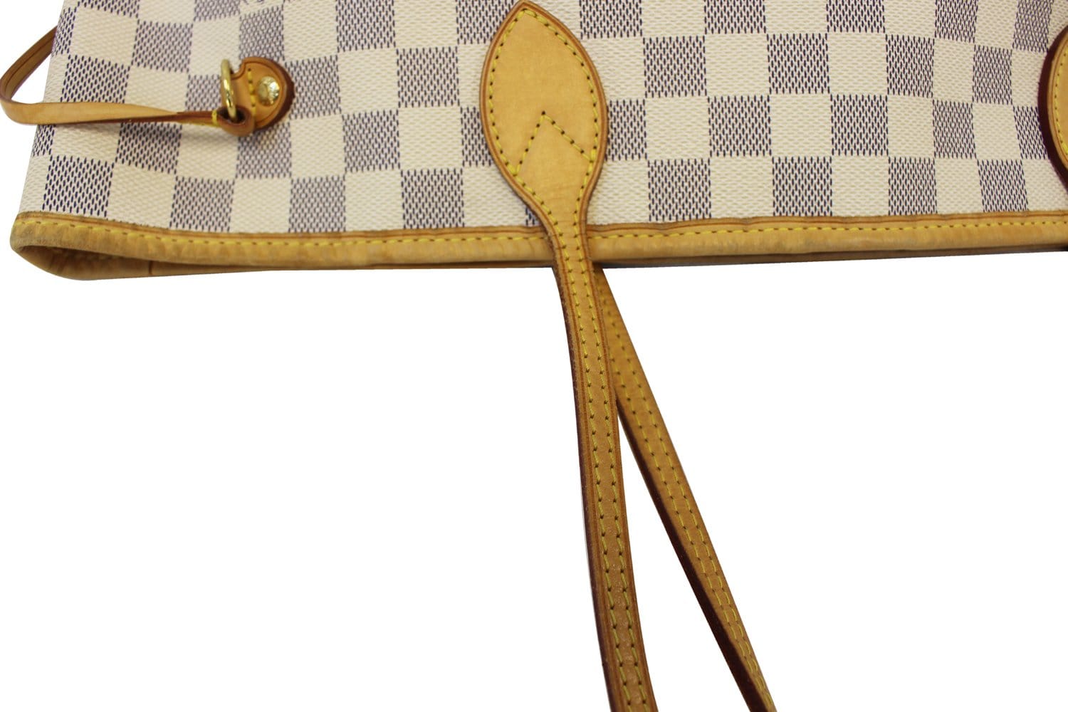 The Louis Vuitton Azur Damier Canvas Neverfull MM bag has fashion and functionality all rolled into one. This MM is the mid-size of the LV Neverfull family. Its roomy capacity, versatility and durability makes it perfect for taking to the office or going shopping. In fact, each of the handles is capable of resisting up to 231 lbs.!