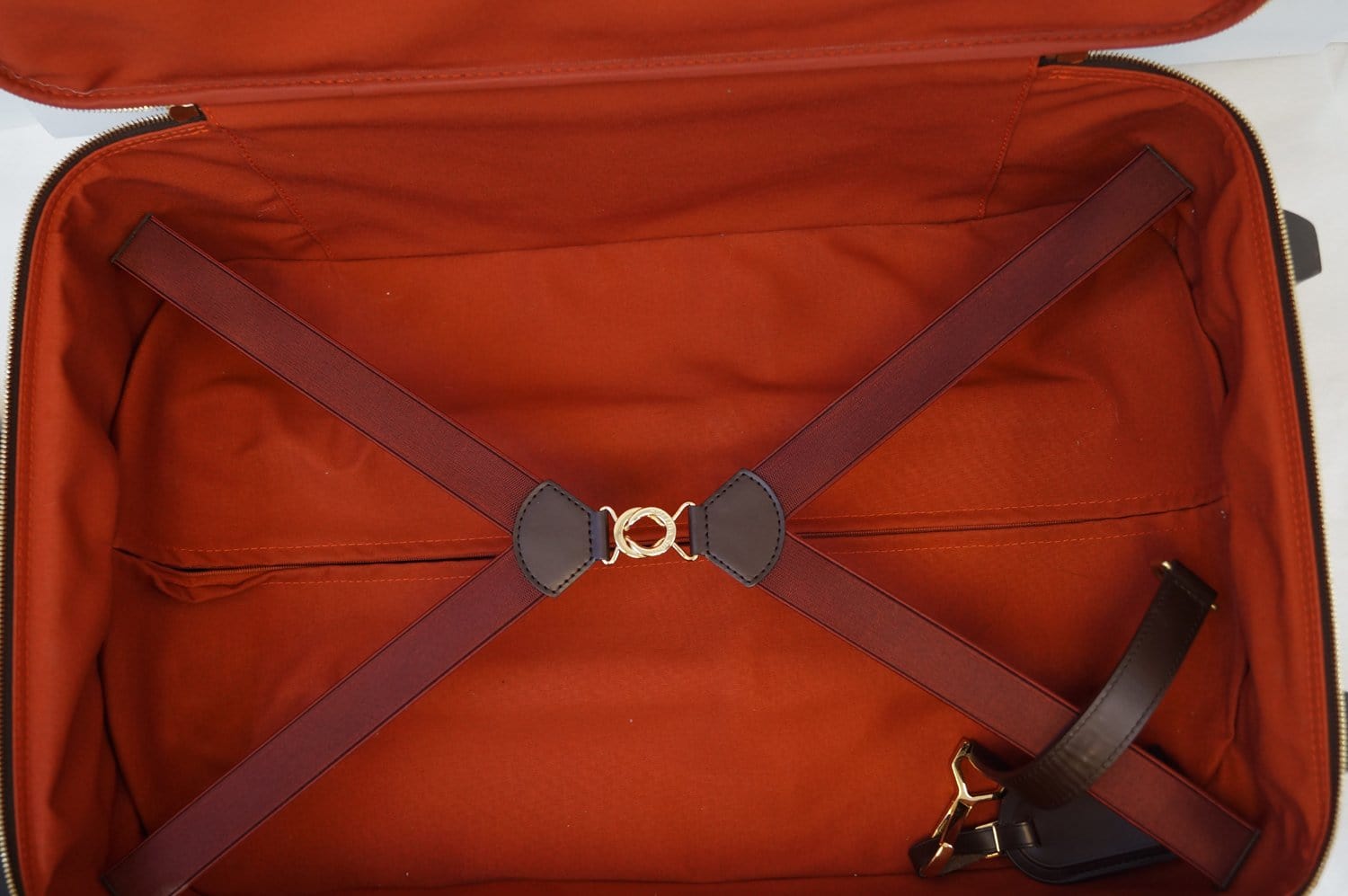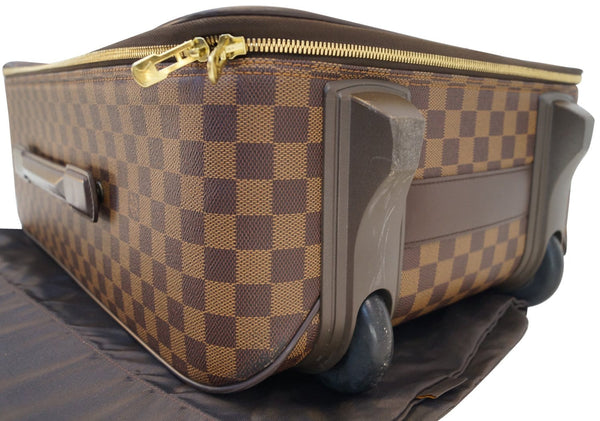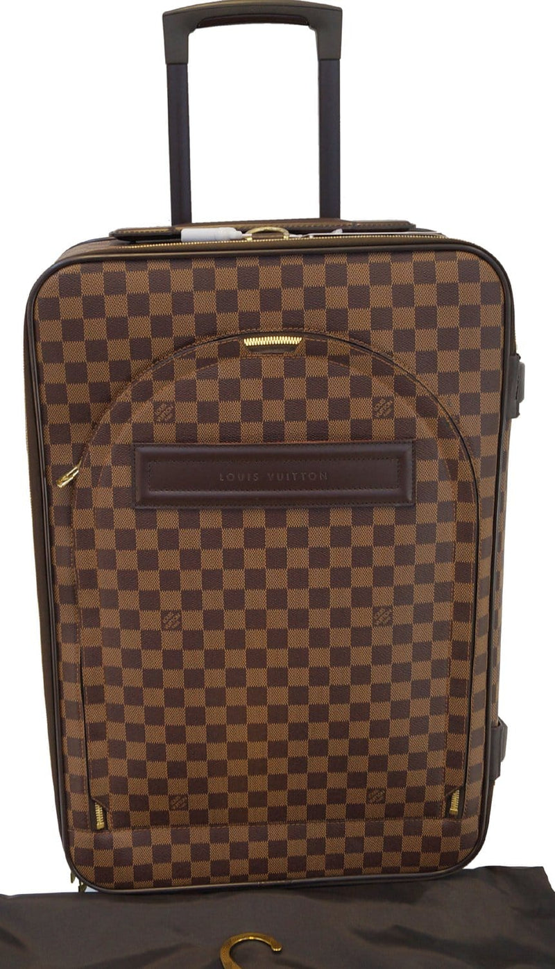 Louis Vuitton has been making world class luggage since 1896 and the Pegase 55 carries on the tradition of style and luxury. Considered by many to be the "world's ultimate carry-on", the Pegase 55 features Louis Vuitton's Damier coated canvas with chocolate brown leather trim. Smooth, noiseless wheels and leather padded retractable handle provide comfort after a long flight. This "Business" version features two extra outer pockets for ultimate organization when traveling on business trips.