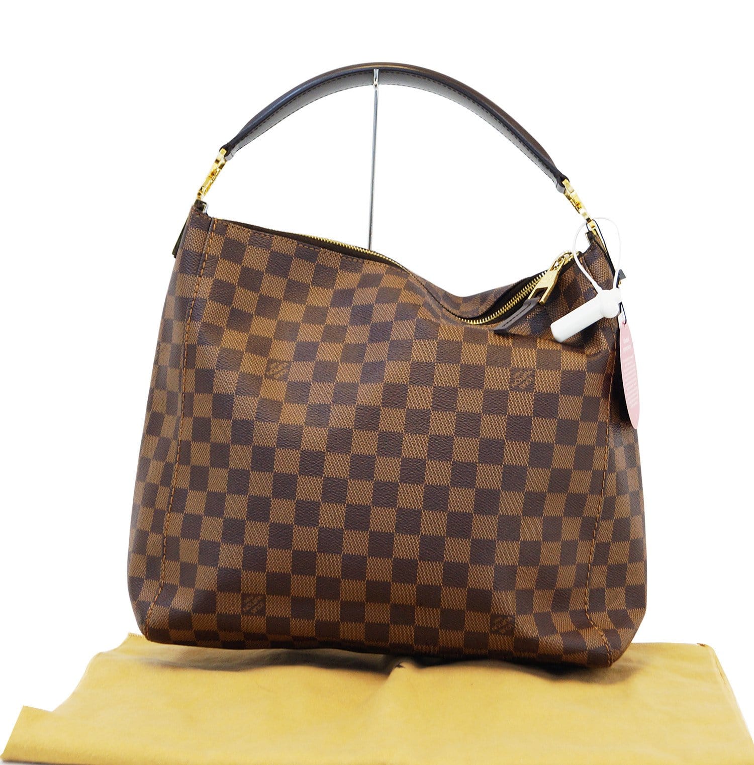 One of the newest creations from the house of Louis Vuitton, the Portobello PM features supple Damier coated canvas and combines functionality with style. It has a generous size for all of your essentials, with a rounded shoulder strap that features hinge-swivel hooks at the bases.