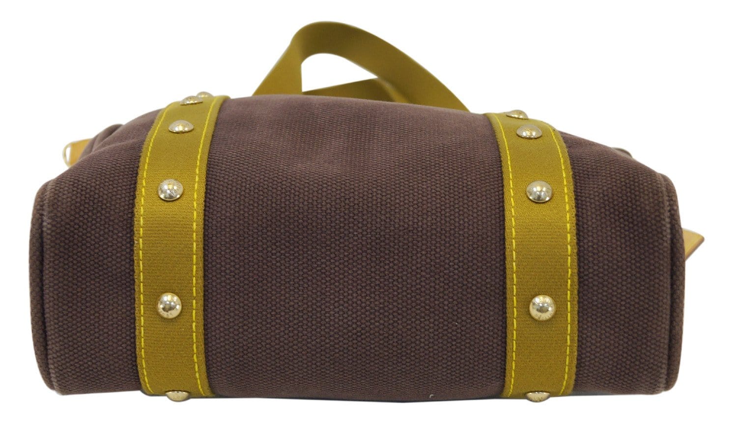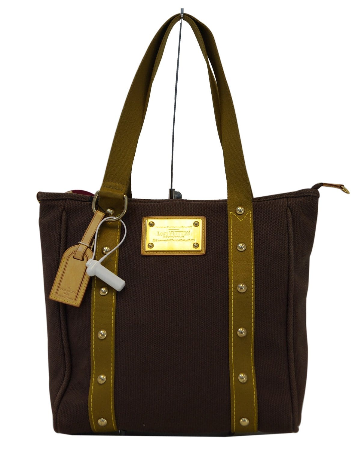An elegant and sophisticated blend makes this rare Louis Vuitton Dark Khaki Canvas Antigua Cabas MM Bag truly desirable. This fabulous canvas tote is the medium MM size and can be carried on the arm or over the shoulder. A golden "Louis Vuitton Inventeur" plaque and studded details add a classy touch to this casual tote.