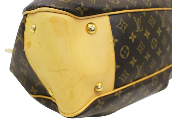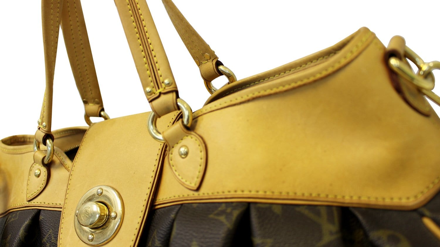 his Louis Vuitton Monogram Canvas Boetie GM is an elegant yet practical bag. This bag has a feminine flair with its pleated details and engraved twist-lock closure. Golden brass studs are found on the bag's bottom side to protect from surface scratches. With its ultra-spacious interior, you will be able to carry all your daily essentials with ease.