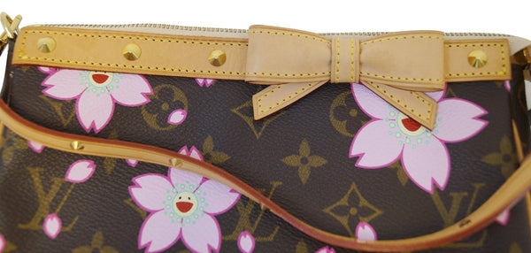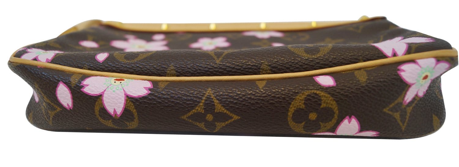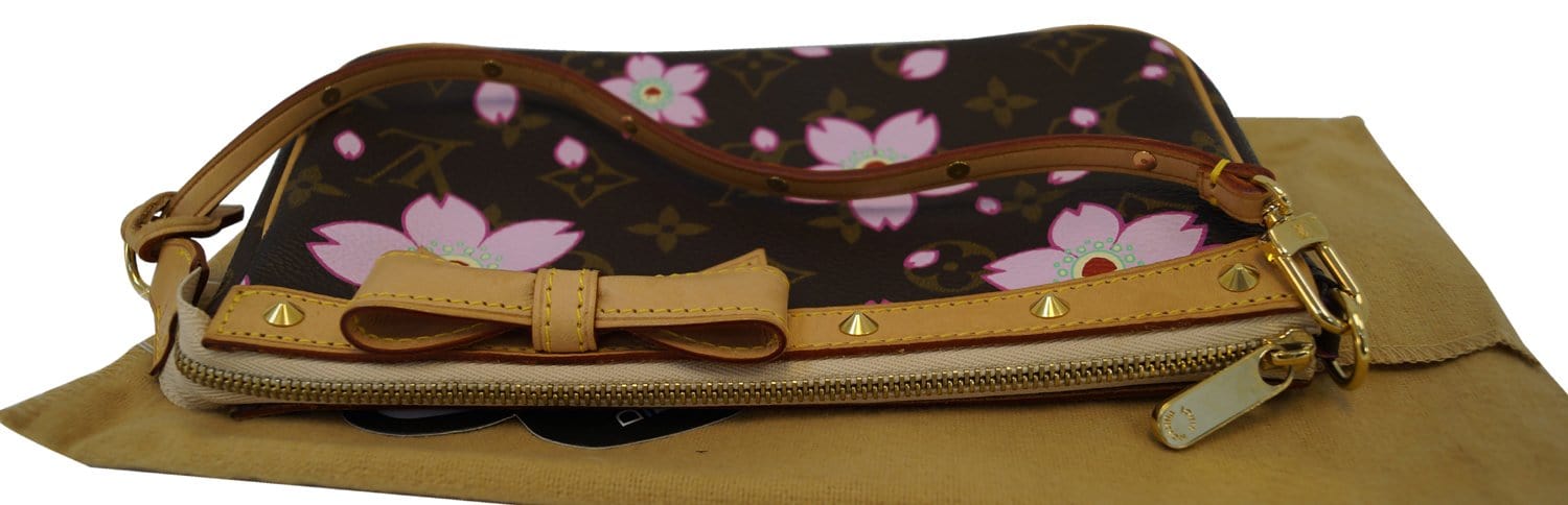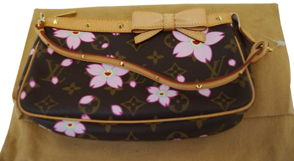 One of Louis Vuitton's most popular styles, this Louis Vuitton Limited Edition Cherry Blossom Monogram Canvas Accessories Pochette Bag is ideal for holding your makeup and daily essentials in an elegant manner. It features an adorable bow, stud details and dark brown coated canvas, splashed with vibrant Japanese cherry blossoms with happy expressions designed by Takashi Murakami. Its versatile shoulder strap can be converted to a wrist strap or removed to be carried as a clutch.