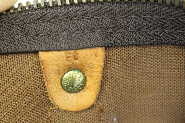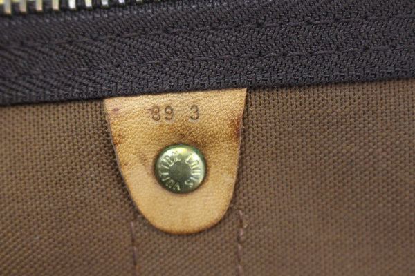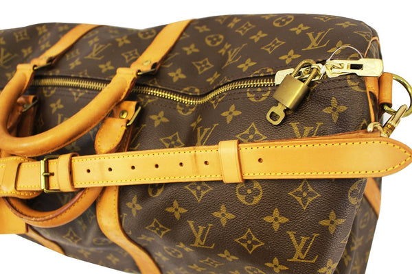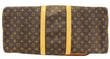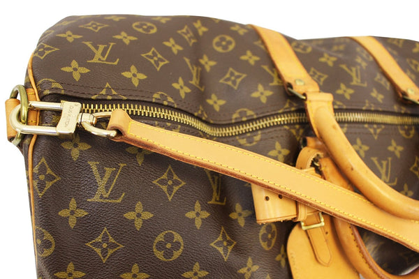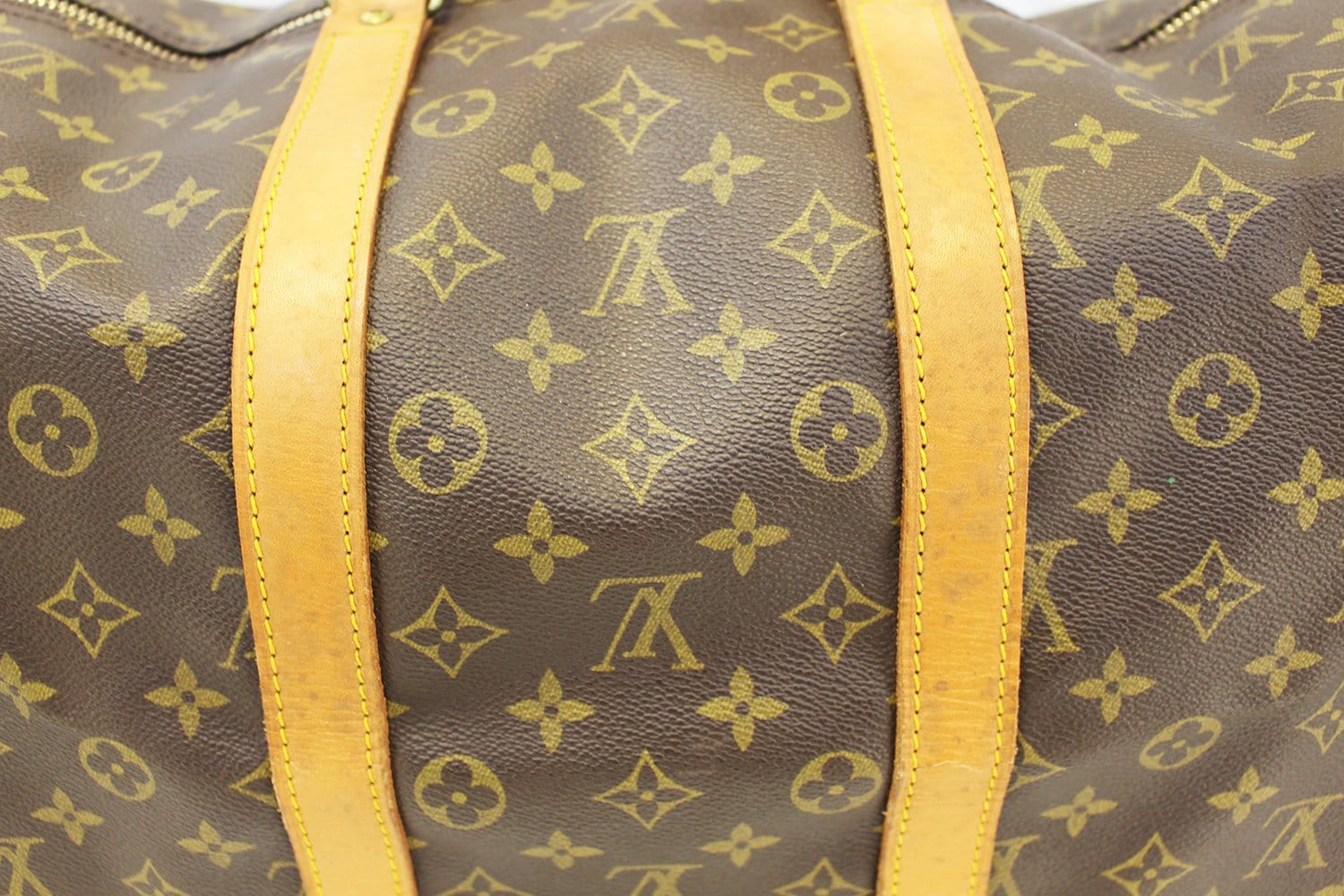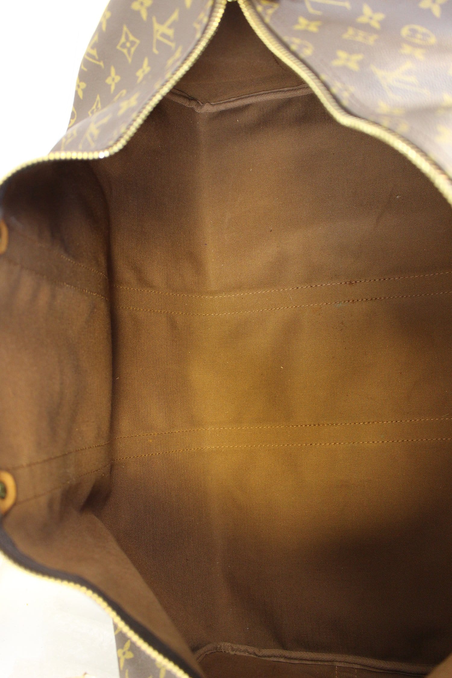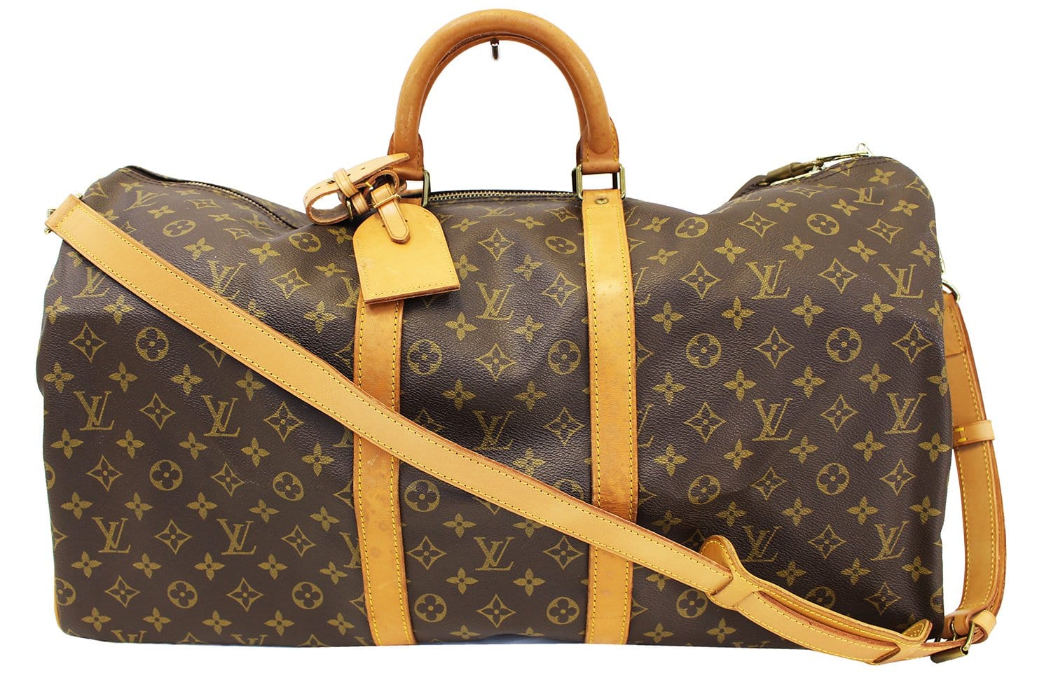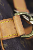 This stylish travel bag is finely crafted of classic Louis Vuitton monogram on coated canvas. The bag features vachetta cowhide rolled and reinforced leather top handles, an optional shoulder strap, trim, and polished brass hardware. The top zipper opens to a spacious brown fabric interior .