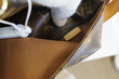 Cowhide leather: Darkened patina/color, gentle scratches, light scuffs on strap and marks.