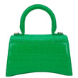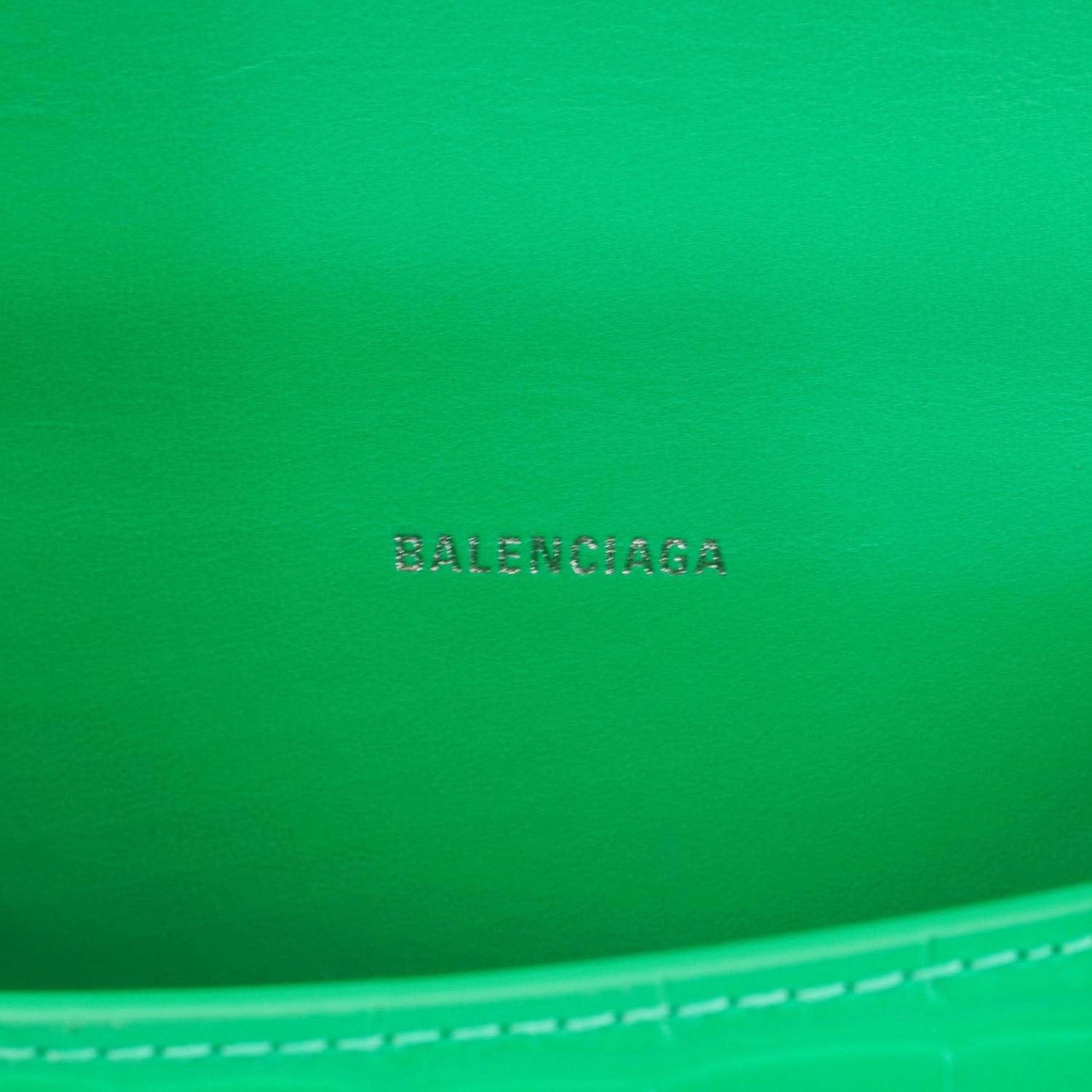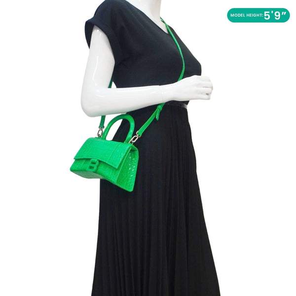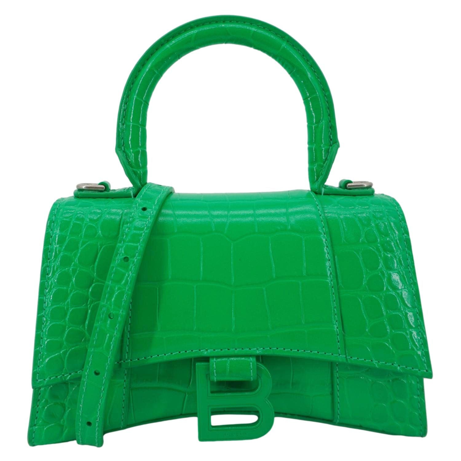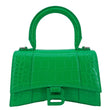 The Balenciaga Hourglass leather tote in green features a sculptural curved silhouette with a structured top handle and detachable crossbody strap. Its bold color and iconic "B" hardware add a modern edge to any look.