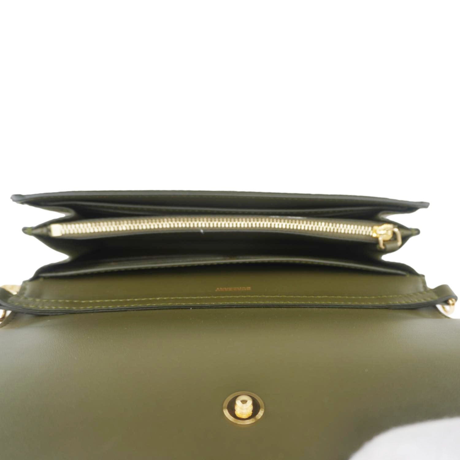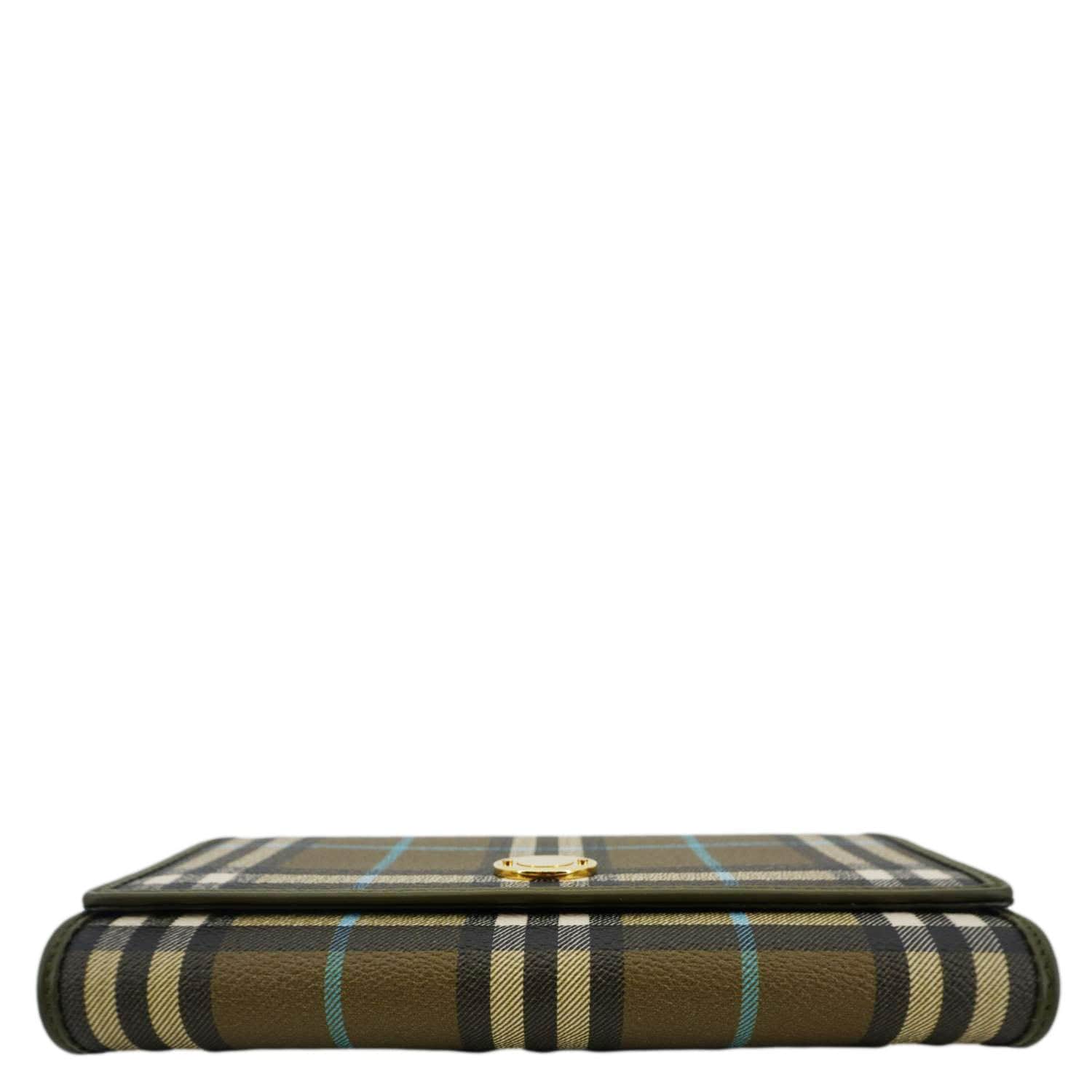 The BURBERRY Check Canvas Chain Crossbody Bag in olive green features the brand's signature check pattern on durable canvas. It offers a chic, compact design with a chain strap, making it a versatile accessory for both casual and evening looks.