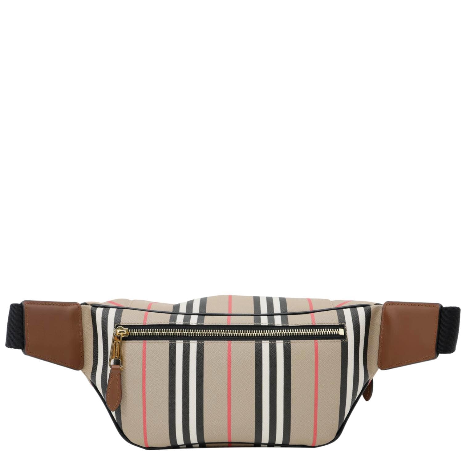 This BURBERRY Sonny E-Canvas Icon Stripe Bumbag in Beige features a durable canvas design with iconic stripes and polished metal hardware. The adjustable clip belt allows for versatile wear, adding a stylish touch to any outfit.