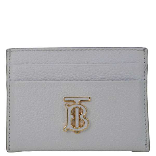 The Burberry TB Leather Card Holder in light blue features a sleek design crafted from smooth leather. Adorned with the iconic Thomas Burberry monogram, it offers elegance and practicality for your daily essentials.