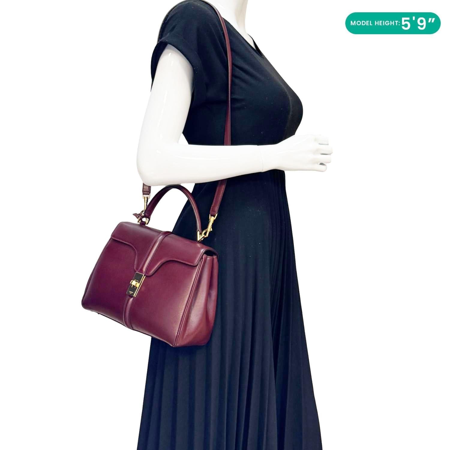 The CELINE 16 Small Top Handle Bag in Burgundy Satinated Leather features a structured, elegant silhouette with a refined satin-like finish. Timeless and sophisticated, it offers dual carry options and signature gold-tone hardware.