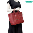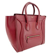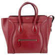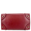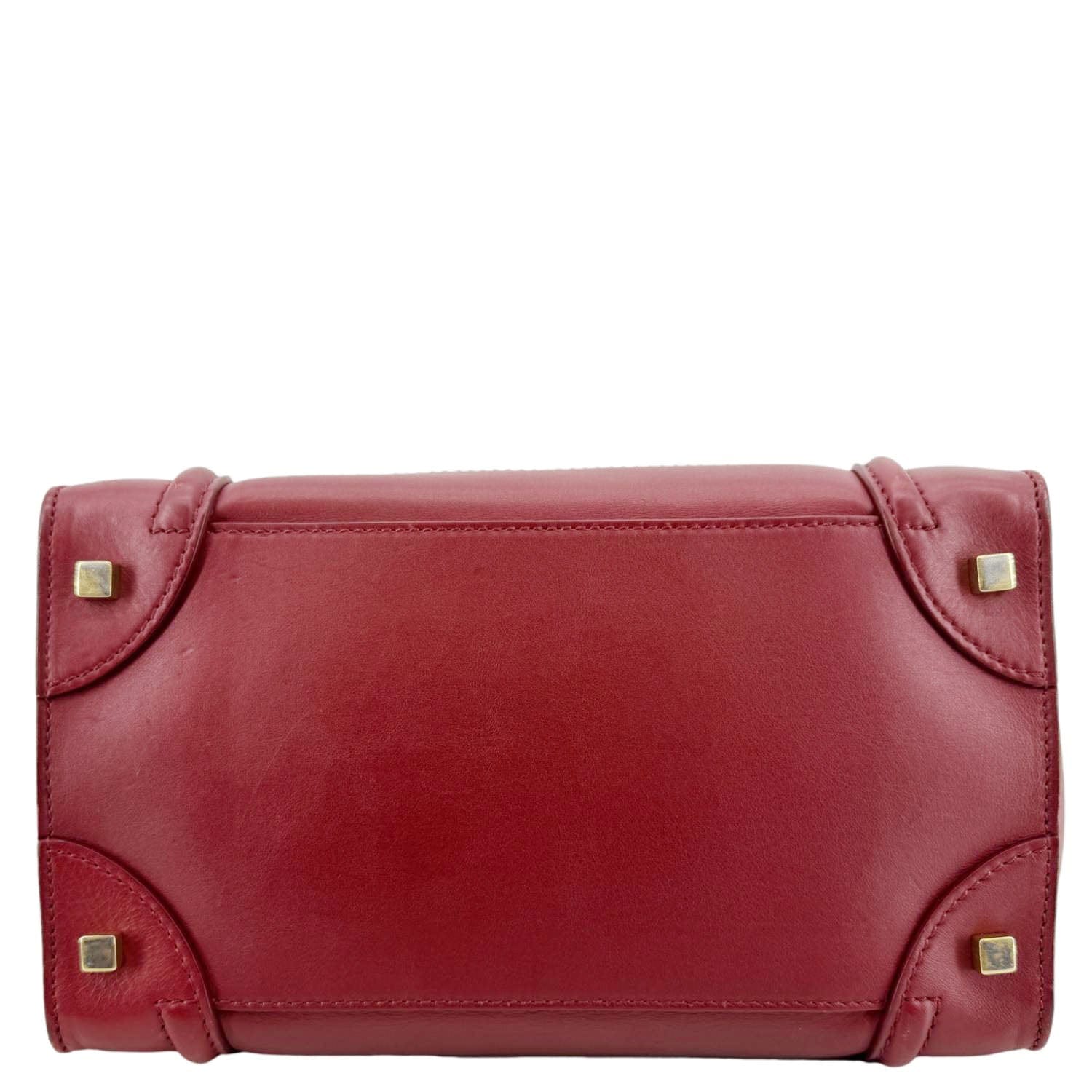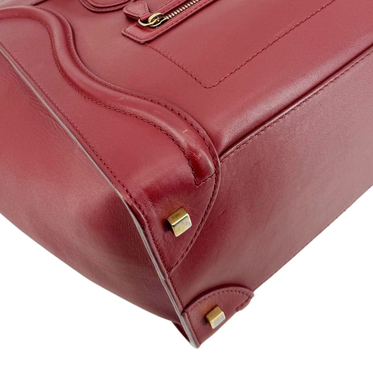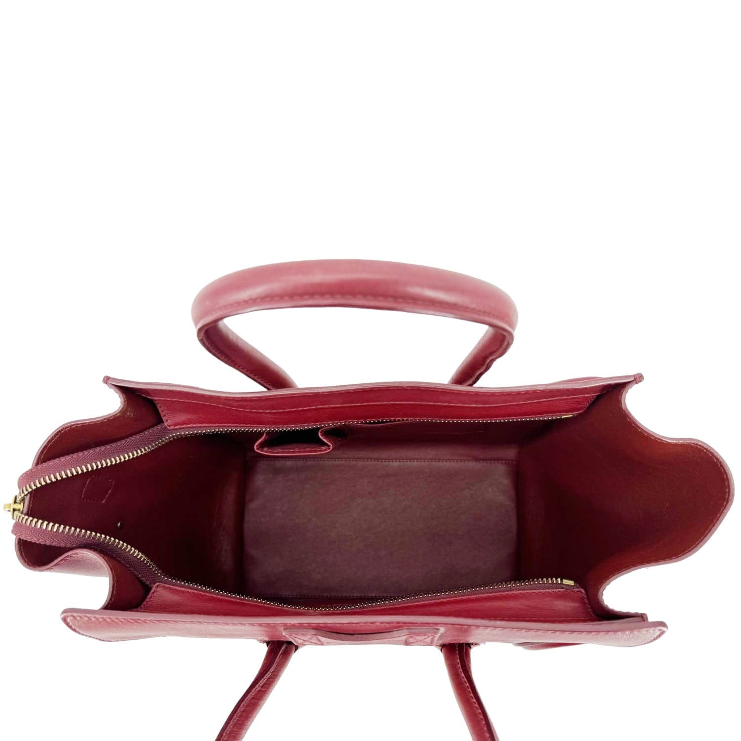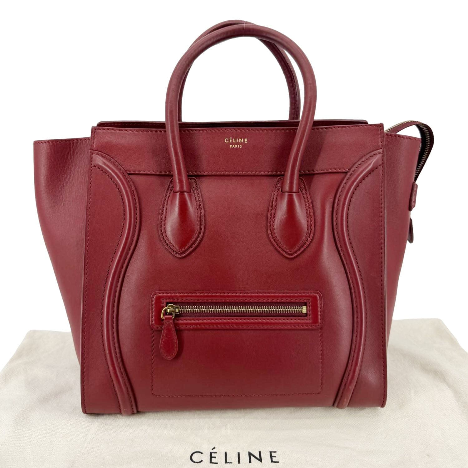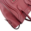 The CELINE Nano Luggage Satchel in rich burgundy leather features the brand's iconic front zip pocket and winged silhouette. Compact yet spacious, it's perfect for elevating your everyday ensemble with a touch of luxury.