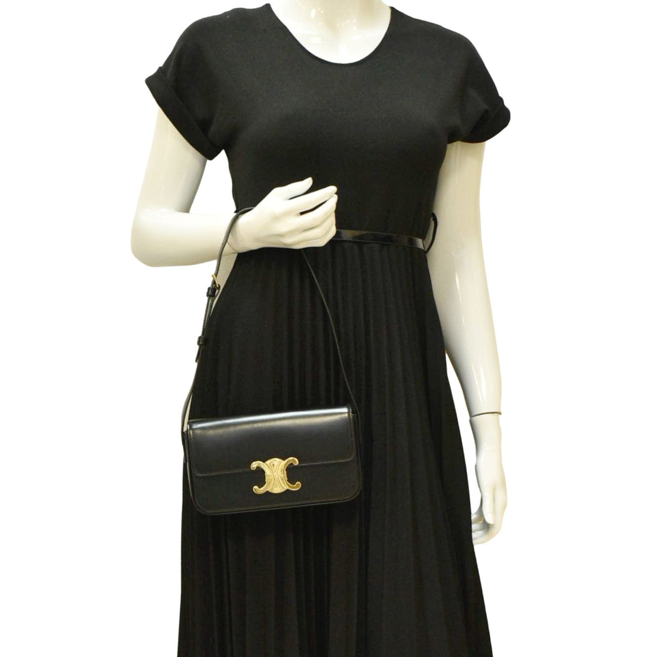 The CELINE Triomphe Calfskin Leather Shoulder Bag is black and features a sleek design with high-quality calfskin leather and the signature Triomphe emblem. This elegant and versatile bag is perfect for both casual and formal occasions.