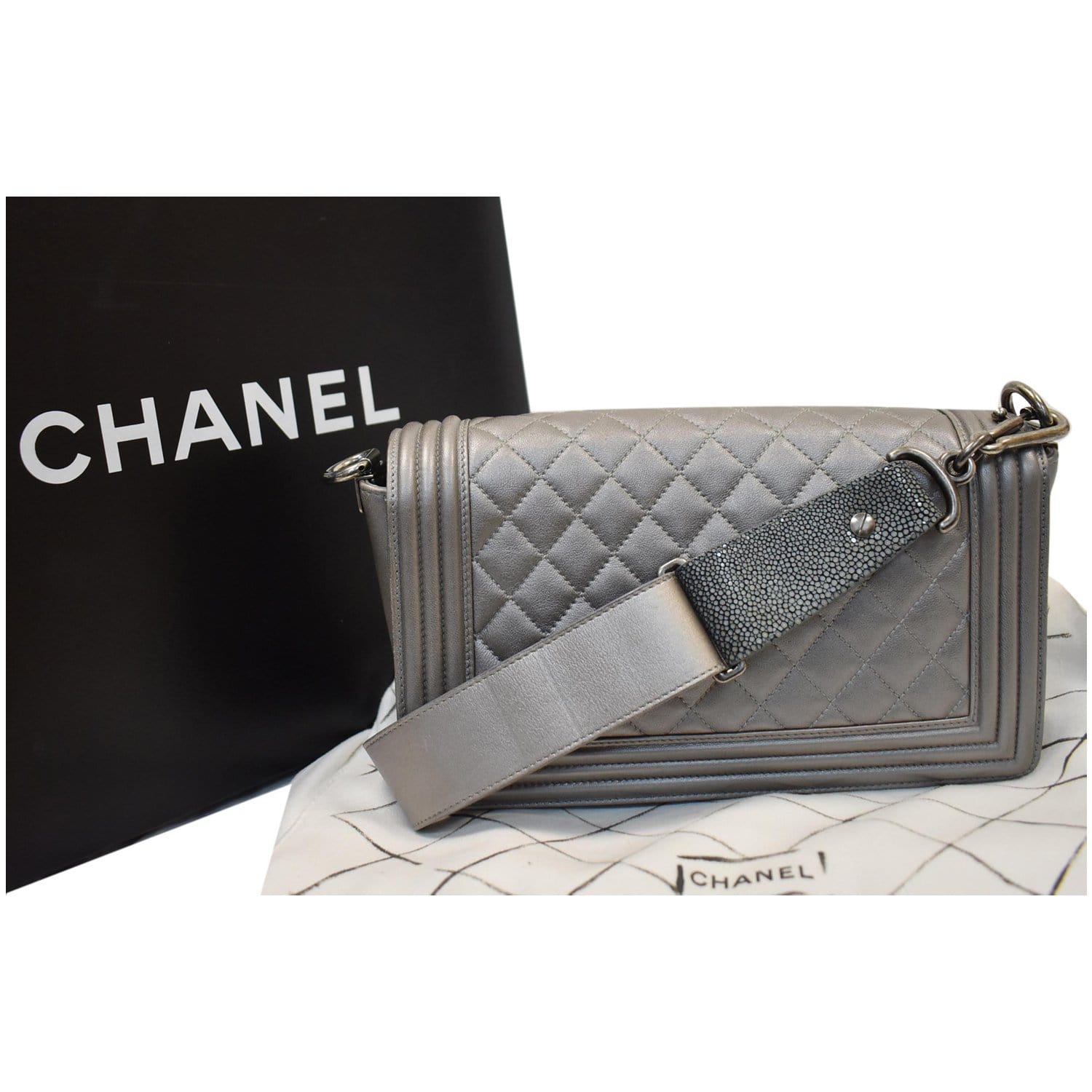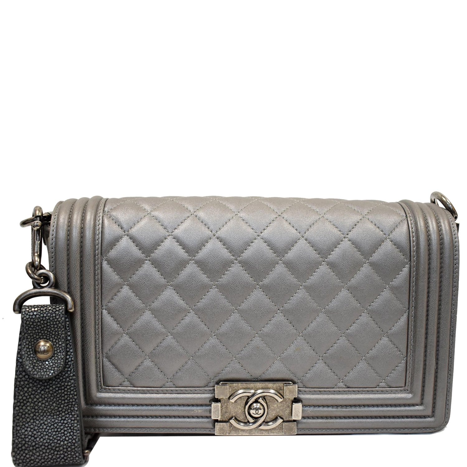 CHANEL Boy Flap with Stingray Lambskin Leather Shoulder Bag Silver