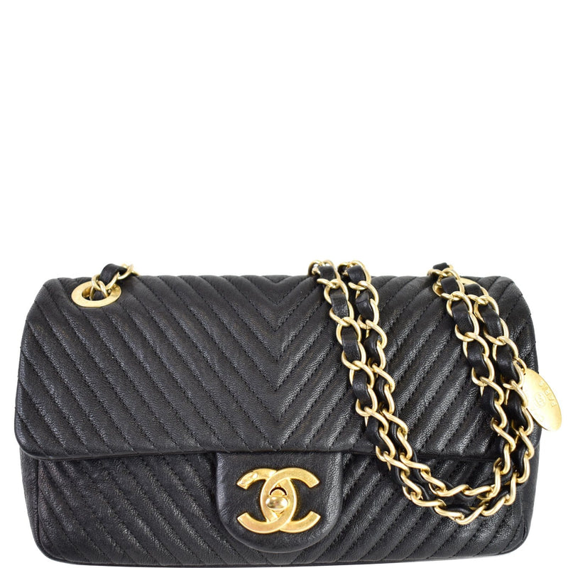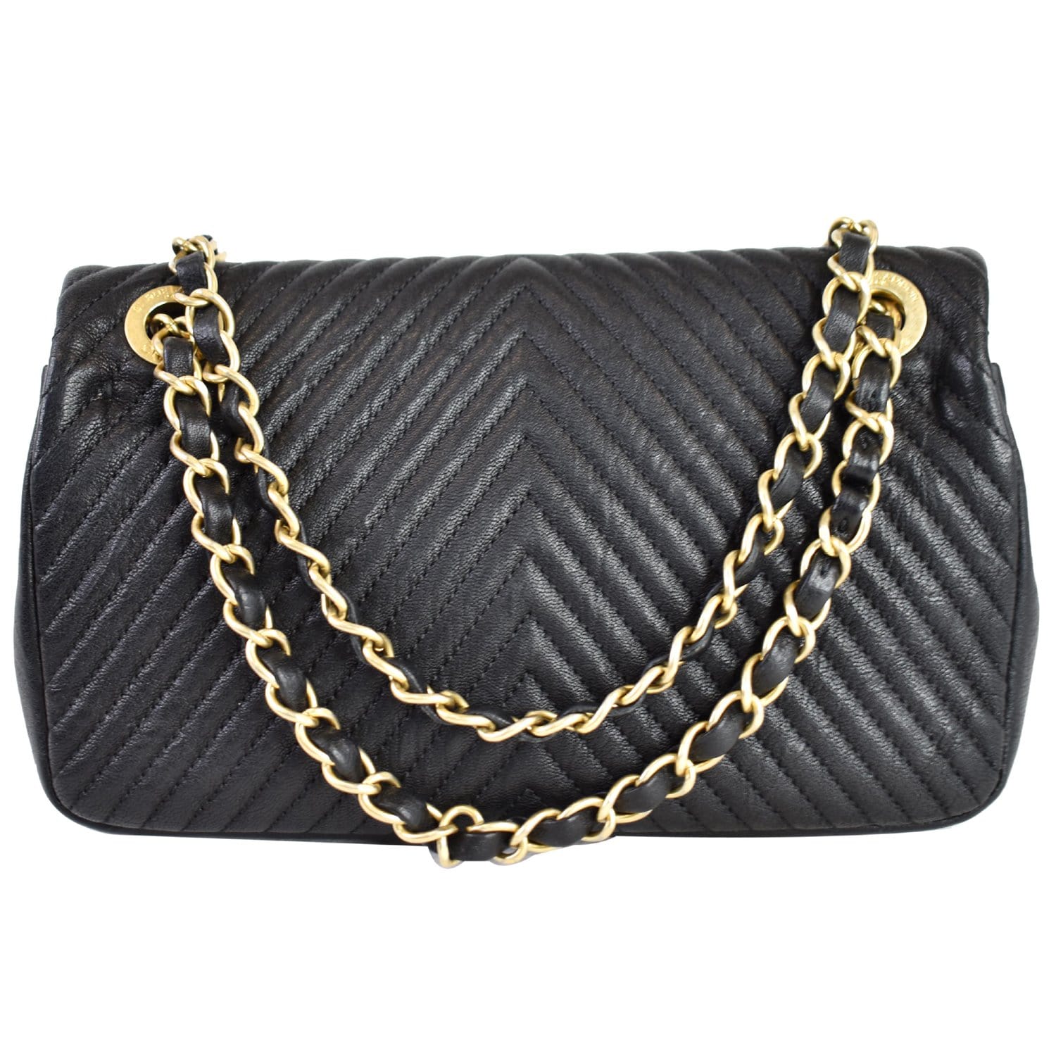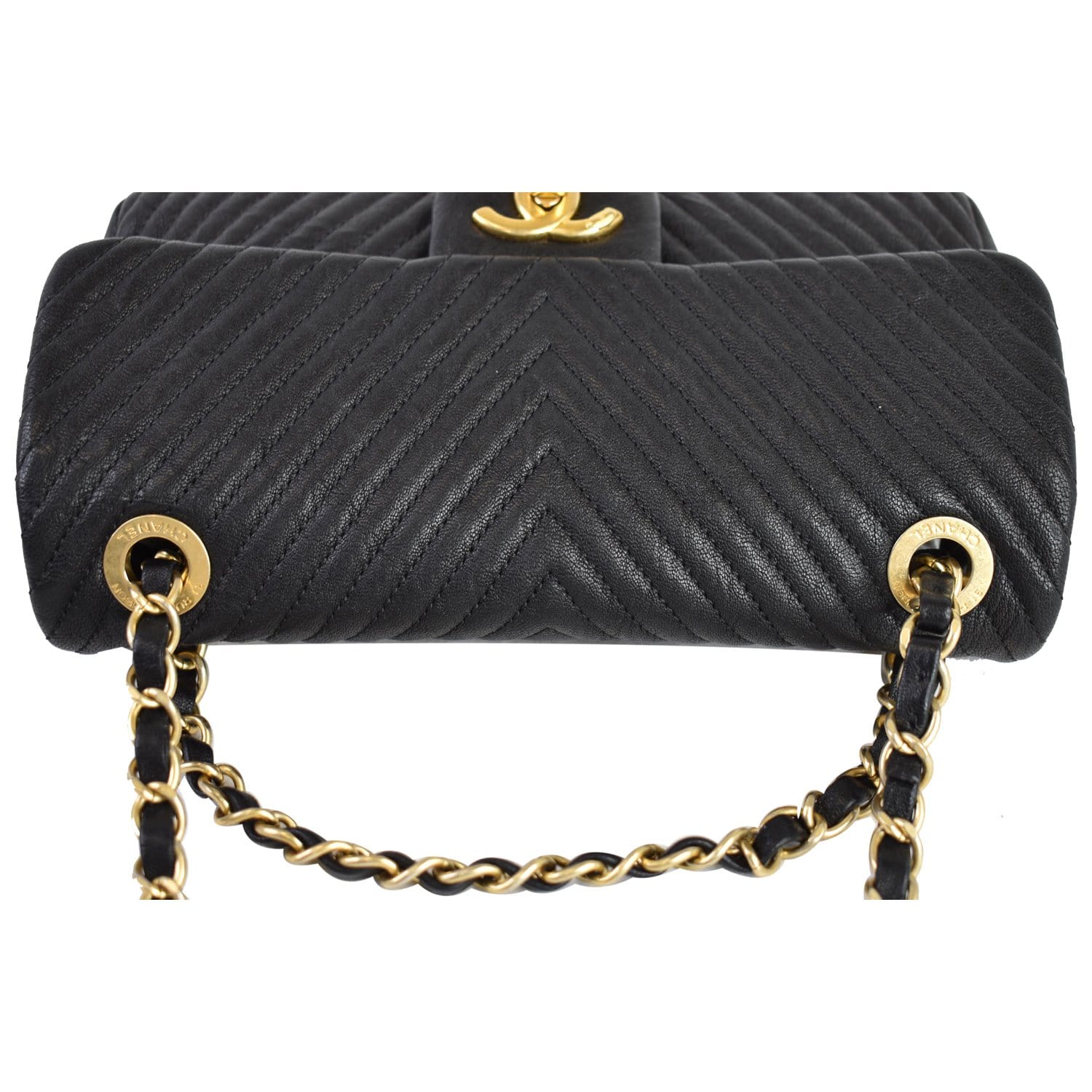 CHANEL Surpique Chevron Calfskin Classic Flap Shoulder Bag Black
