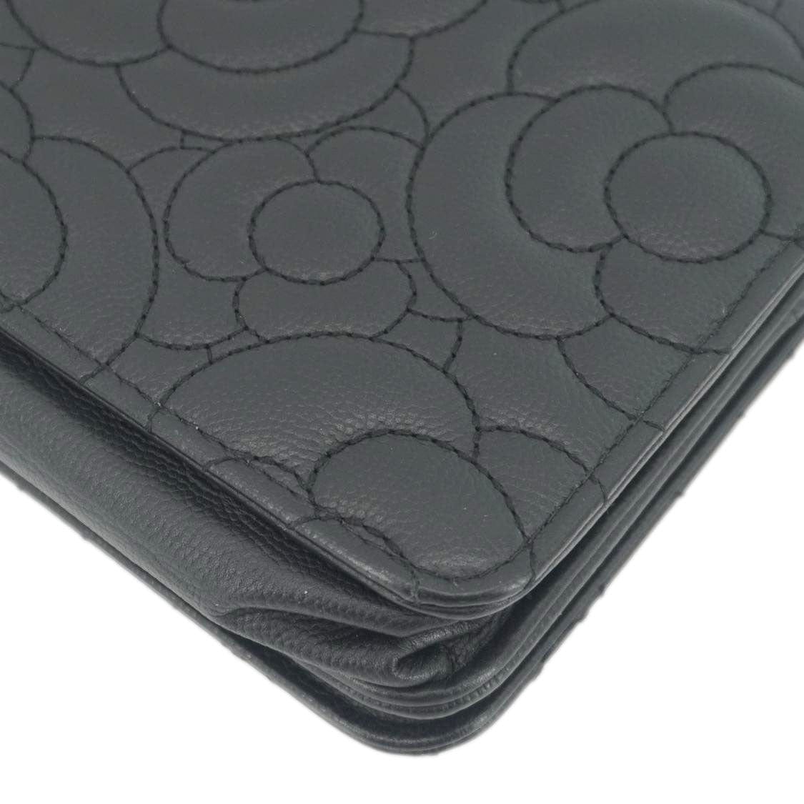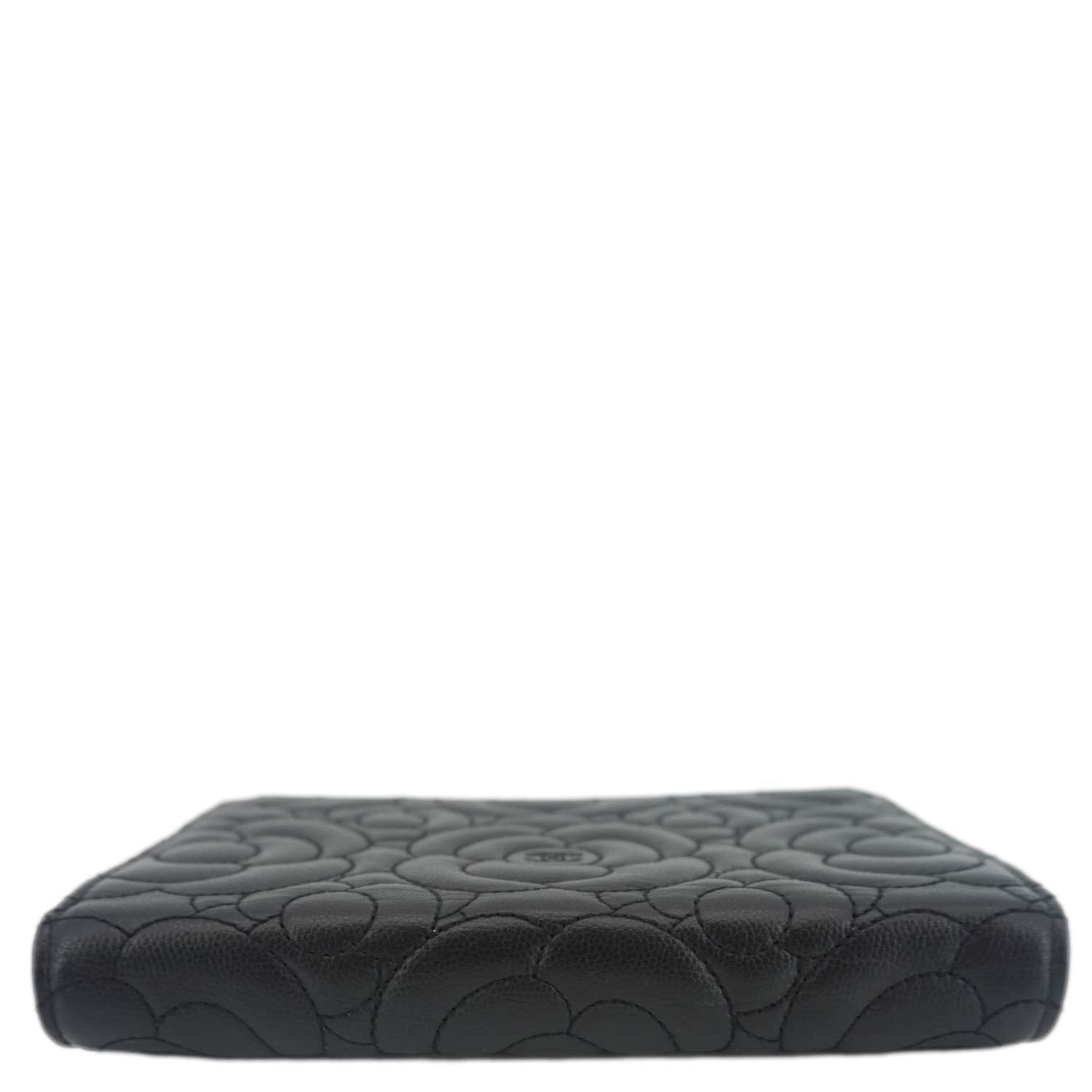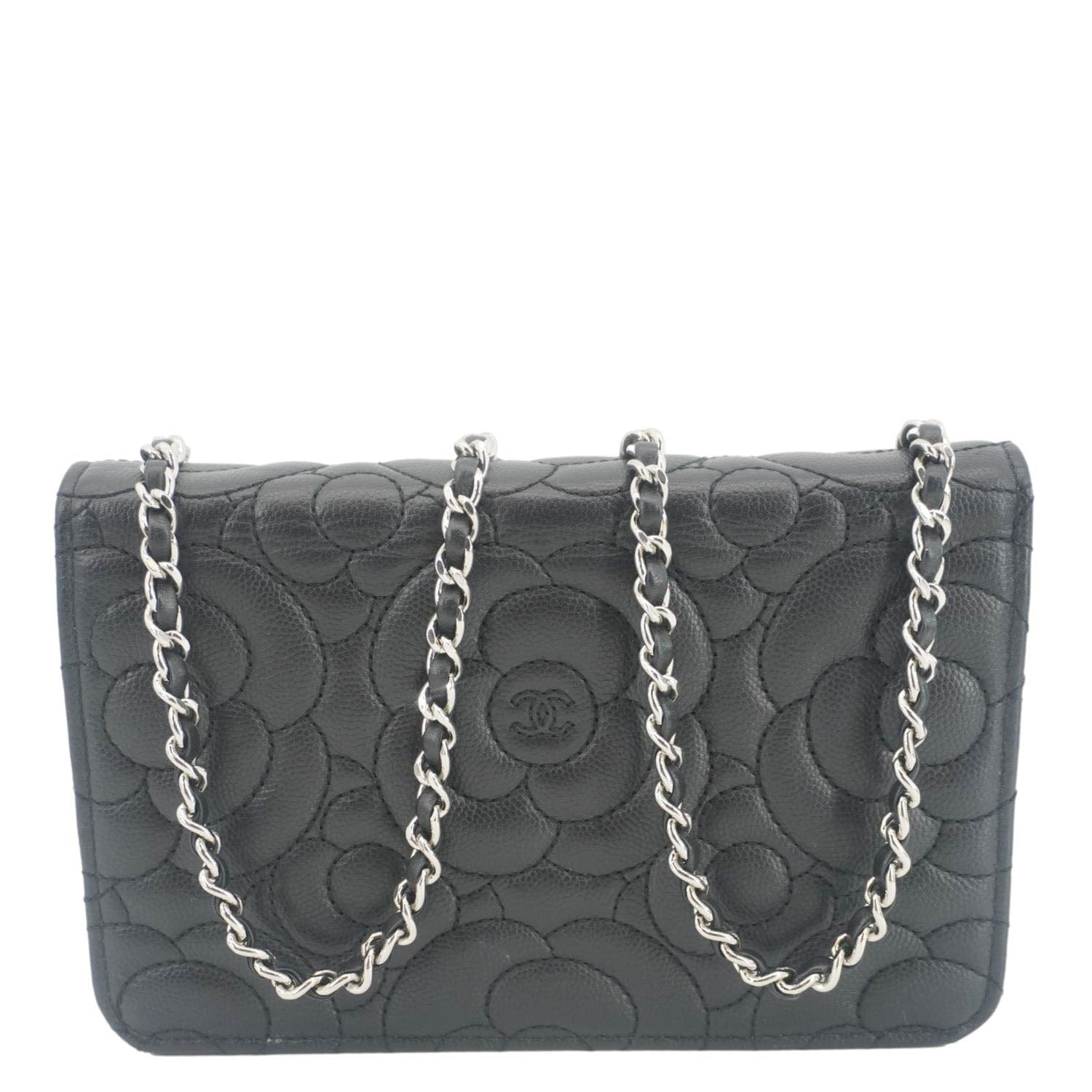This wallet on chain features luxurious black caviar leather with an embossed camellia pattern. The iconic CC logo adds a classic touch to the elegant design. Compact yet versatile for day-to-night styling.