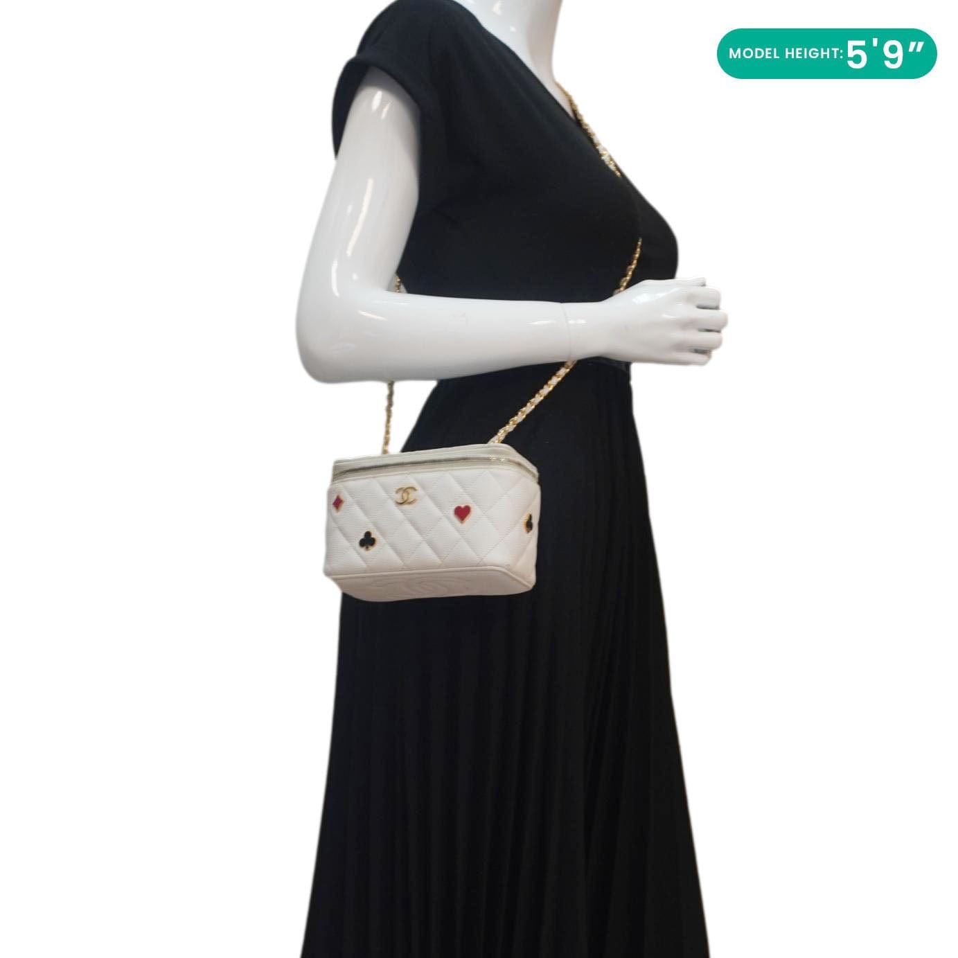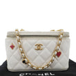 The Chanel Coco Casino Small Vanity Case in white quilted caviar leather features gold-tone hardware, enameled charms, and a playful yet elegant design. With a chain strap and zip-around closure, it's perfect for stylish, compact storage on the go.