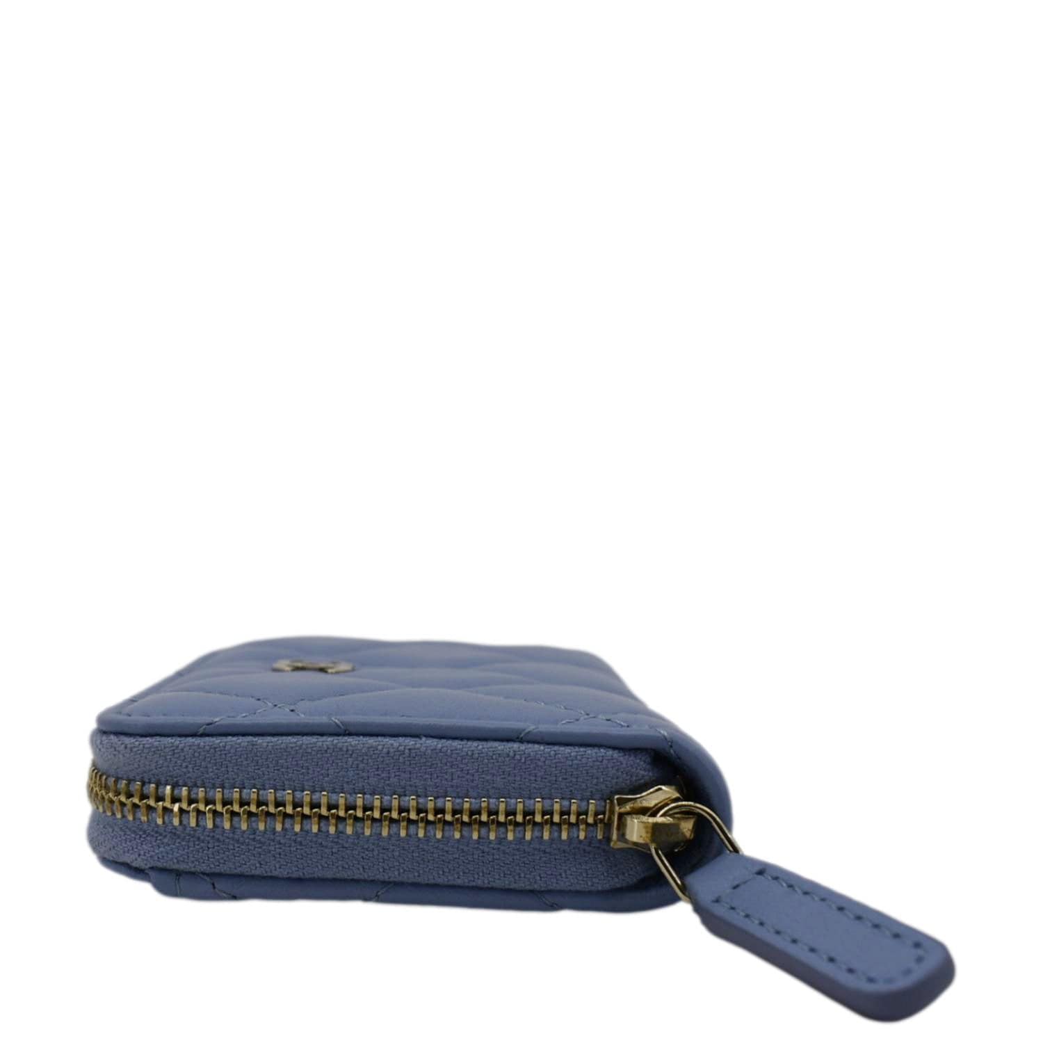 The Chanel Classic Zipped Quilted Leather Coin Purse in Light Blue is a stylish and compact accessory crafted from quilted leather. It features a prominent CC logo, a secure zip-around closure, and a smooth blue leather interior for organizing coins and small essentials with elegance and ease.