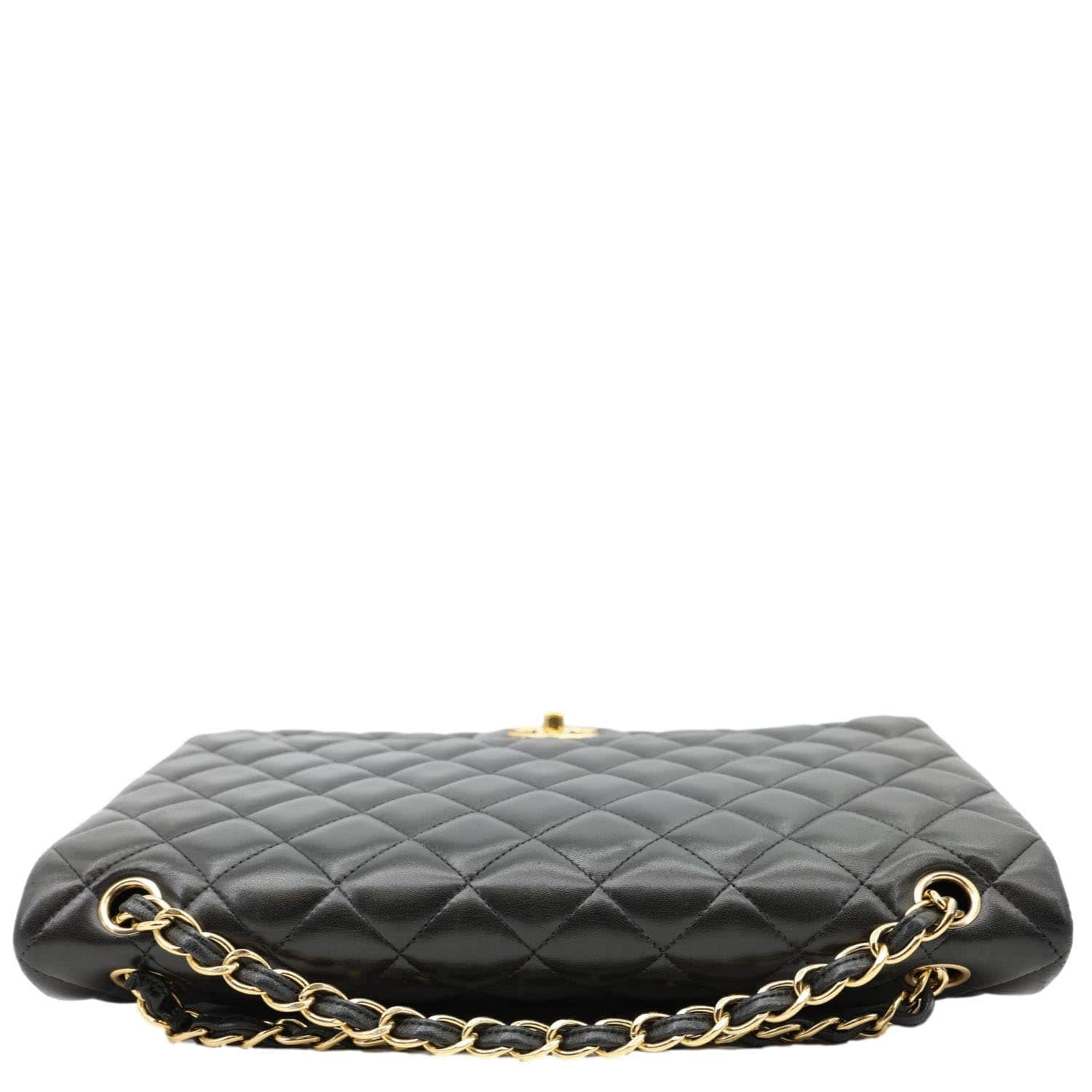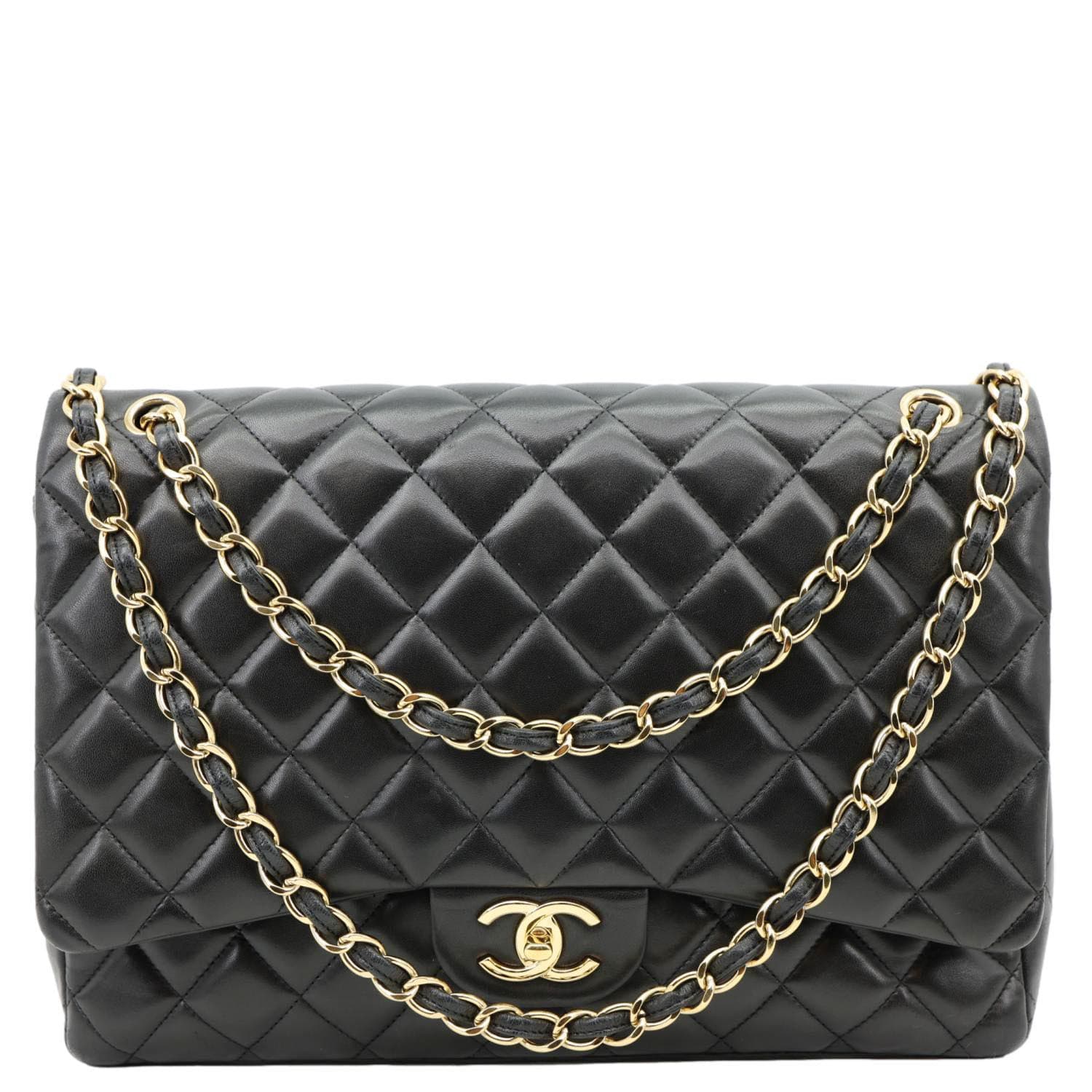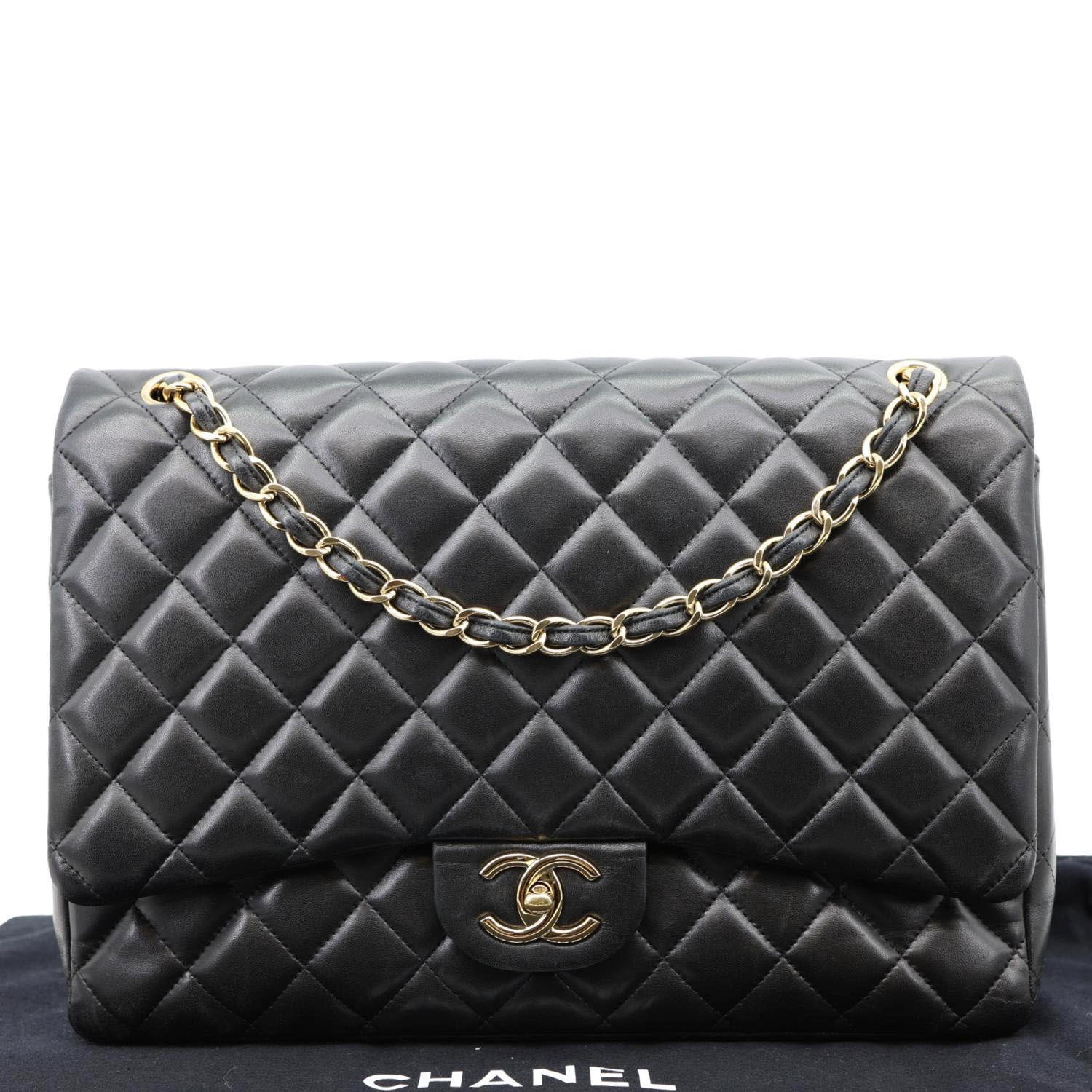 CHANEL Maxi Classic Double Flap Calfskin Leather Shoulder Bag Black features diamond-quilted calfskin leather with signature CC turn-lock closure. Finished with a leather-woven chain strap and spacious interior for timeless elegance.