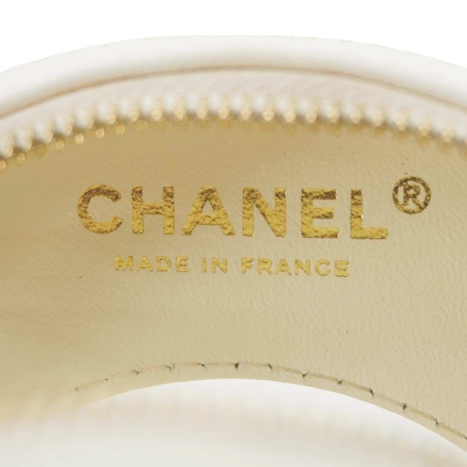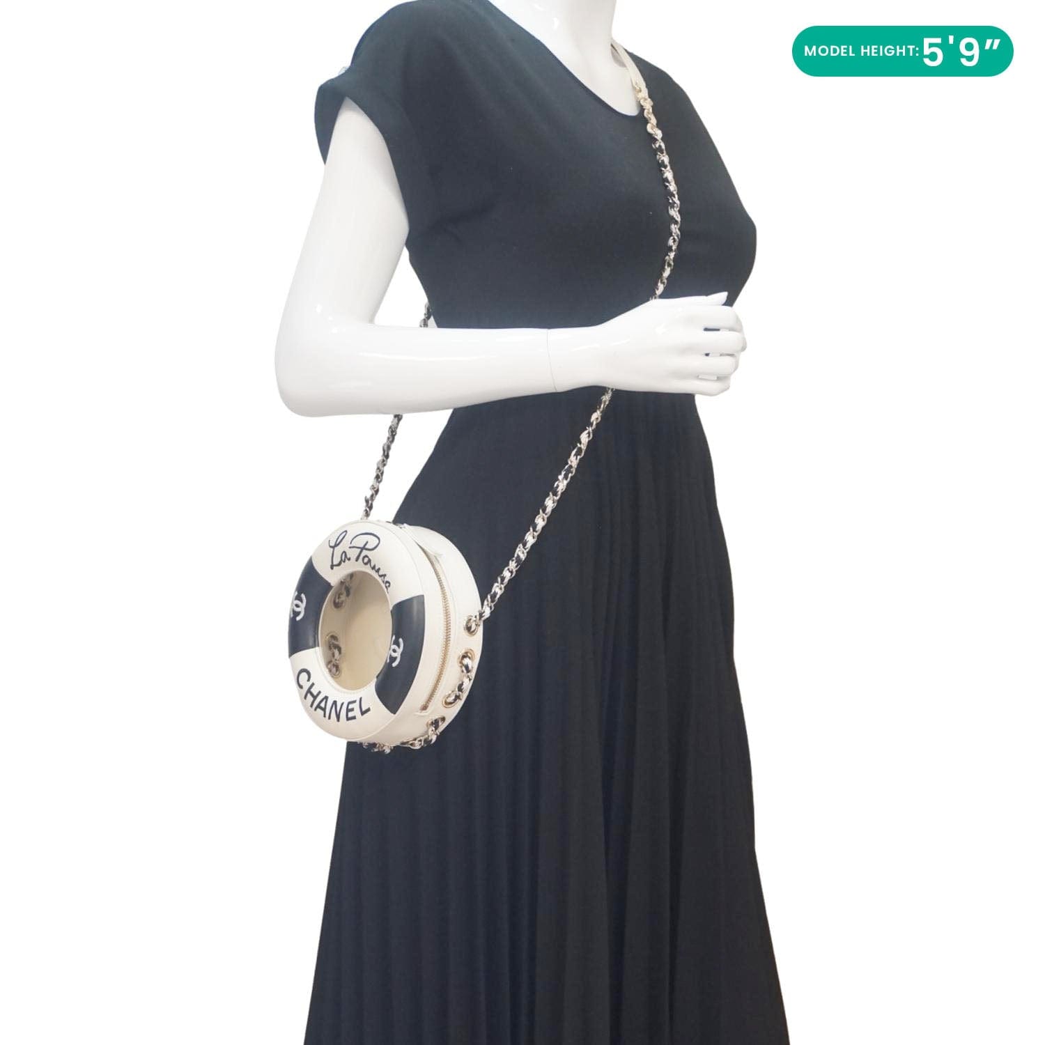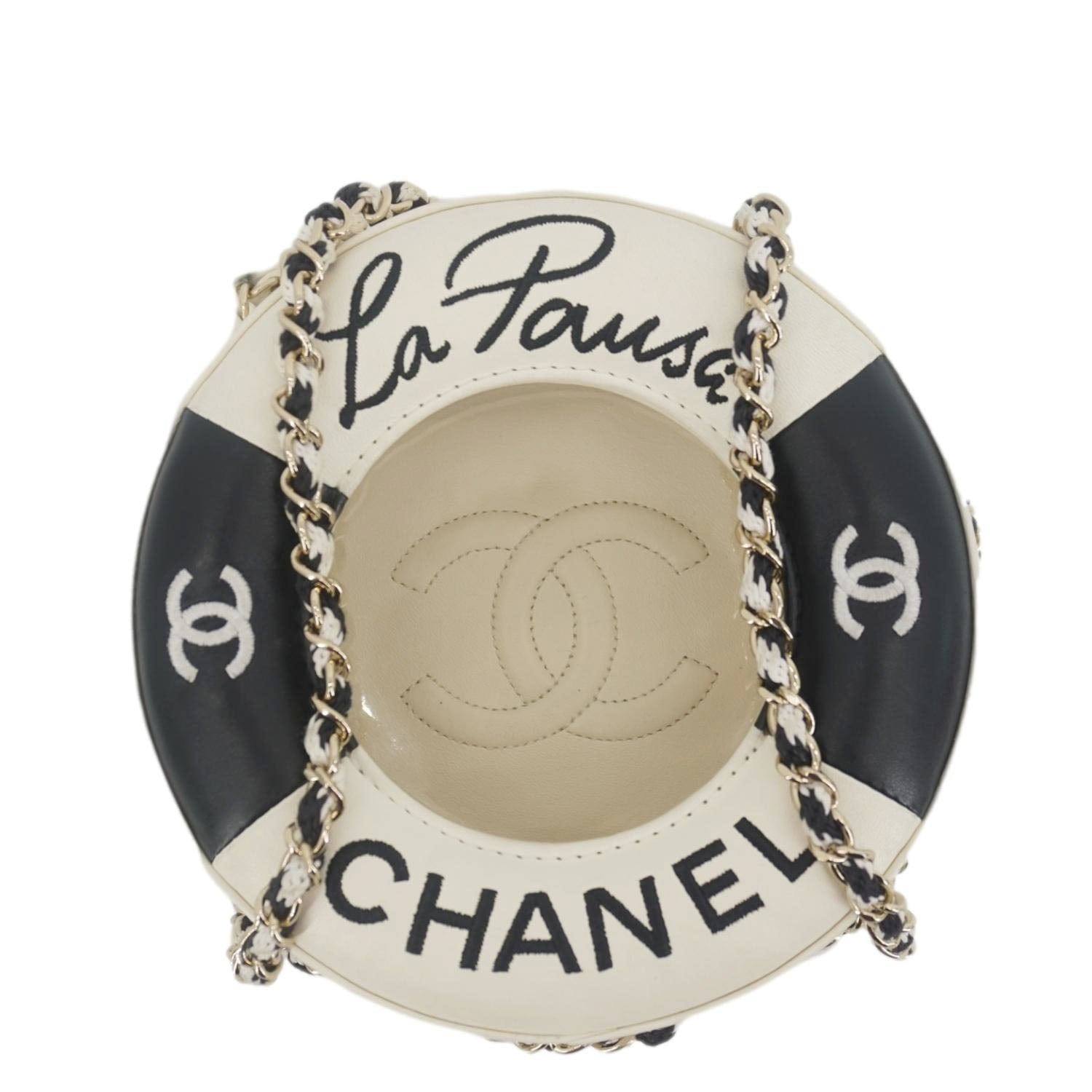 The Chanel Coco Lifesaver round bag in white leather features a unique circular design with a quilted pattern and silver-tone CC detailing. Its compact shape and chain strap offer a chic, nautical-inspired look.