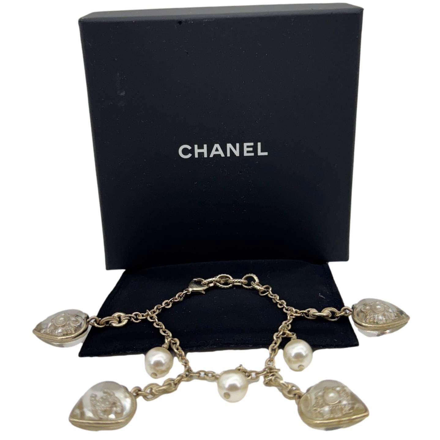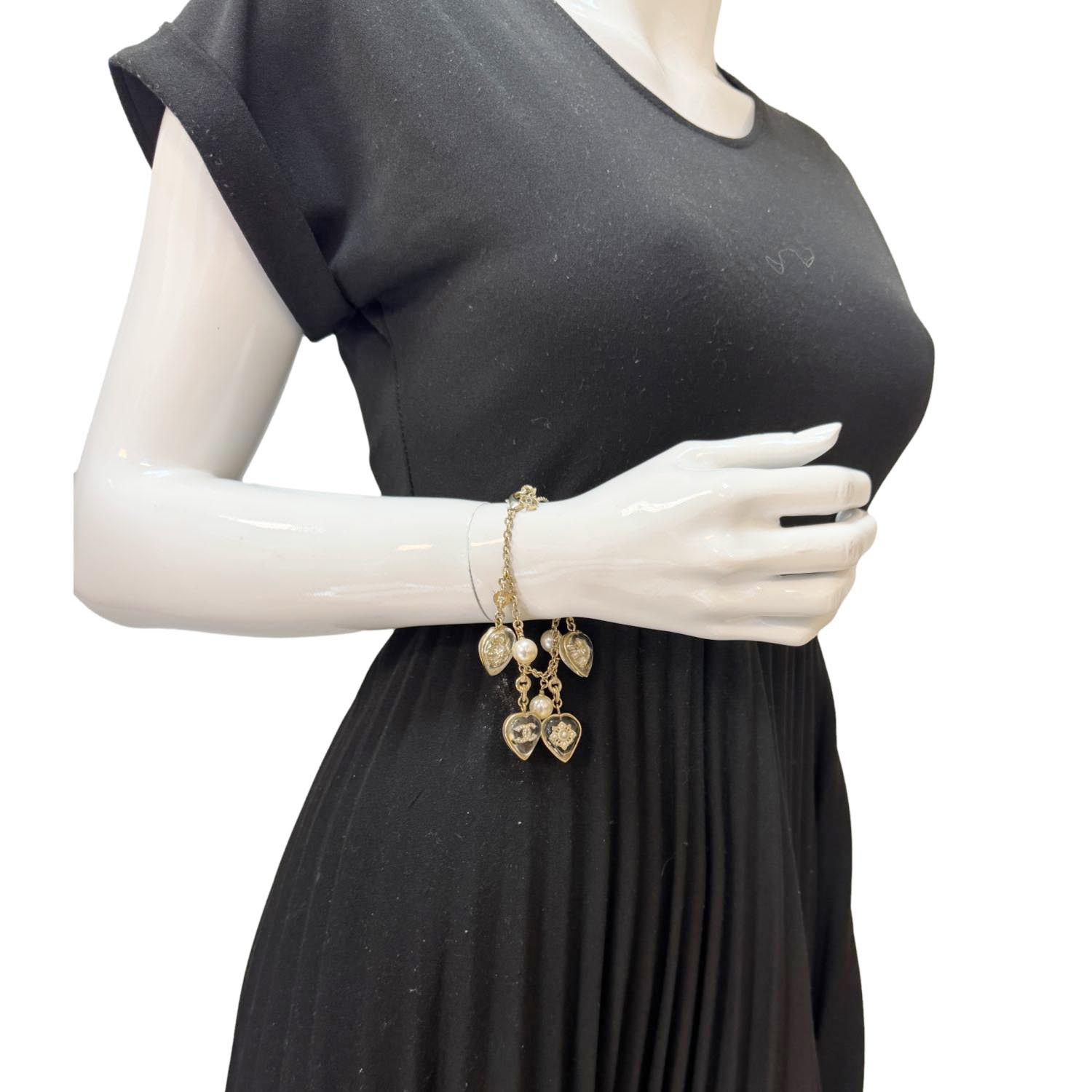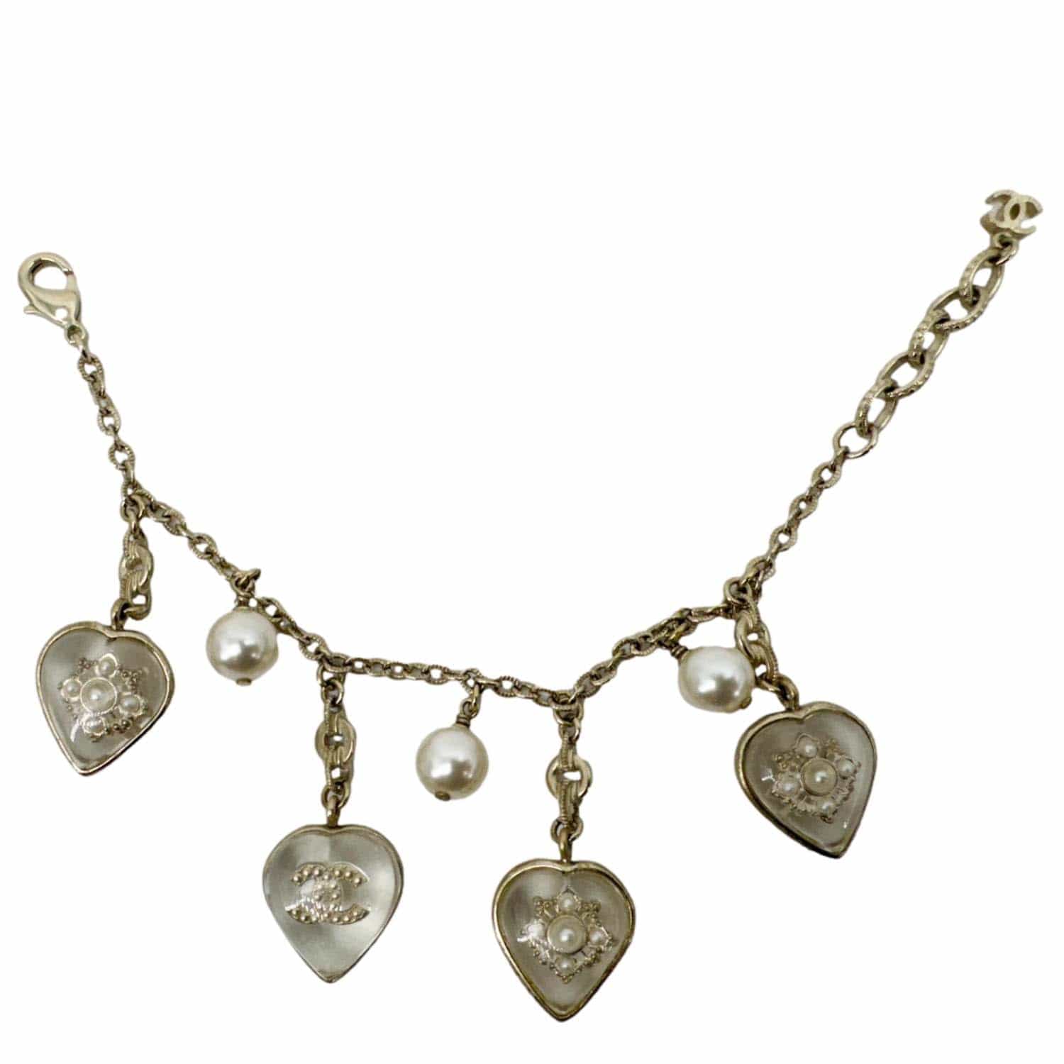 A charming bracelet featuring crystal-studded CC, heart, and pearl charms in off-white tones.