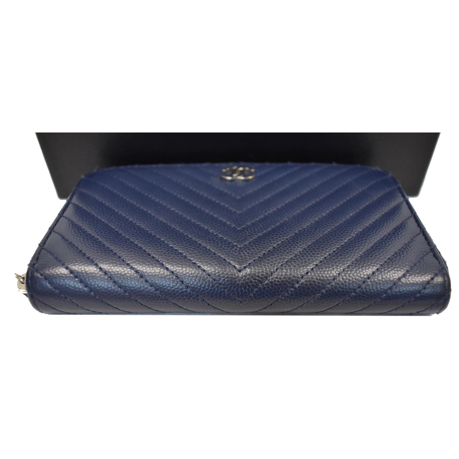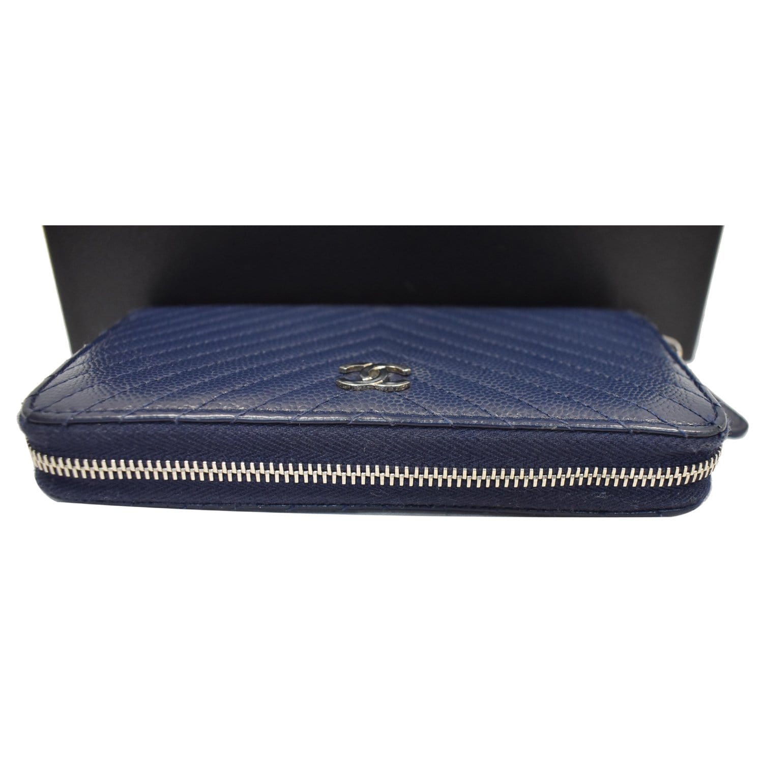 CHANEL Large Gusset Caviar Chevron Quilted Zip Around Wallet Bright Blue